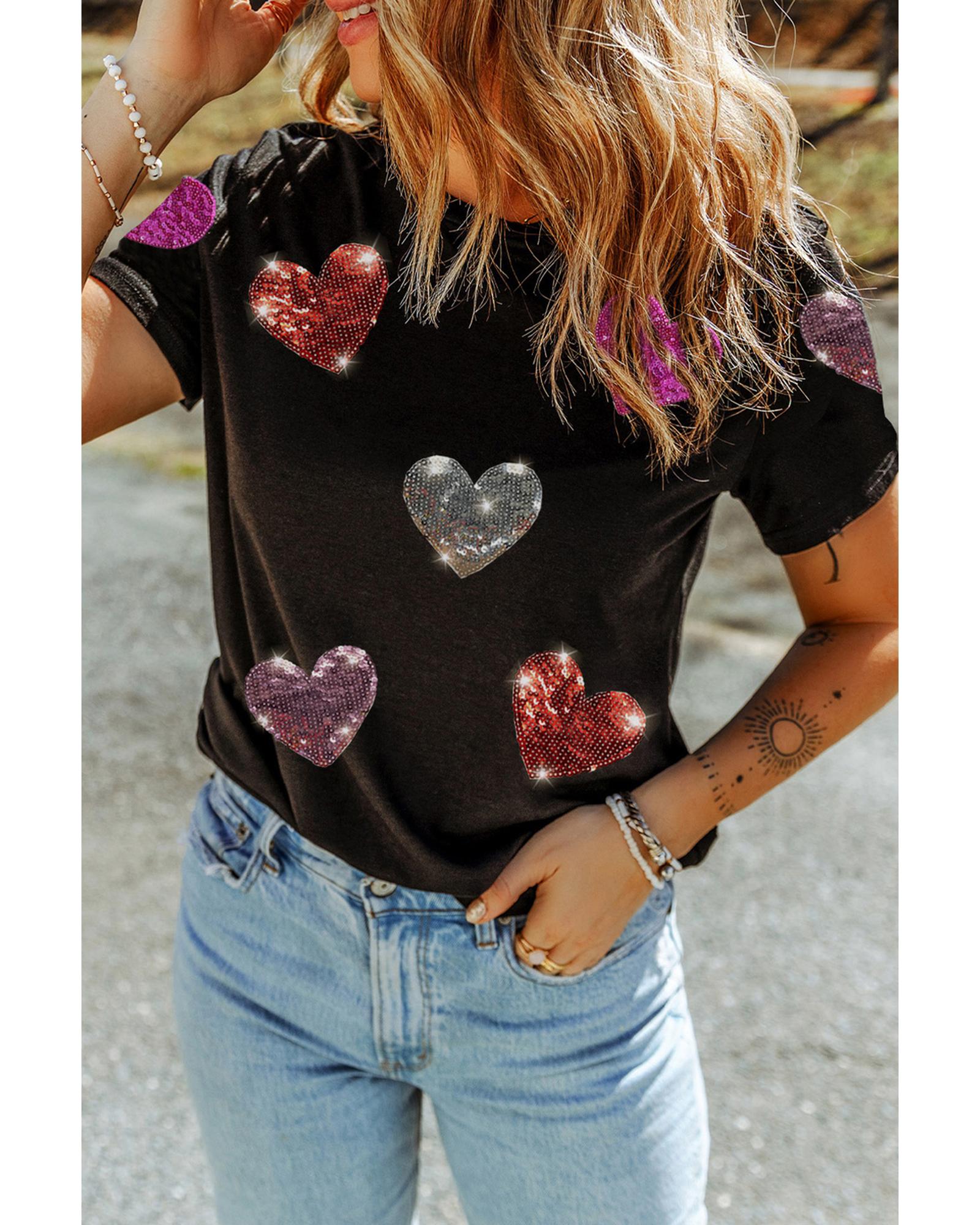 • Black Sequin Heart Patched Pattern Crewneck Valentines Tee