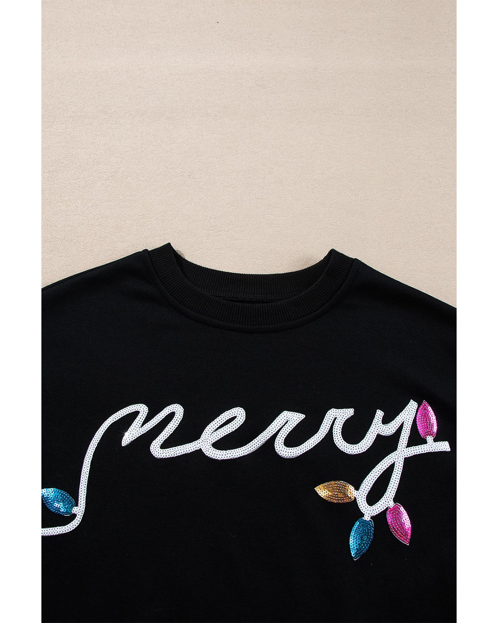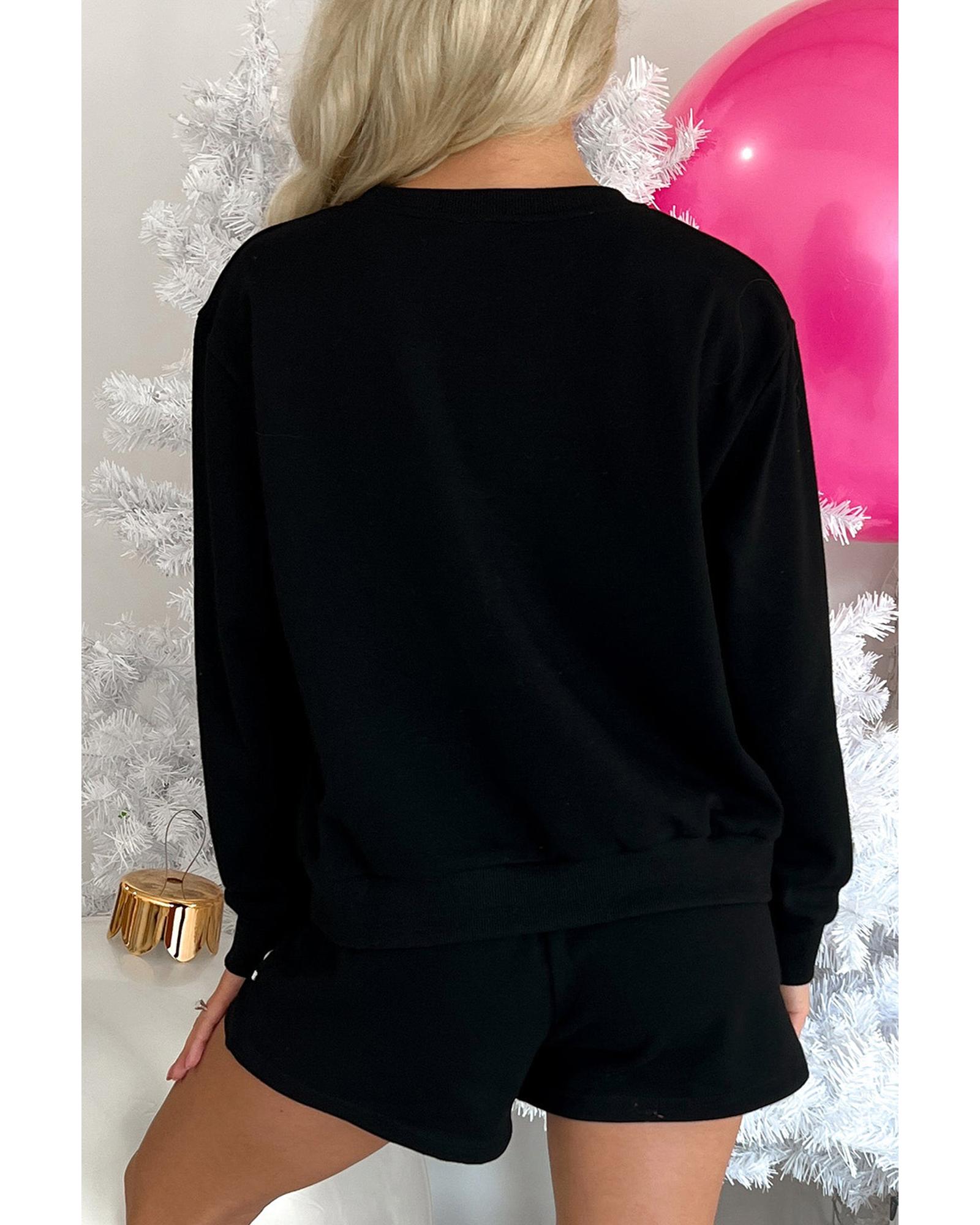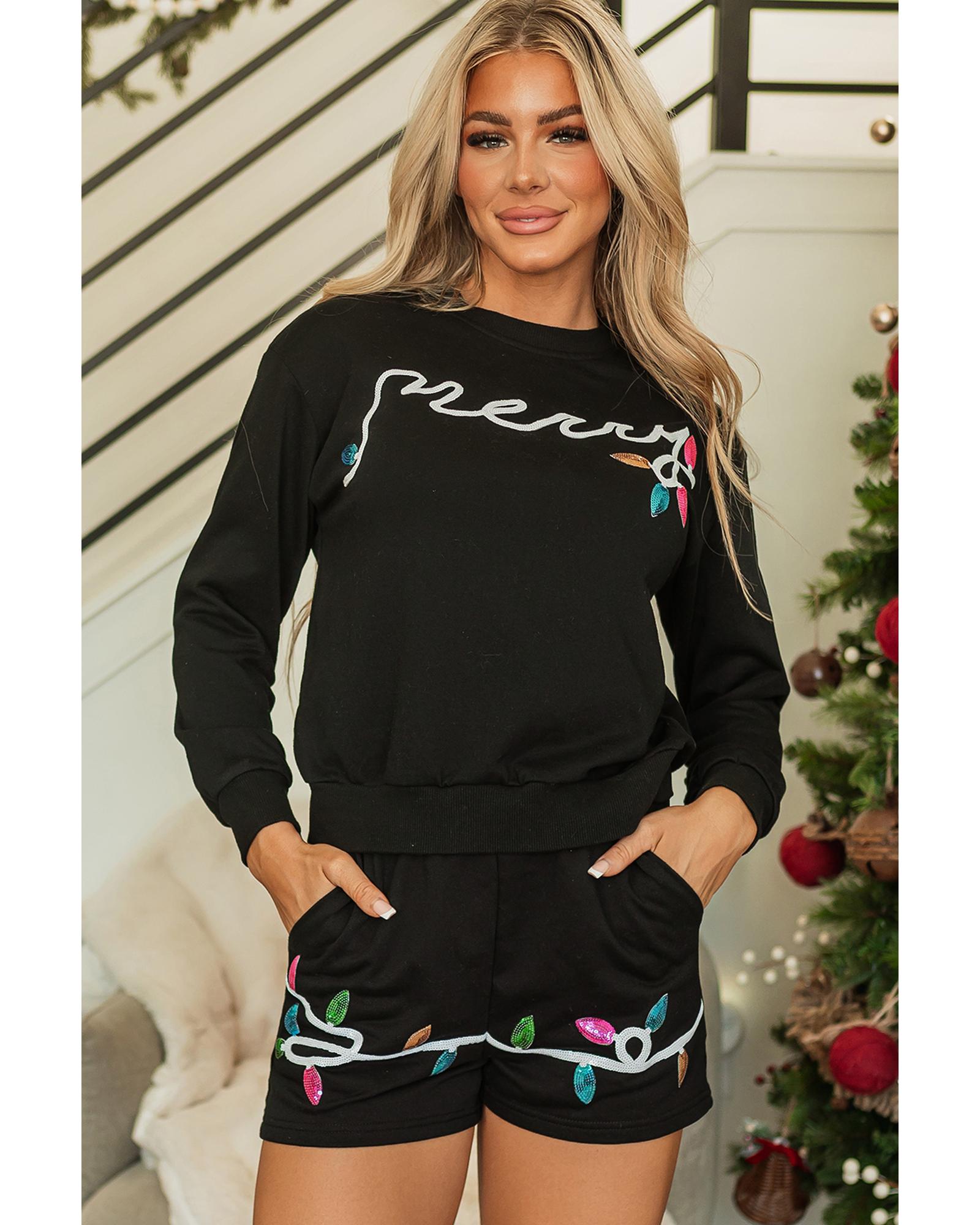 Black Sequin Merry Graphic Pullover and Shorts Outfit – S