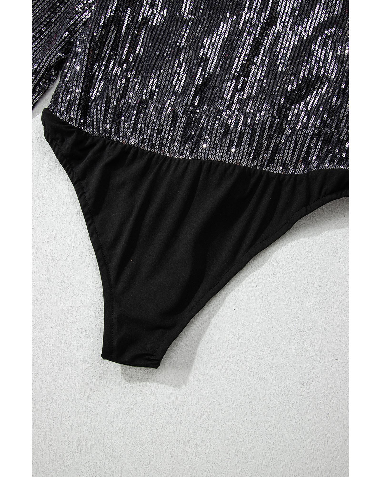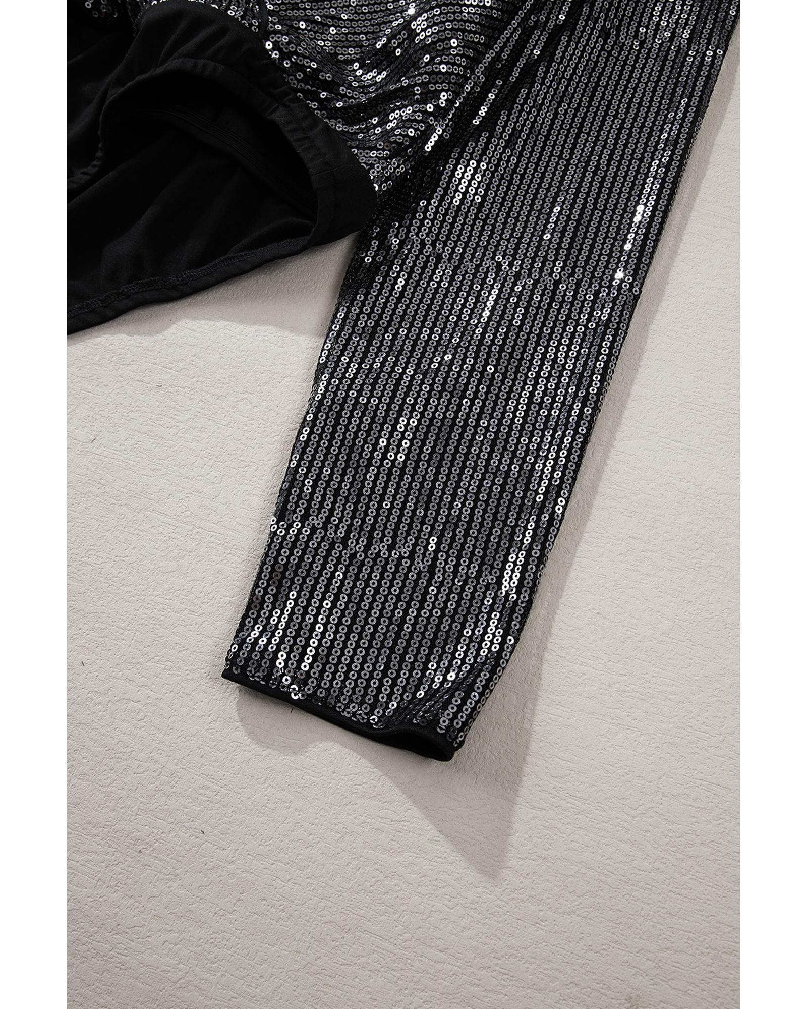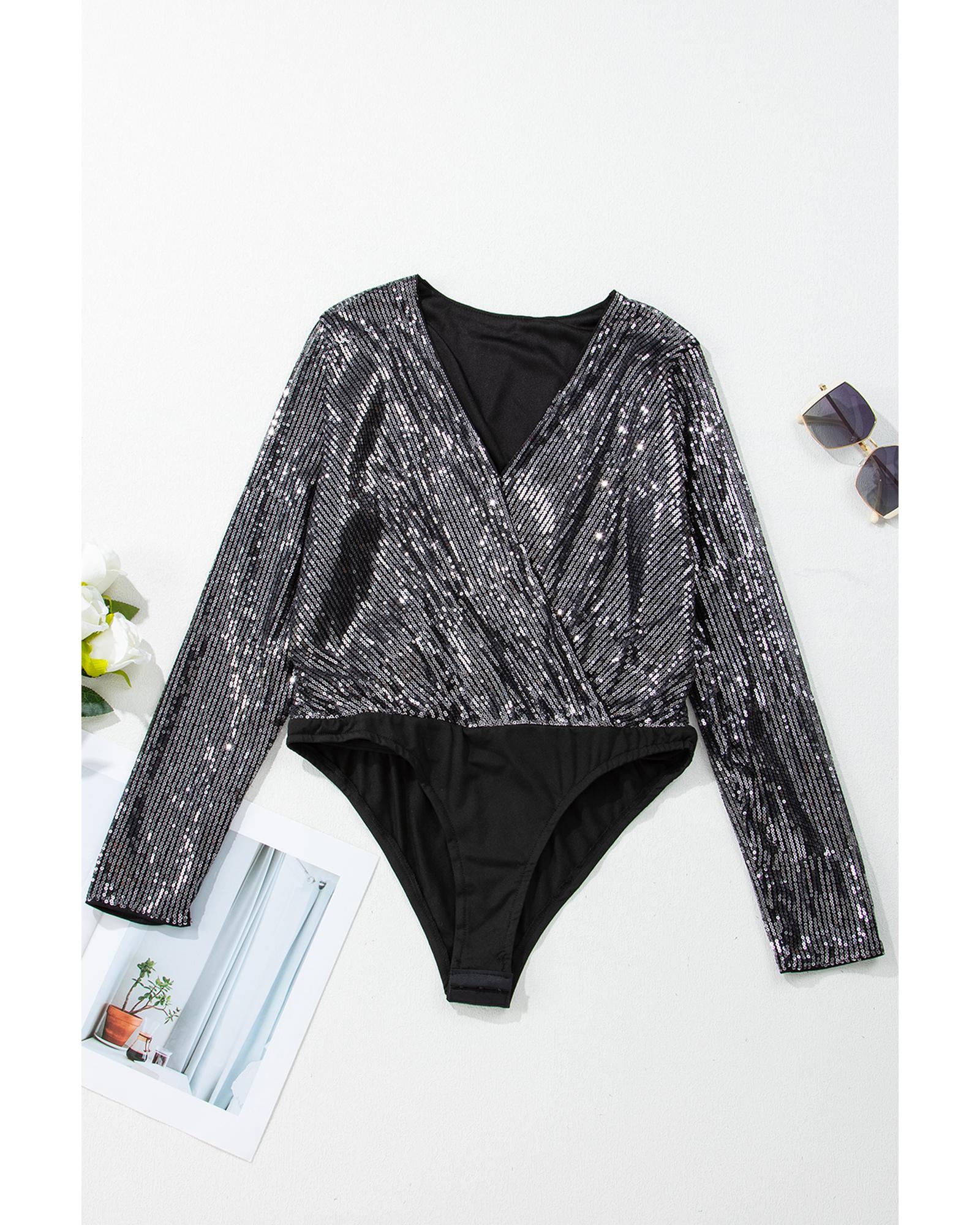 • Black Sequin Mesh Long Sleeve Surplice Neck Bodysuit