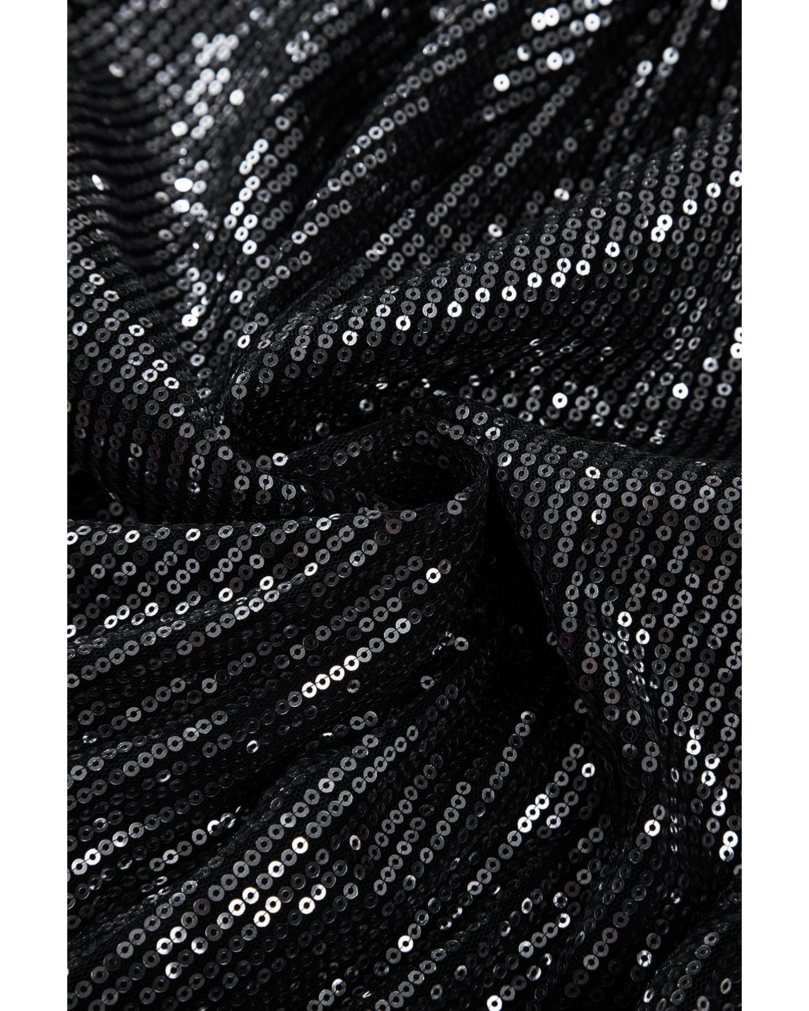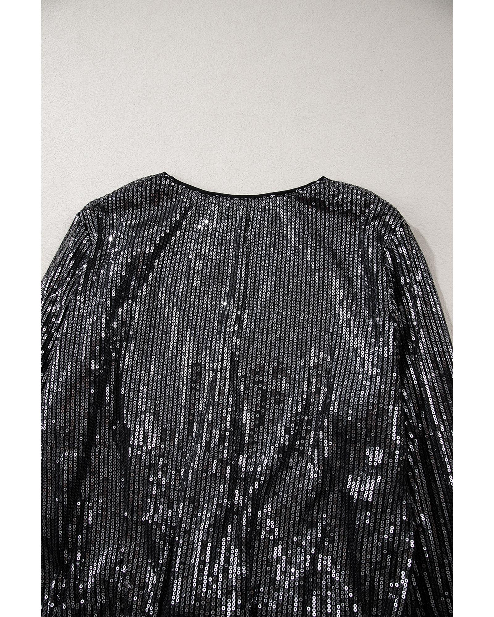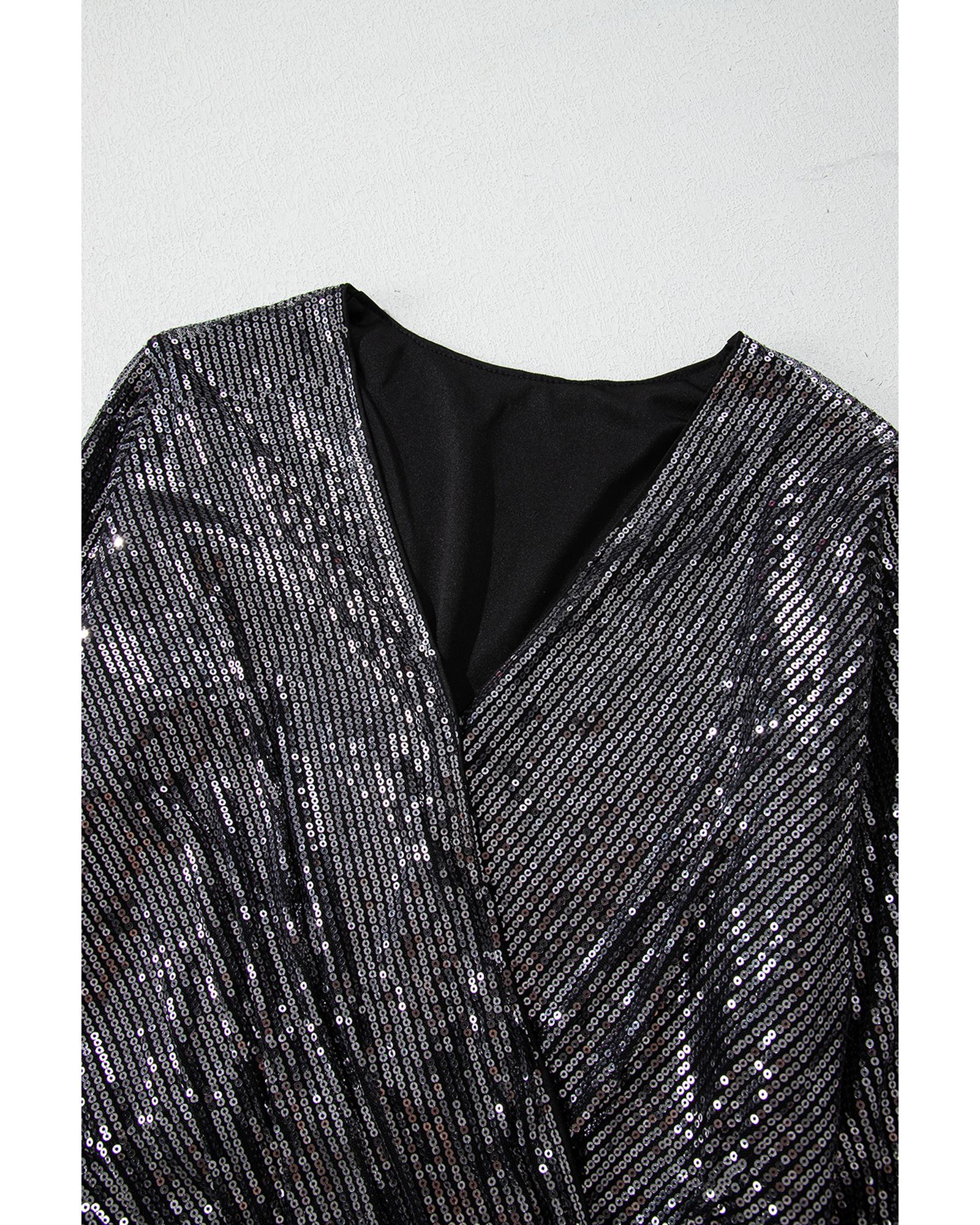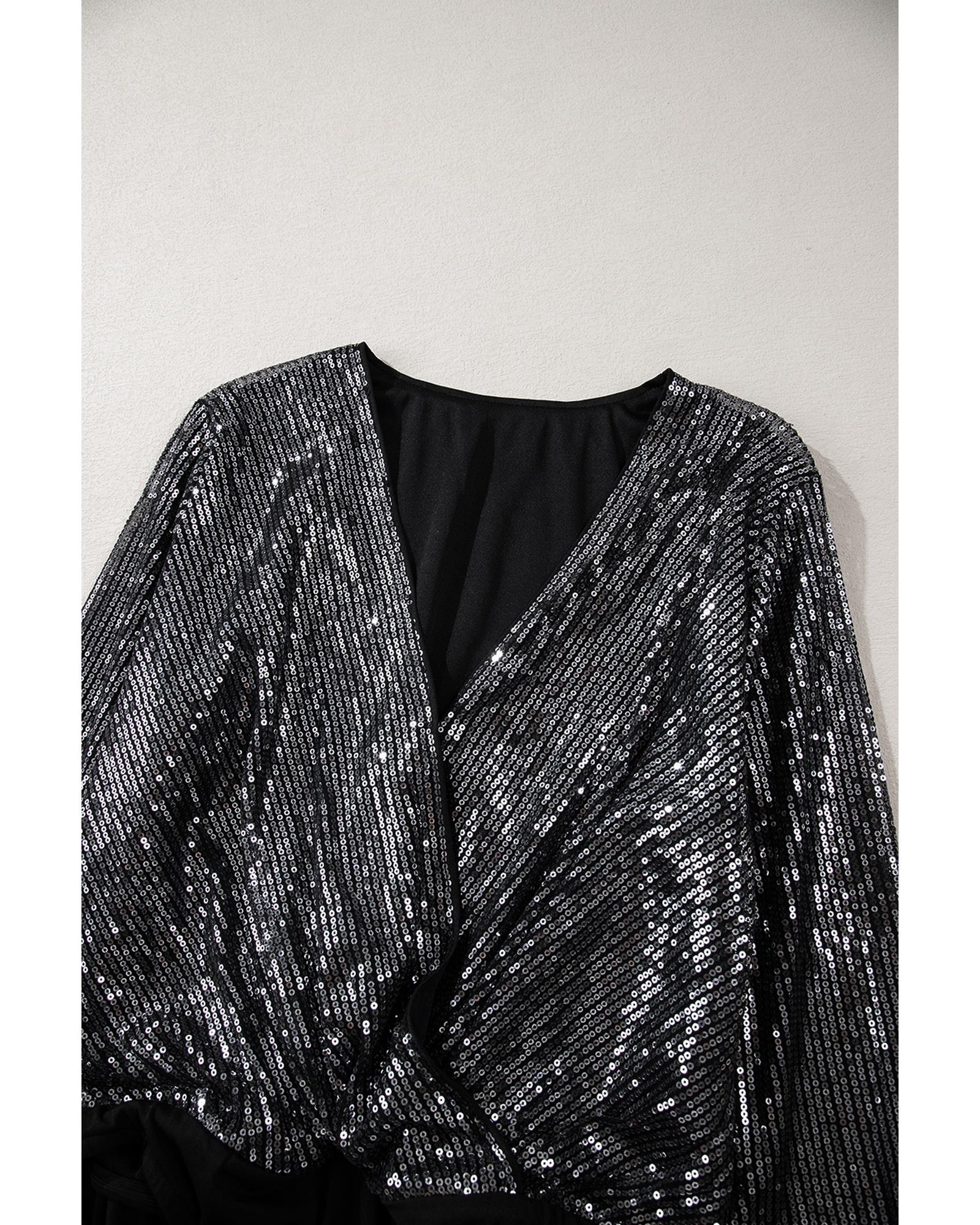 • Black Sequin Mesh Long Sleeve Surplice Neck Bodysuit