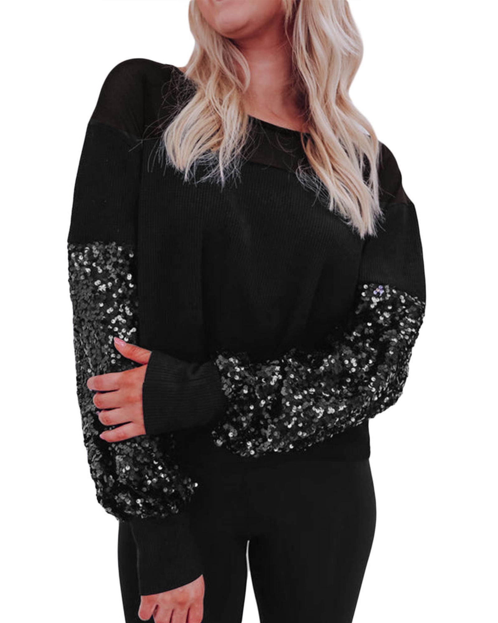 Black Sequin Patchwork Lantern Sleeve Blouse – L