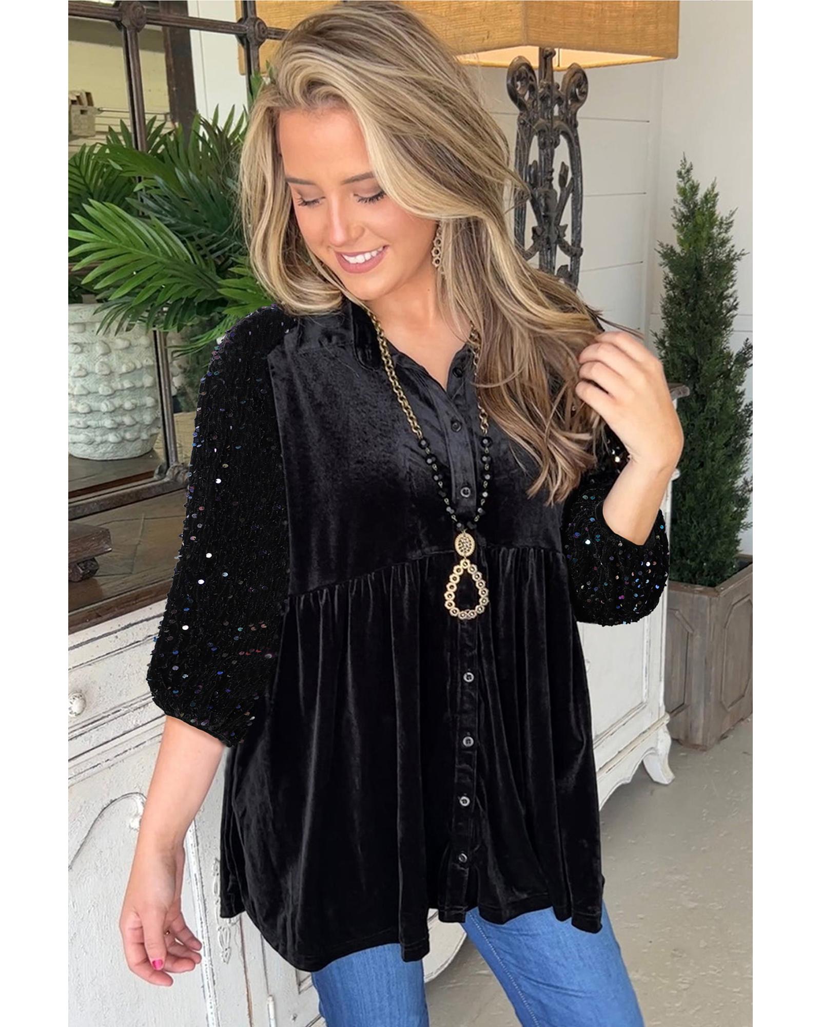 Black Sequin Puff Sleeve Buttoned Velvet Peplum Shirt – S