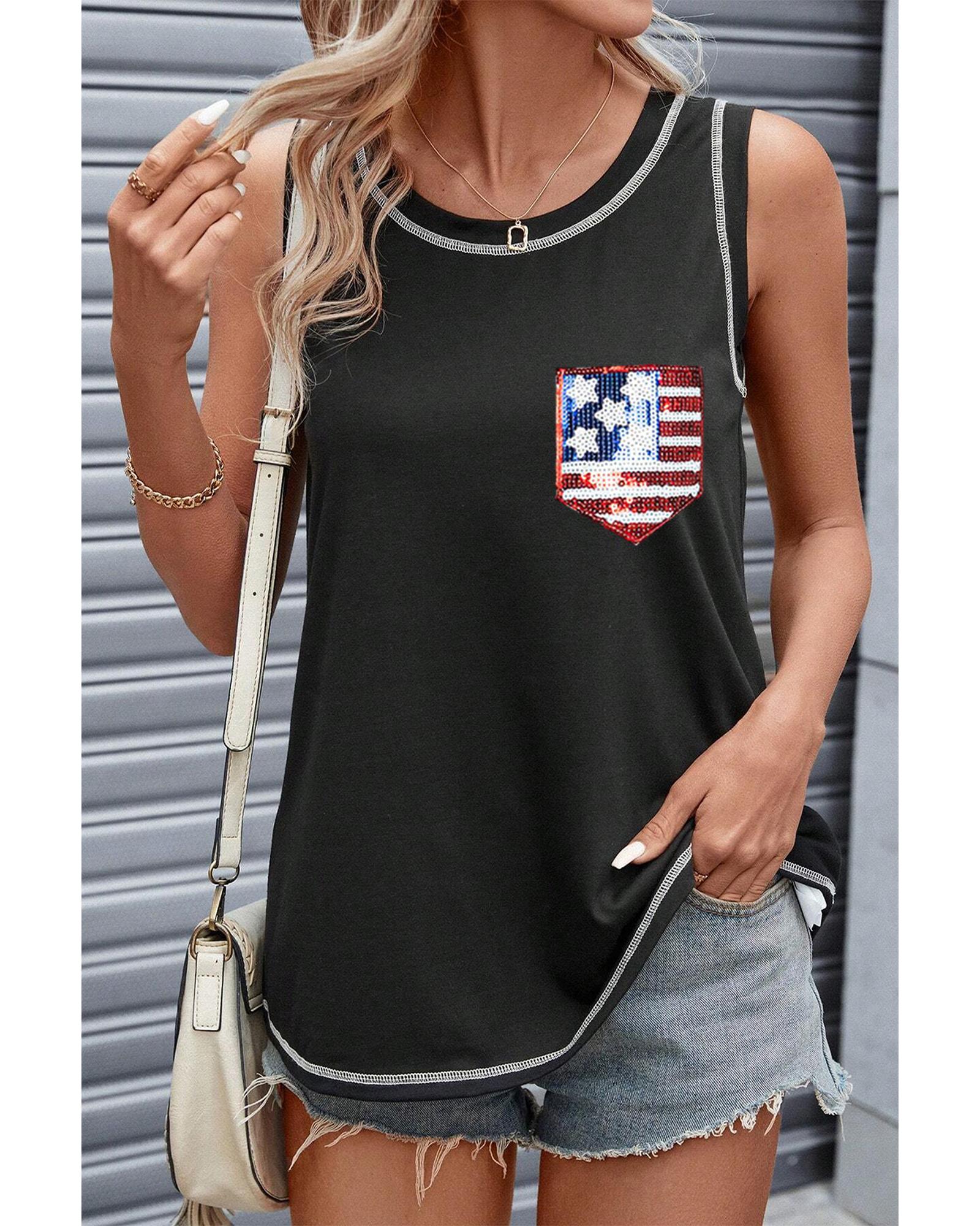 Black Sequined American Flag Patched Exposed Seam Tank Top – S