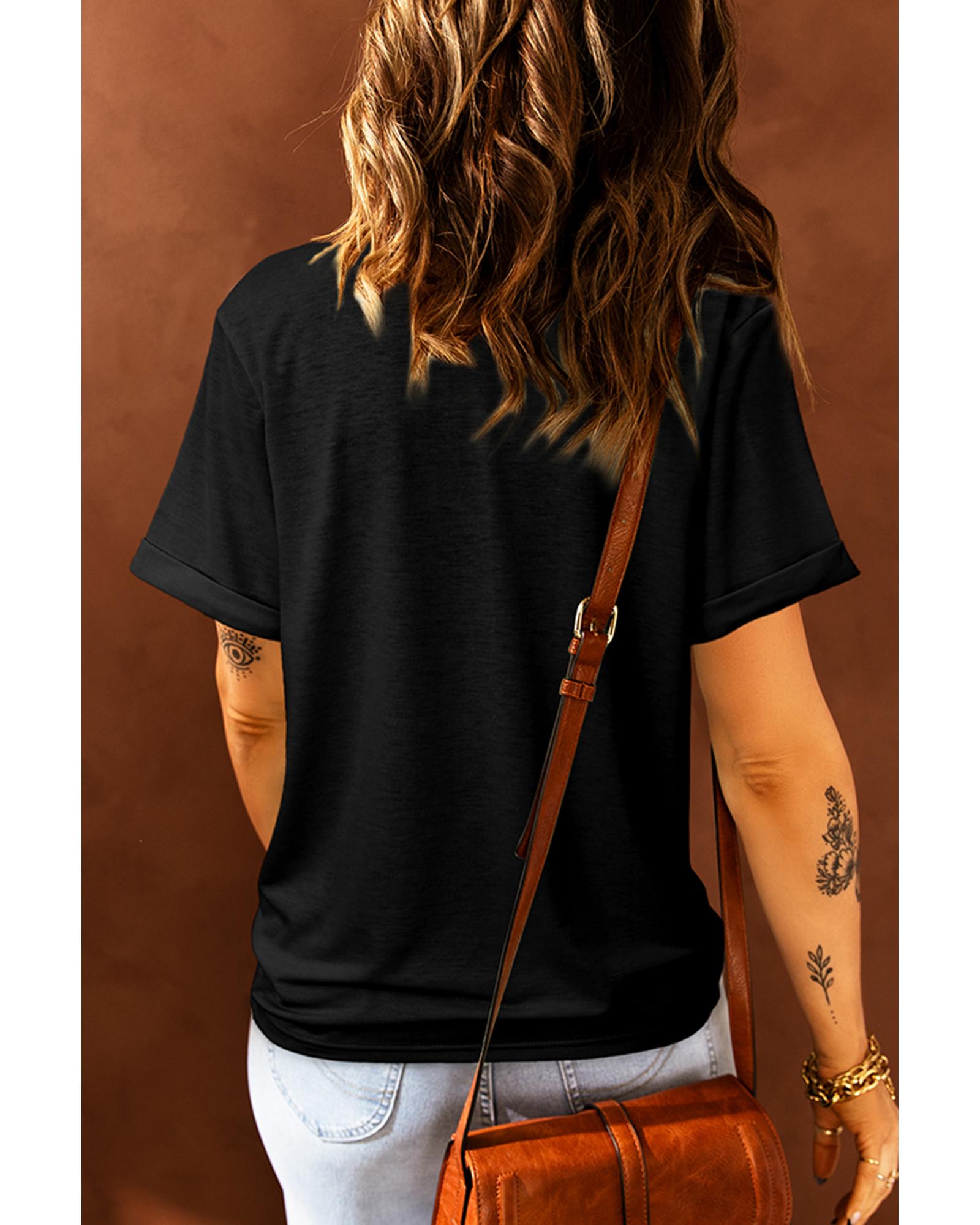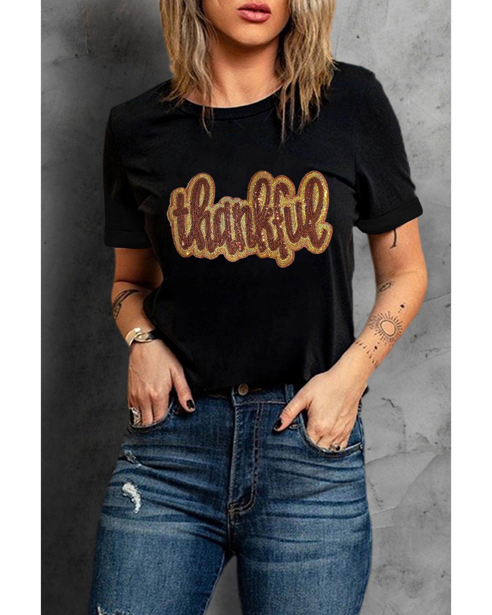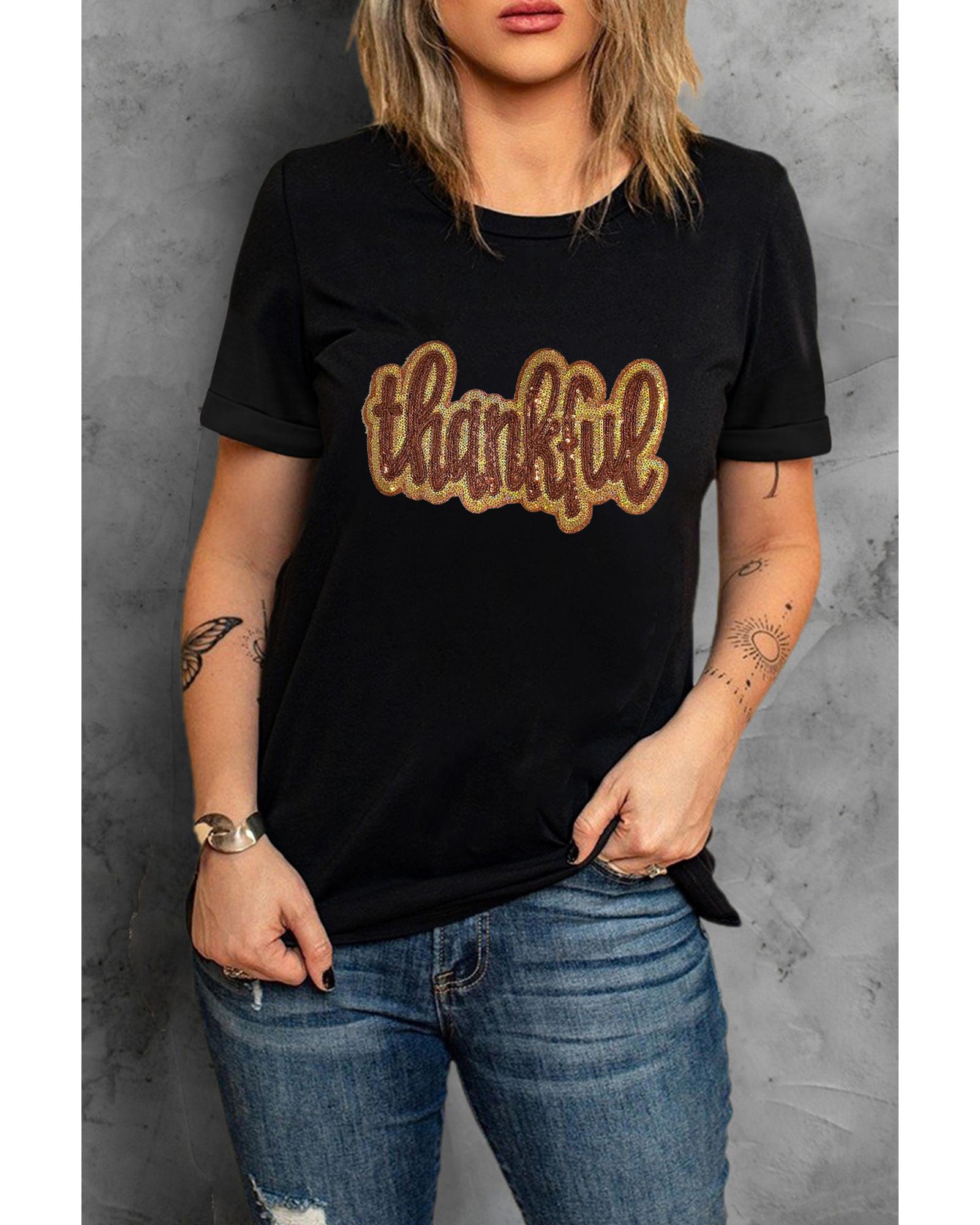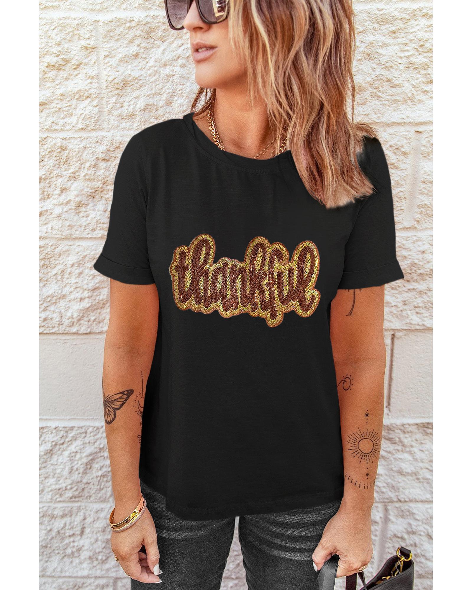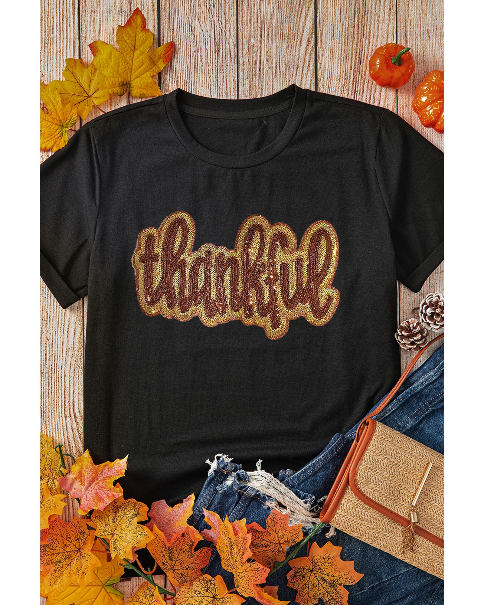 - Black Sequined Thankful Round Neck Graphic Tee