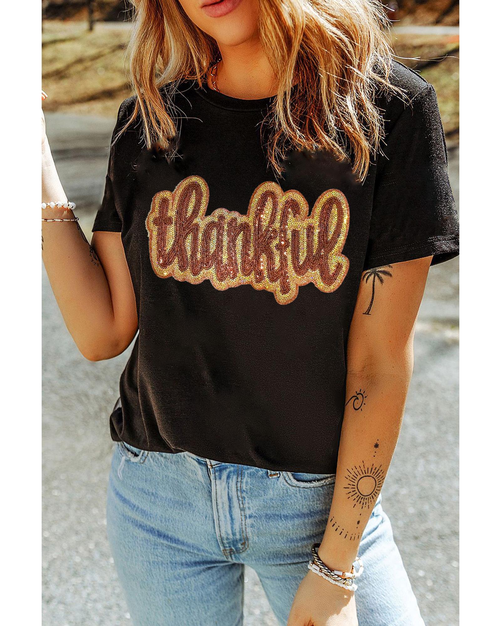 Black Sequined Thankful Round Neck Graphic Tee – XL