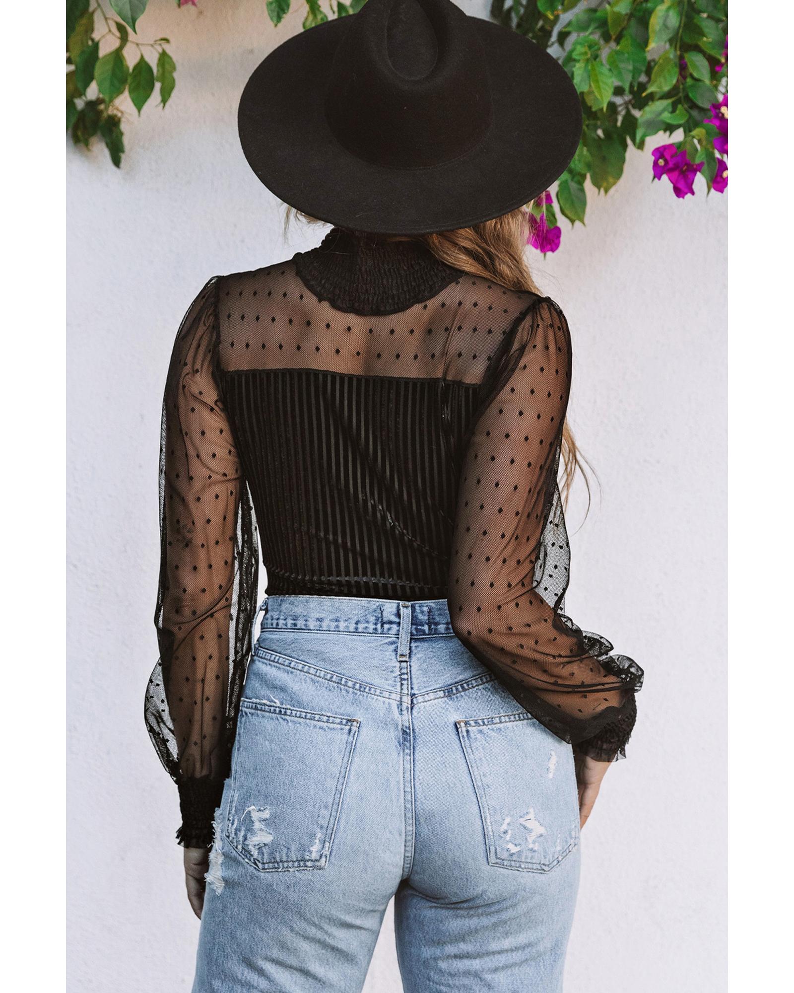 Black Sheer Dotty Long Sleeve Ribbed Velvet Bodysuit – M