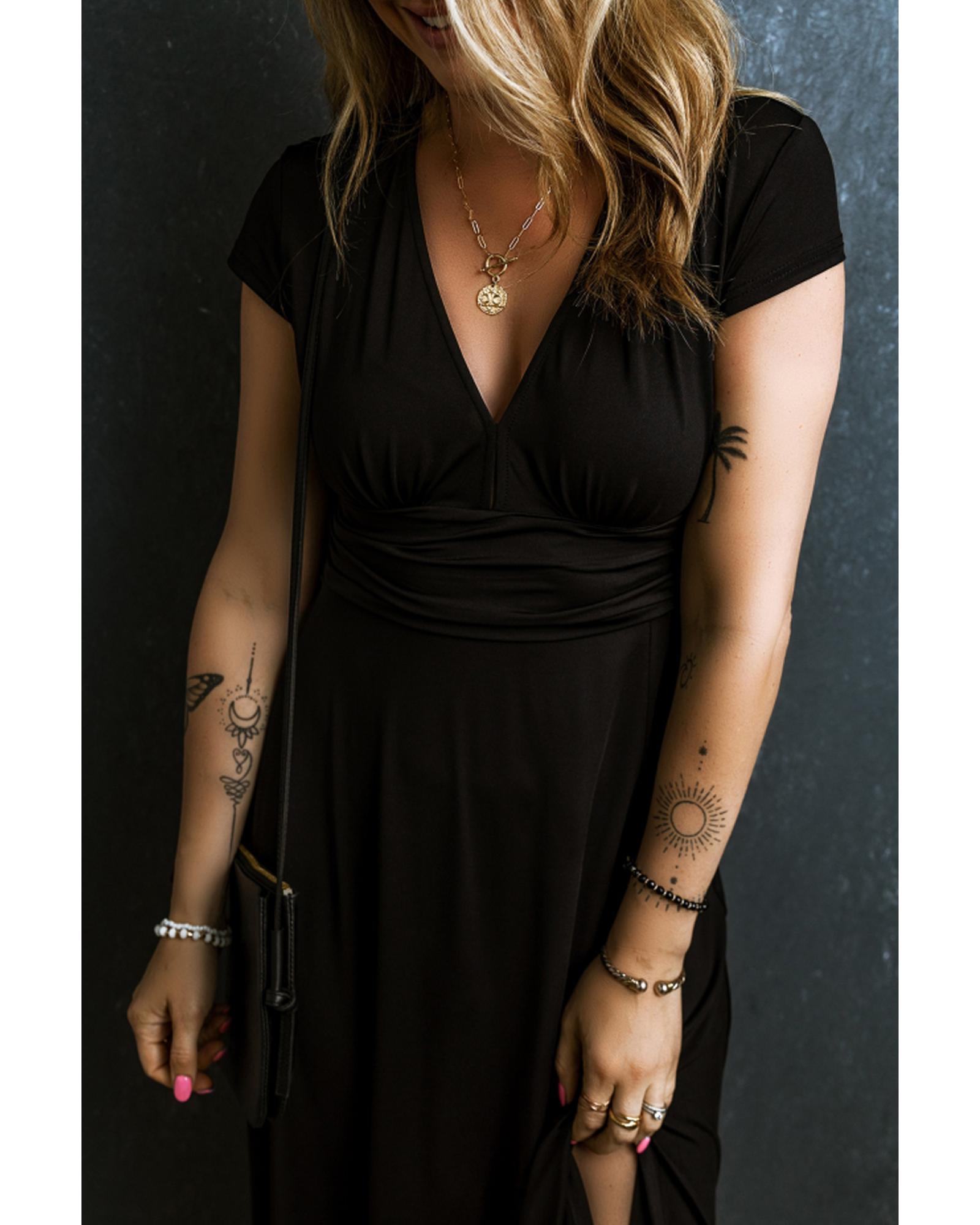 Black Short Sleeve Shirred High Waist V Neck Maxi Dress – M