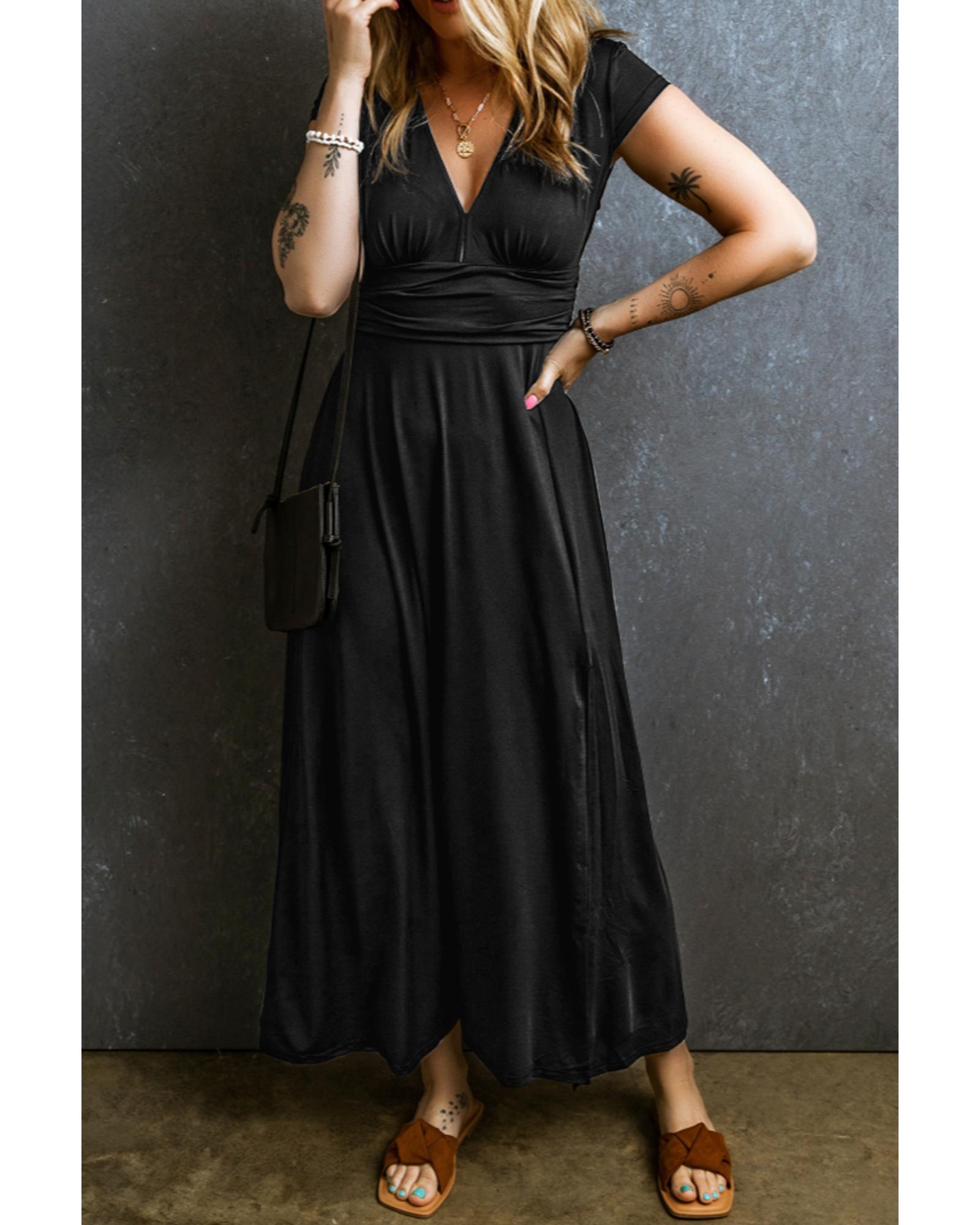 Black Short Sleeve Shirred High Waist V Neck Maxi Dress – XL