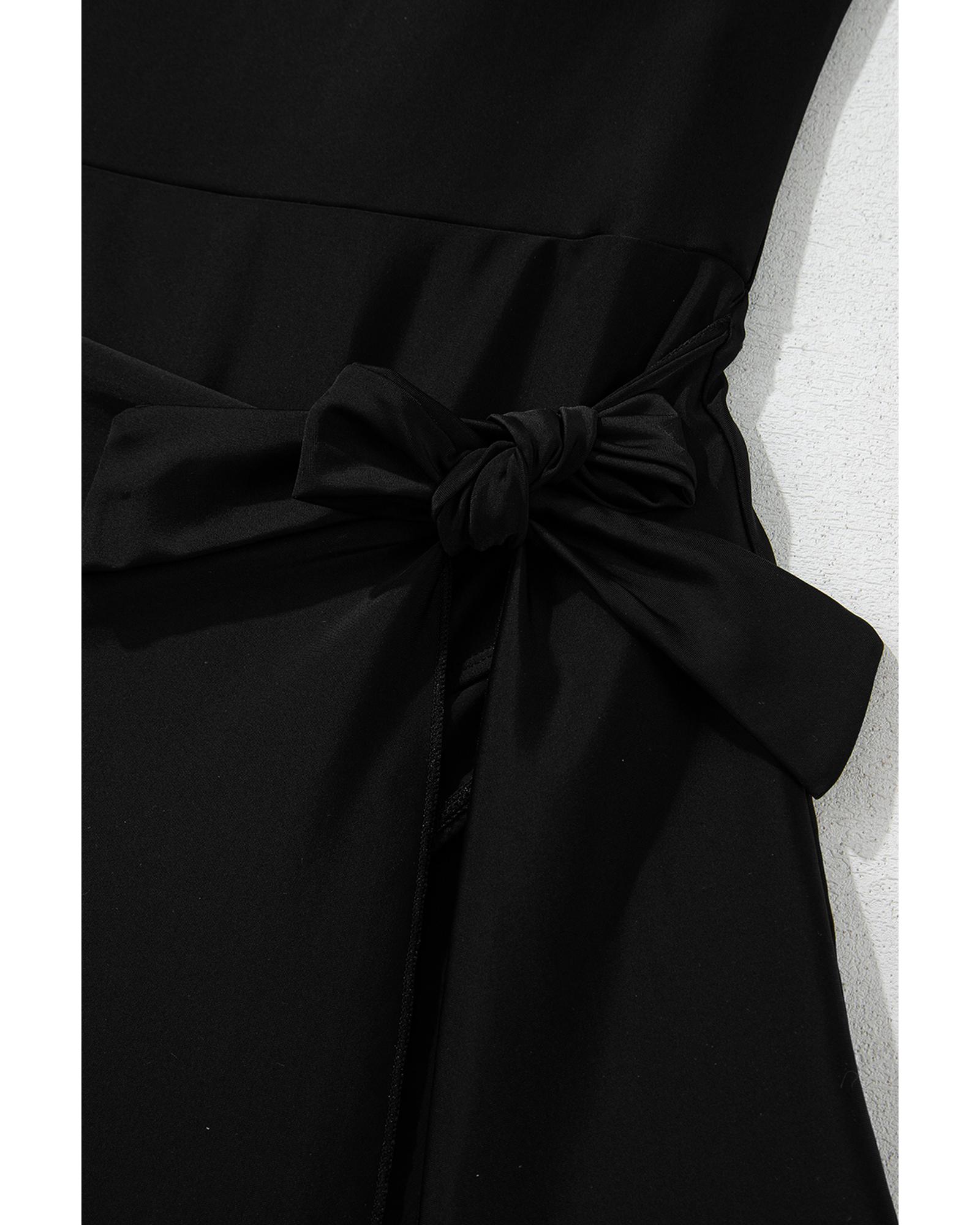 Black Side Tied Waist Square Neck Adjustable Straps A-line One Piece Swim Dress - S