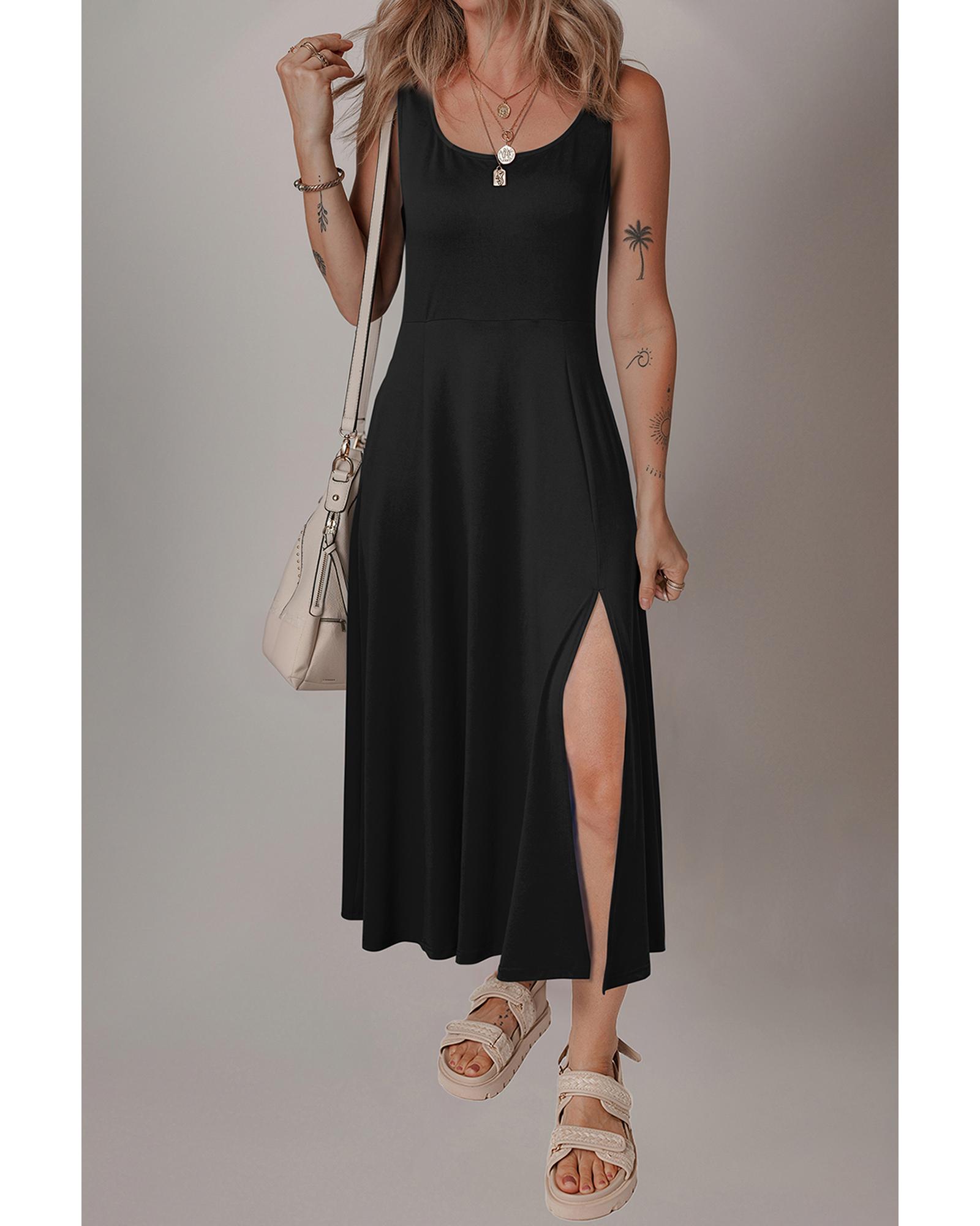 Black Sleeveless Scoop Neck Flared Split Midi Dress – XL