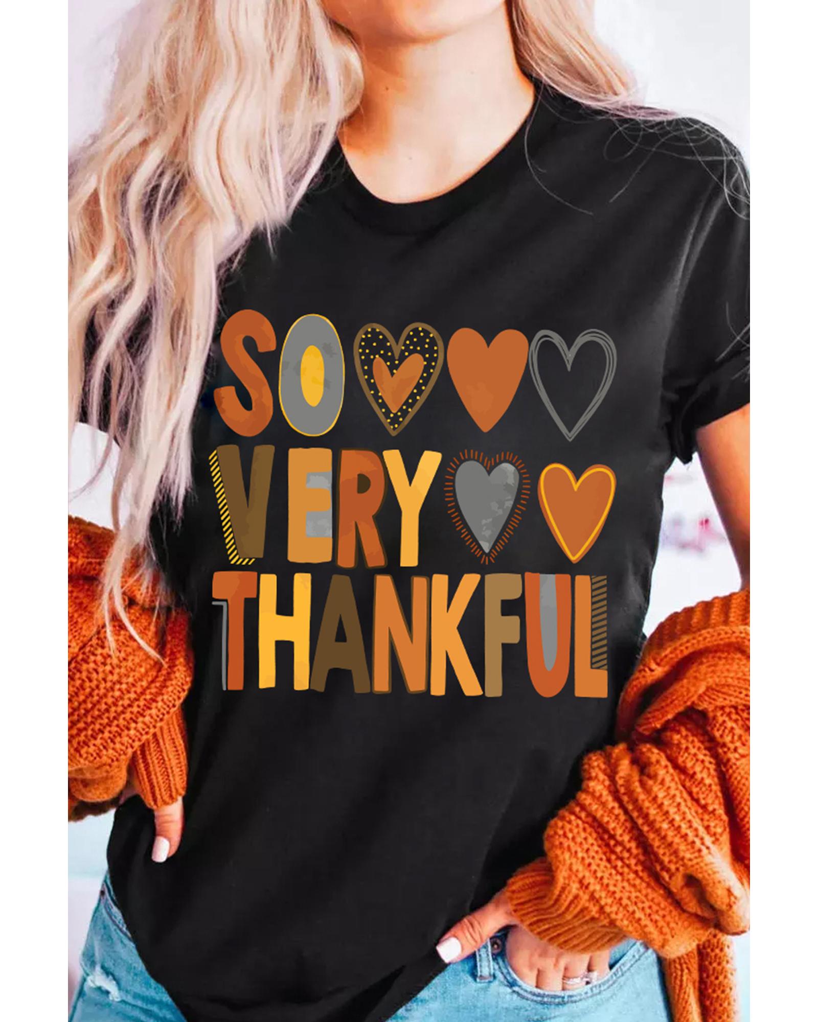 Black So Very Thankful Heart Printed Crewneck Thanksgiving T Shirt – M