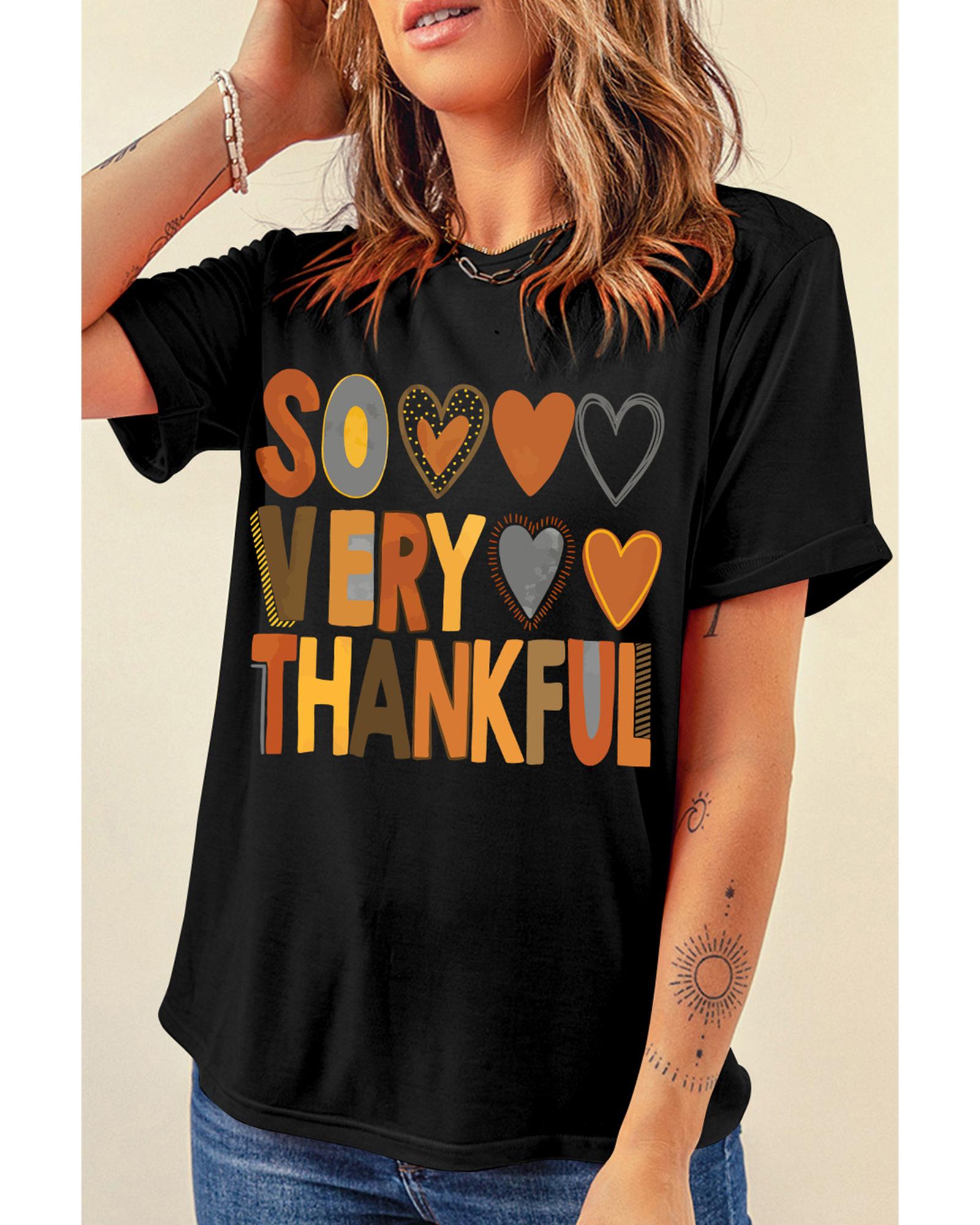 Black So Very Thankful Heart Printed Crewneck Thanksgiving T Shirt – S