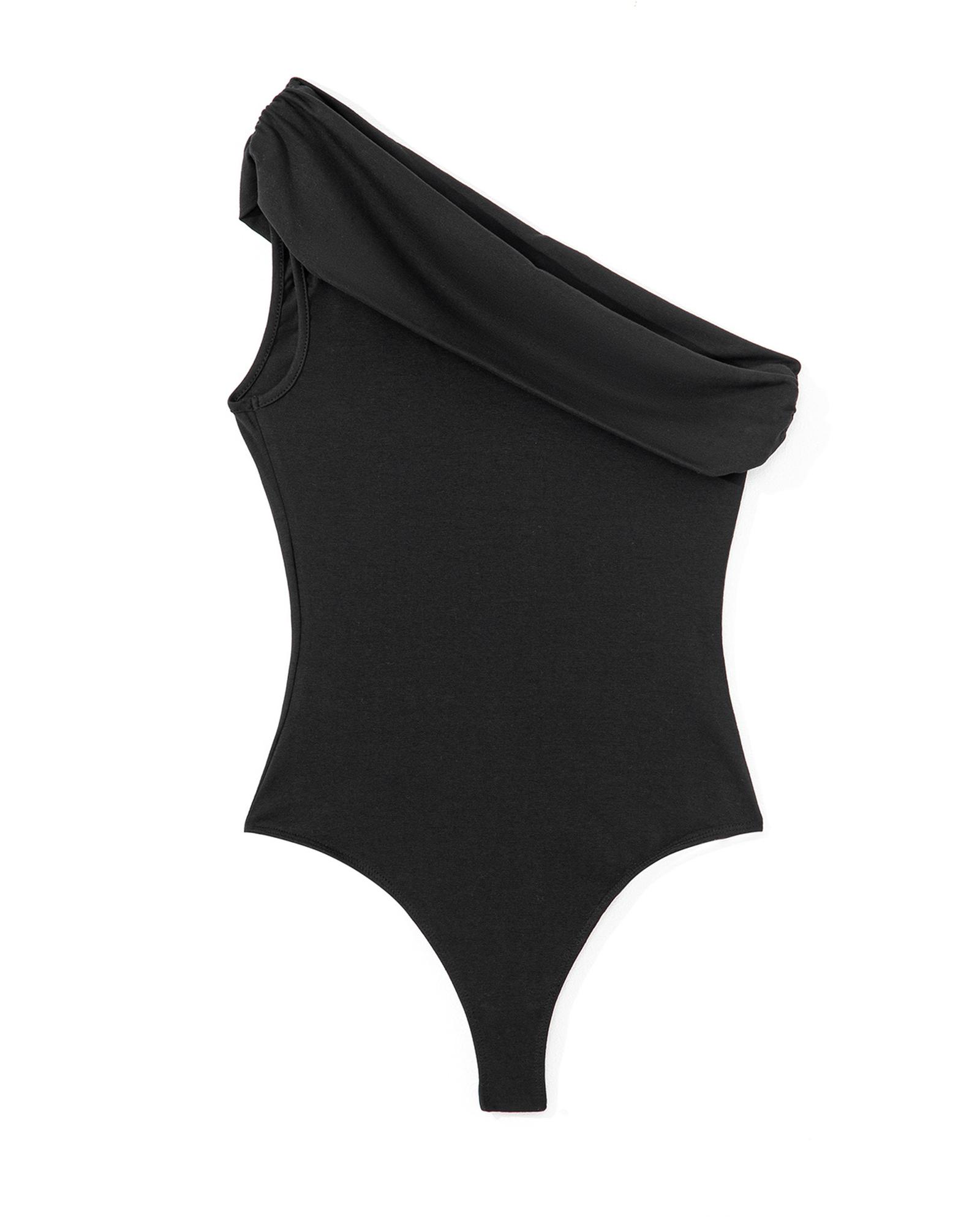 Black Solid Color Pleated One Shoulder Bodysuit – L