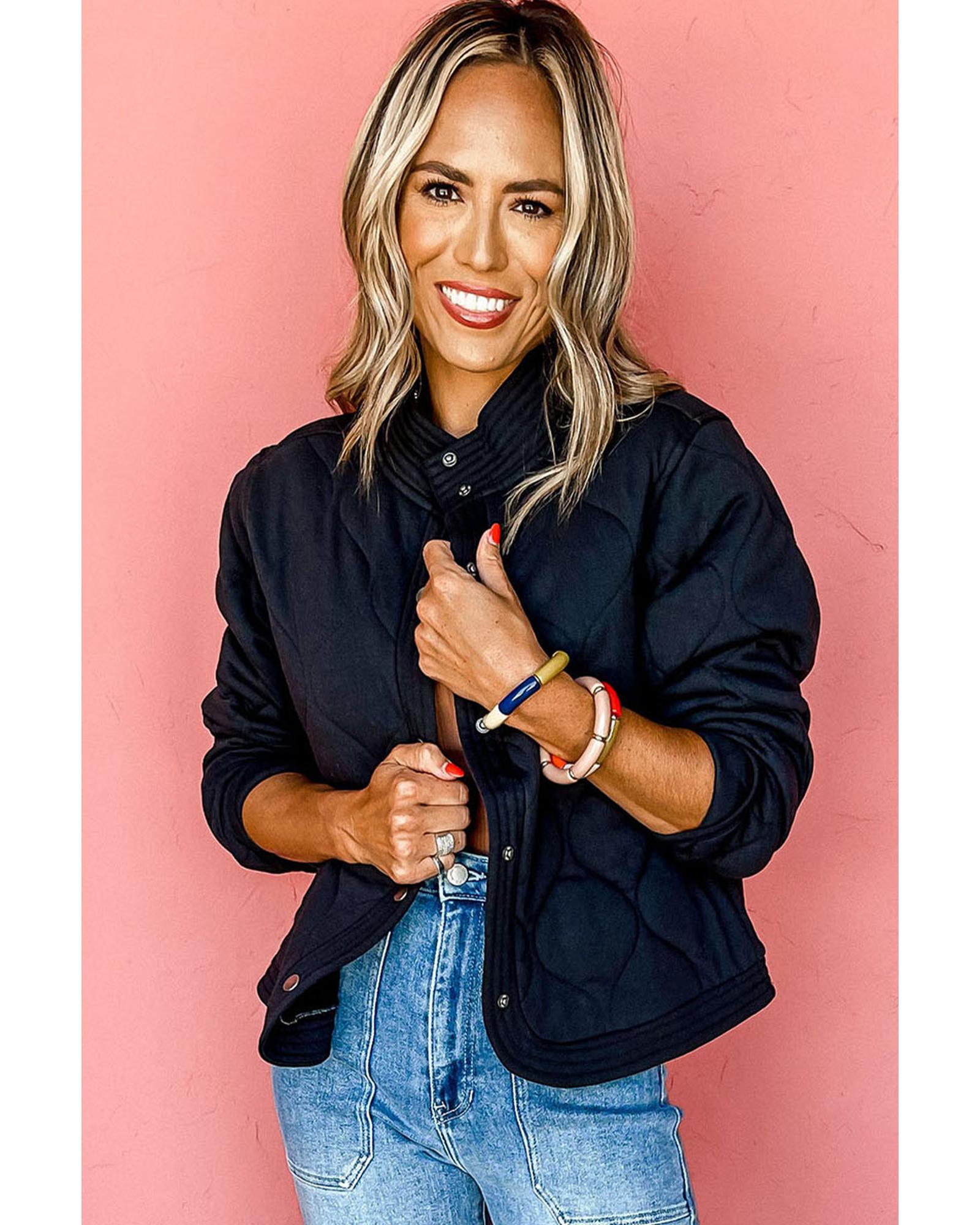 Black Checkered Side Pockets Collared Buttoned Fleece Jacket - S