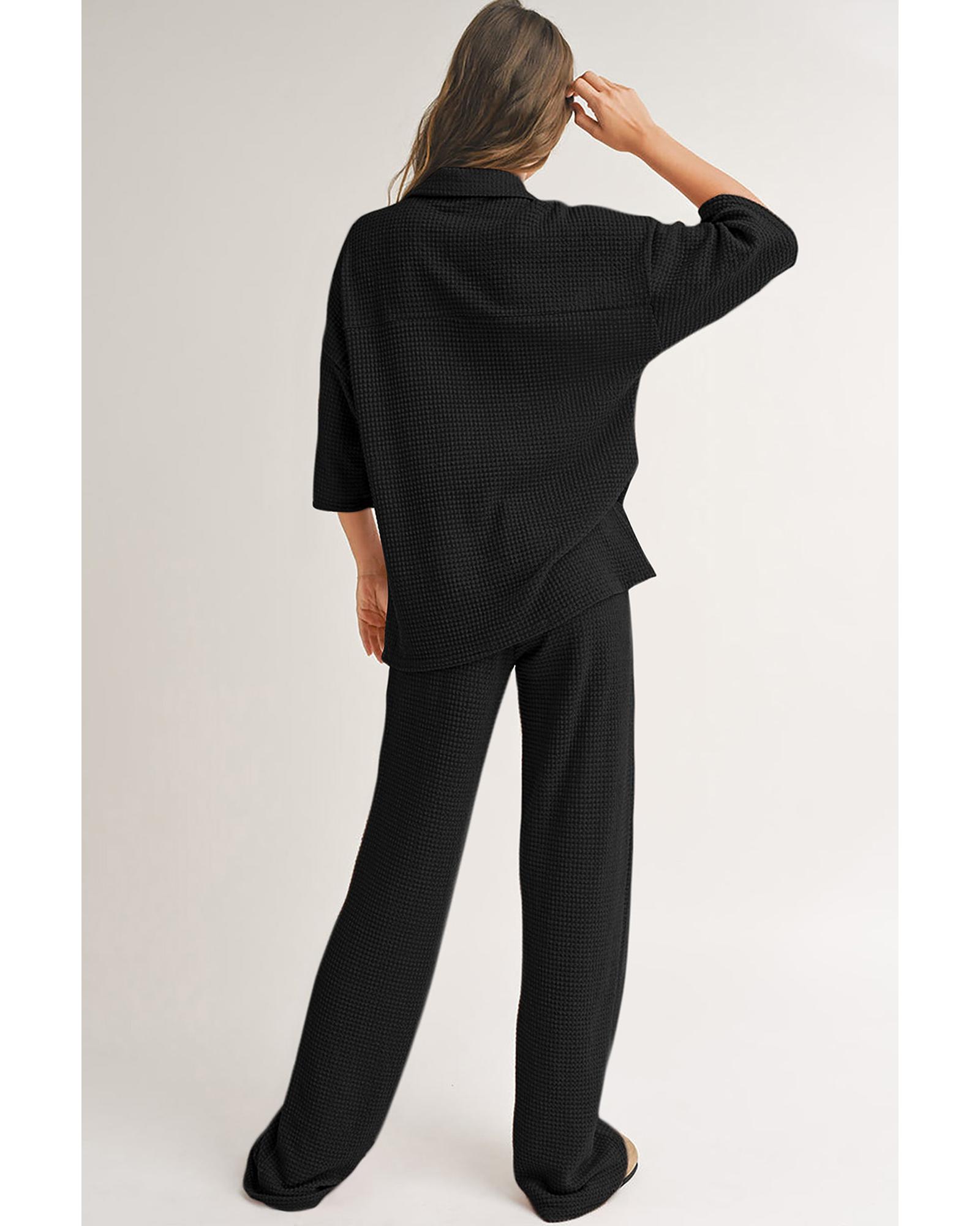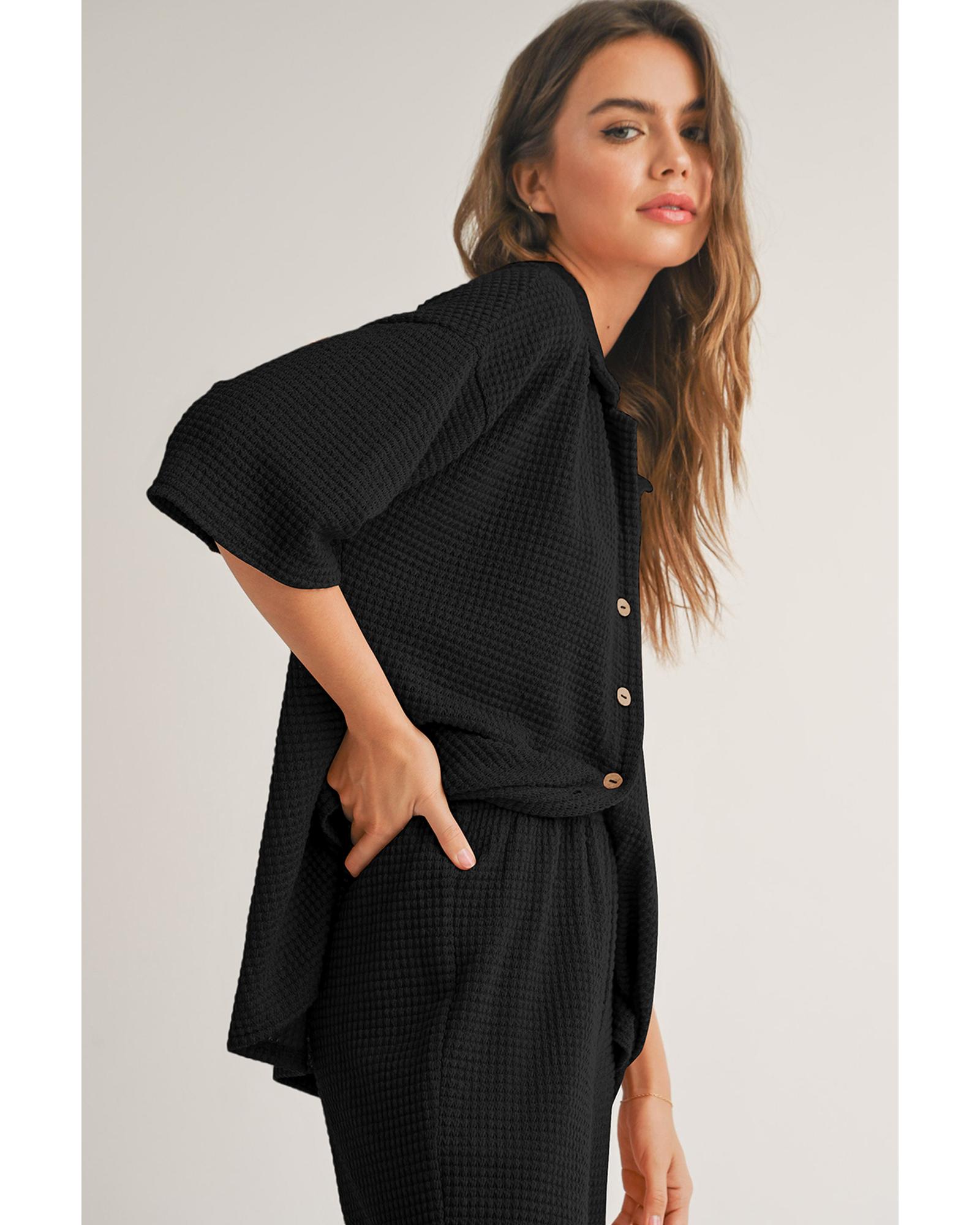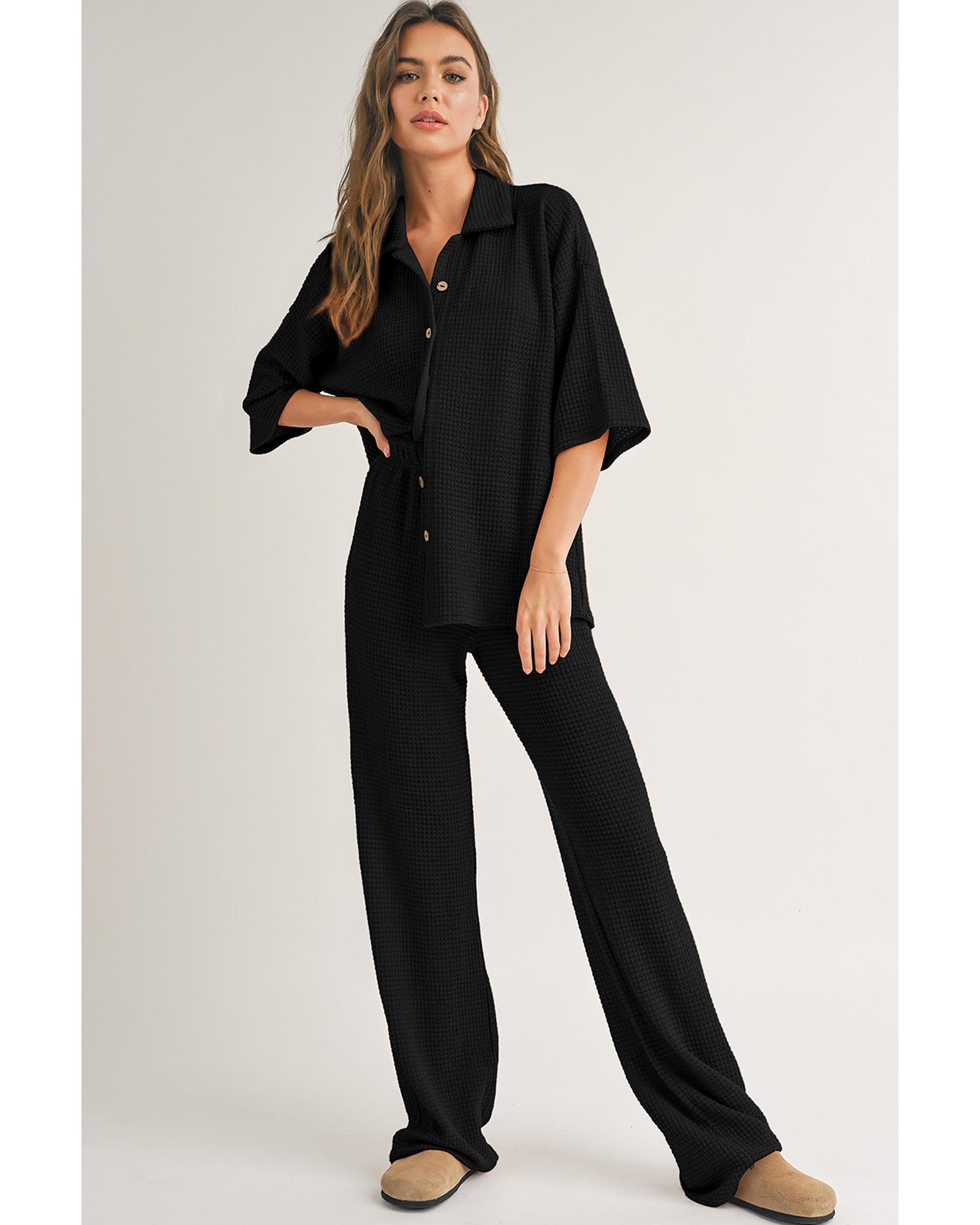 Black Solid Color Textured Buttoned Shirt and Casual Pants Set – L