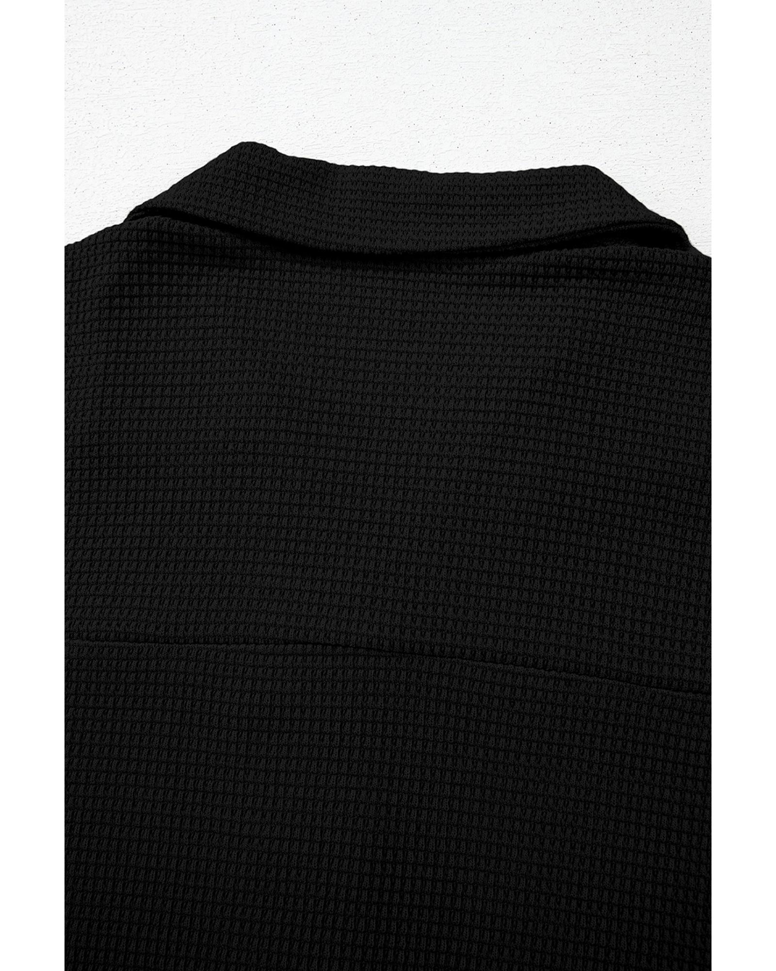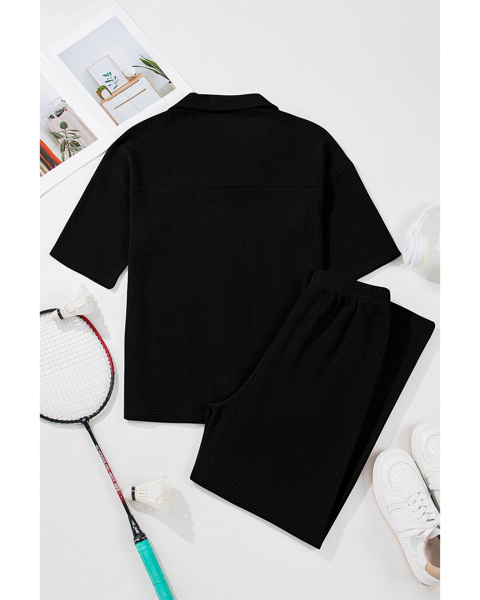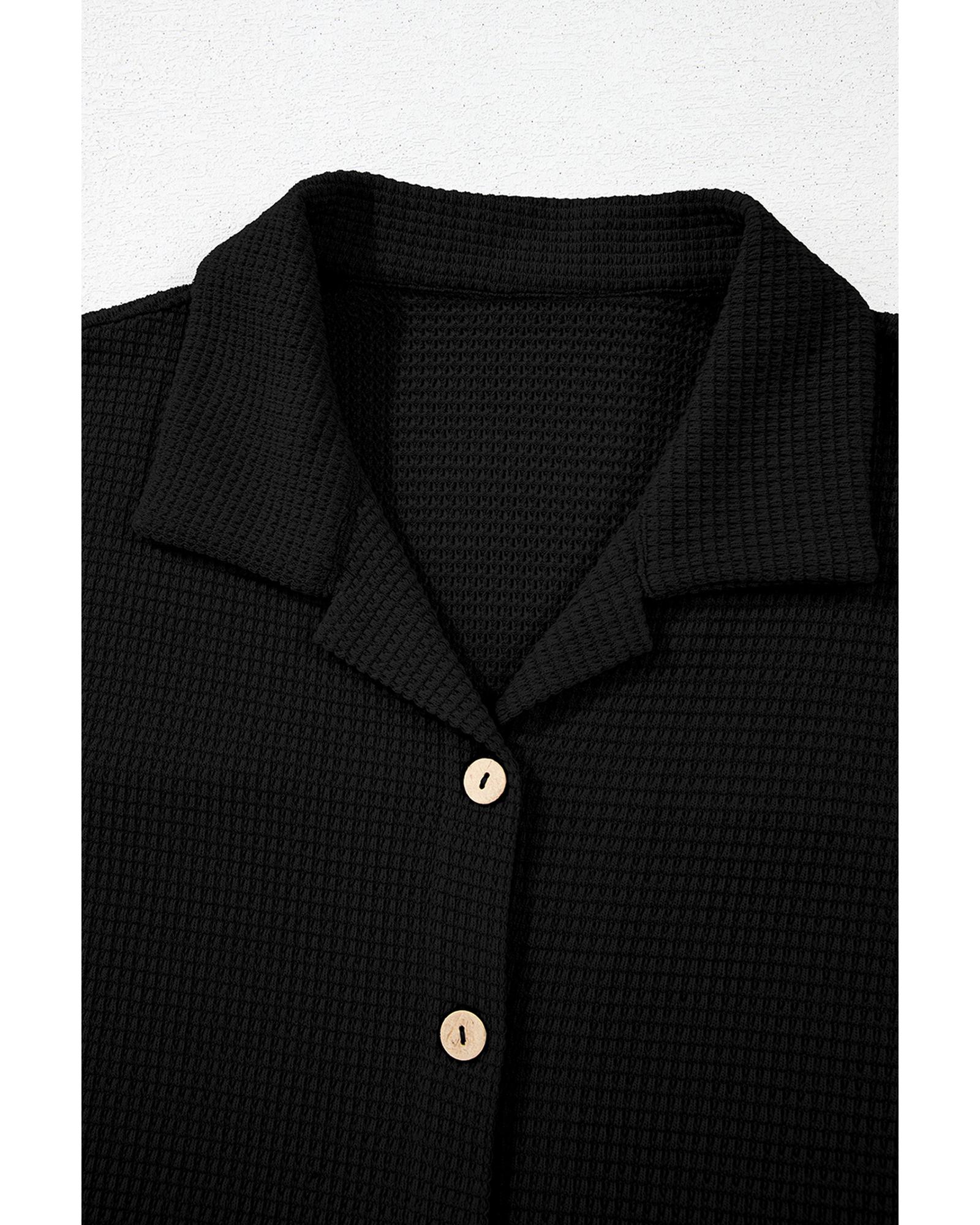Black Solid Color Textured Buttoned Shirt and Casual Pants Set – L