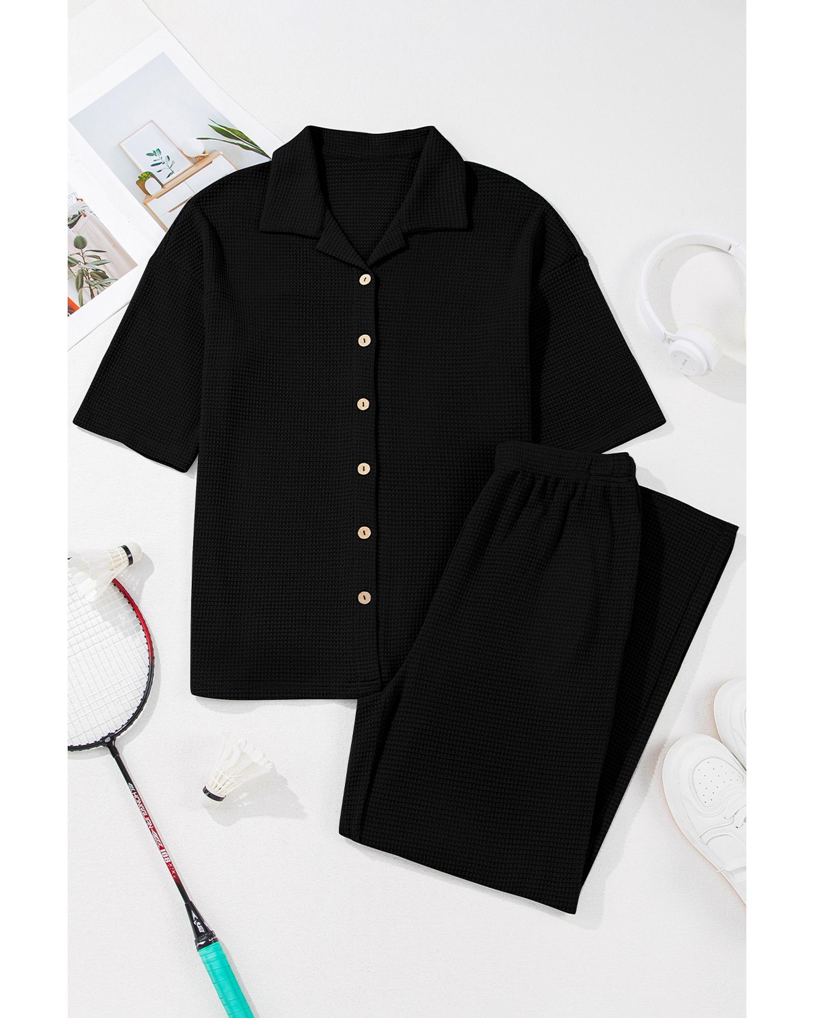 Black Solid Color Textured Buttoned Shirt and Casual Pants Set – M