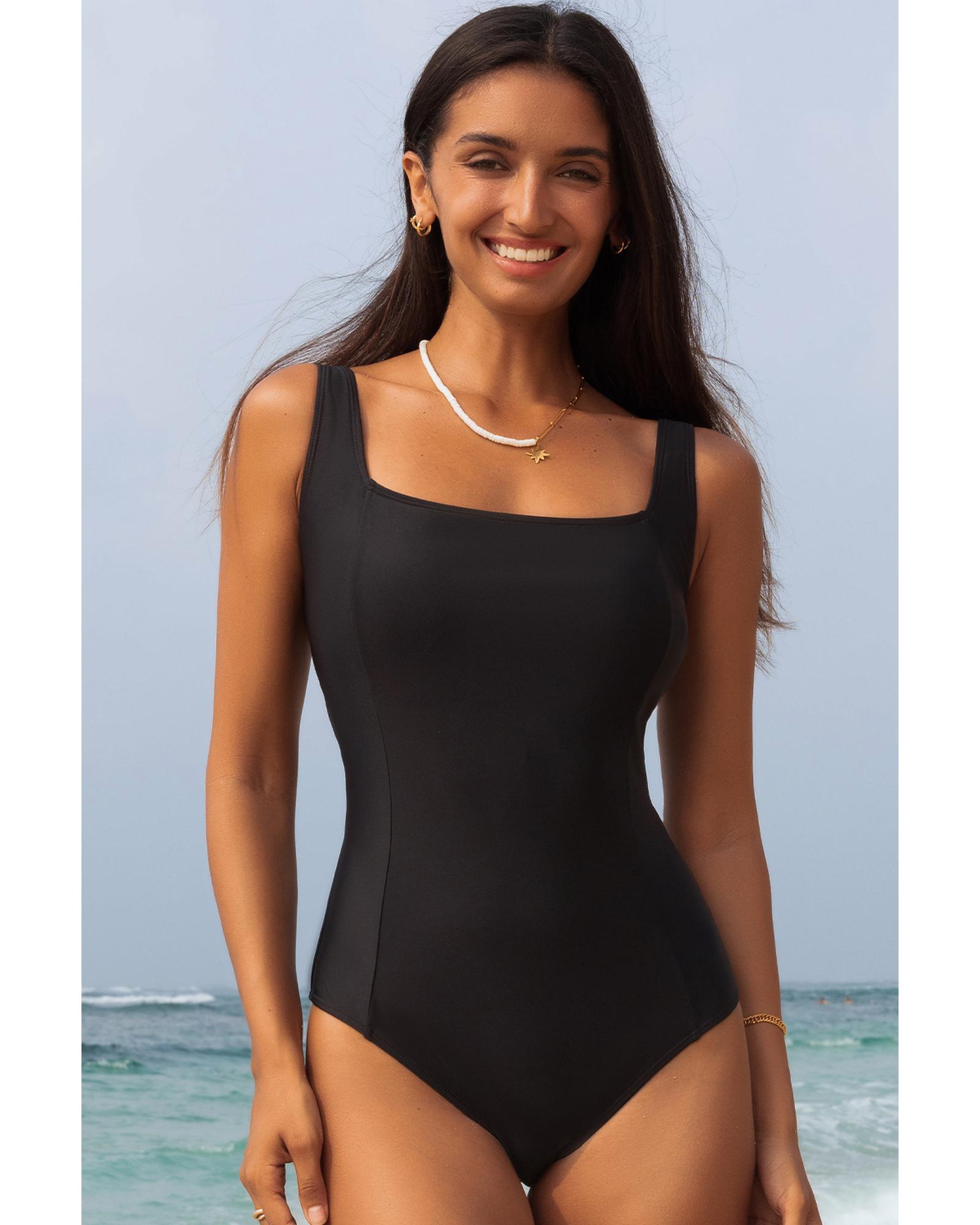 Black Solid Criss Cross Backless Square Neck One Piece Swimsuit – S