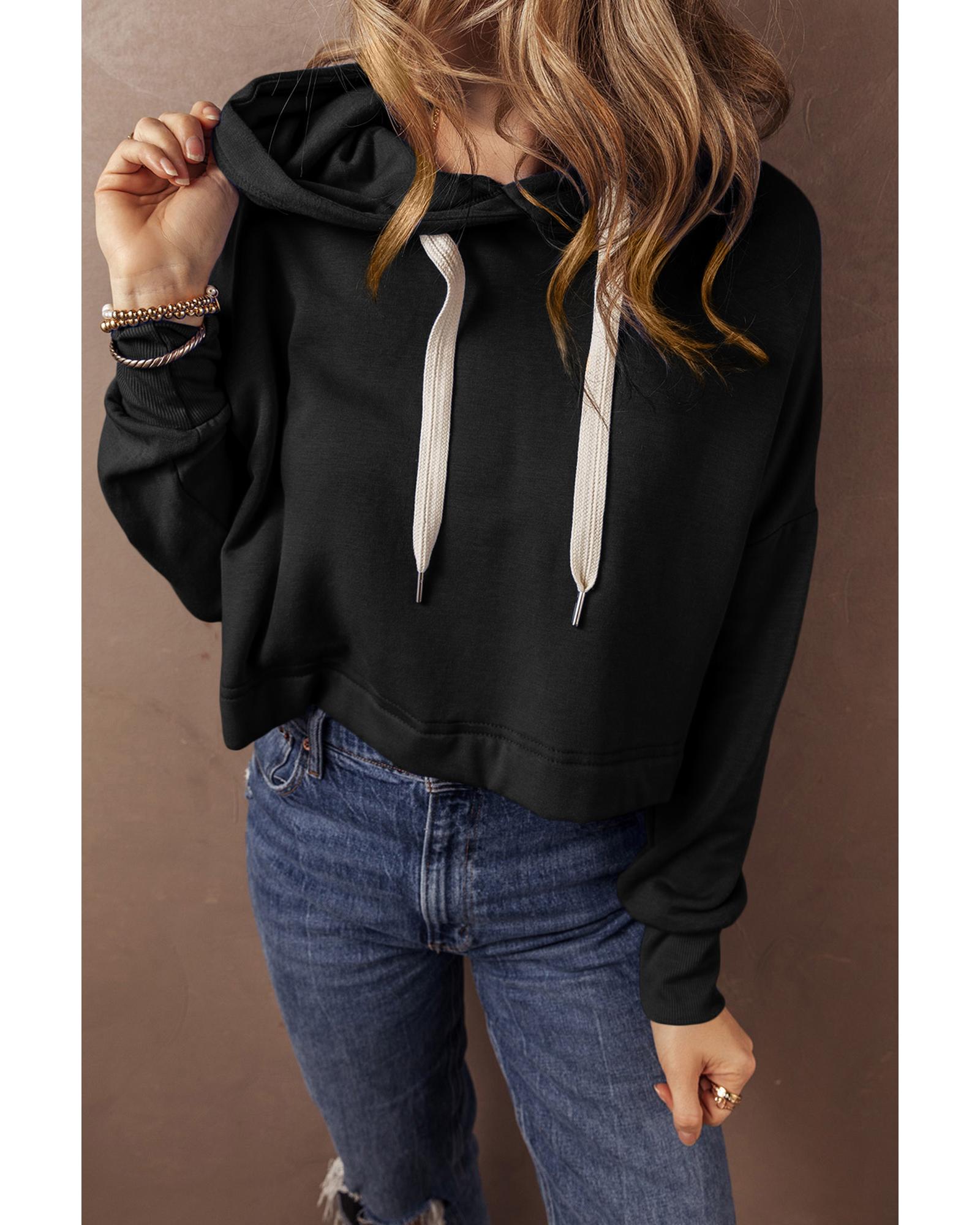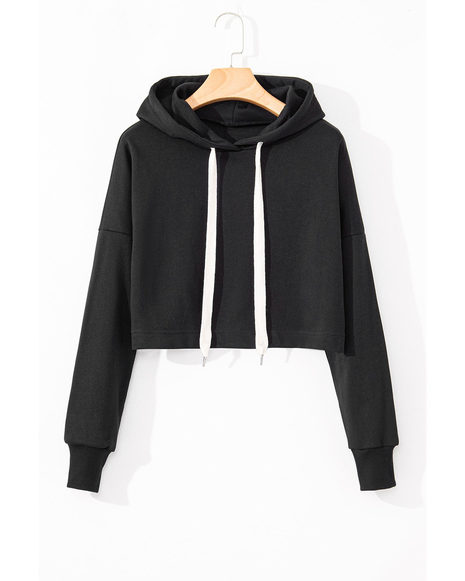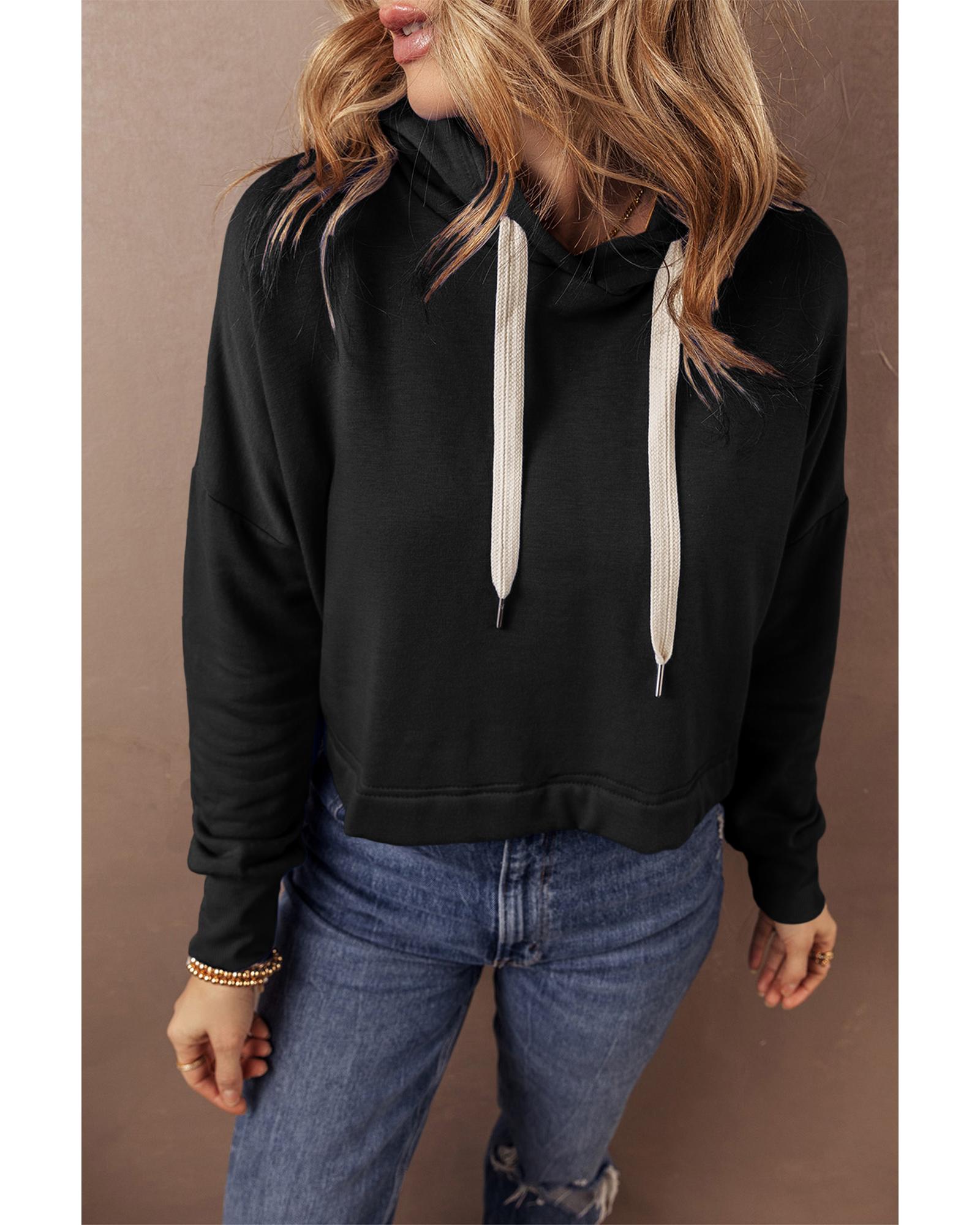 Black Solid Drop Shoulder Drawstring Cropped Hoodie – M