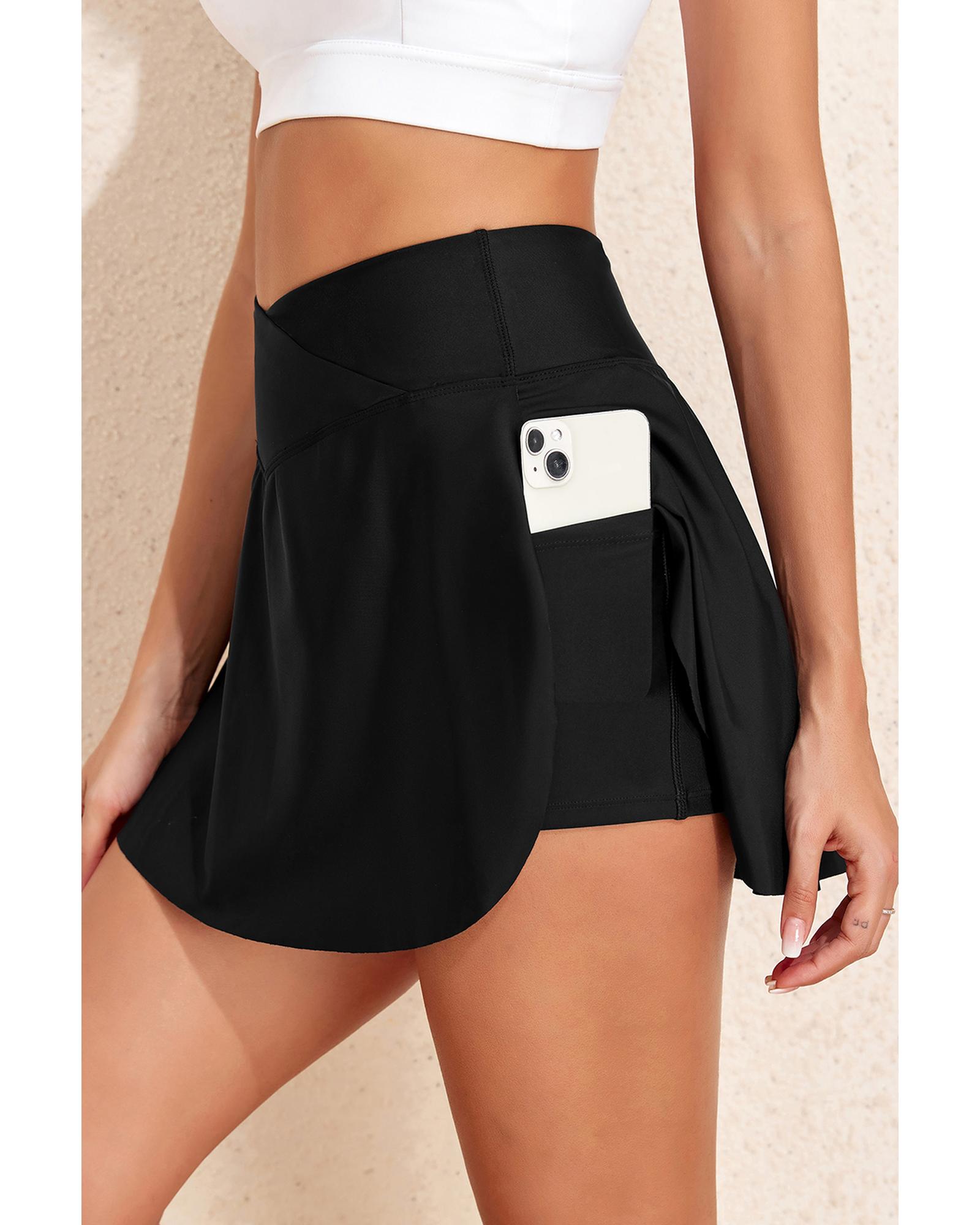 Black Solid Pocketed Crossover High Waist Swim Skort - S