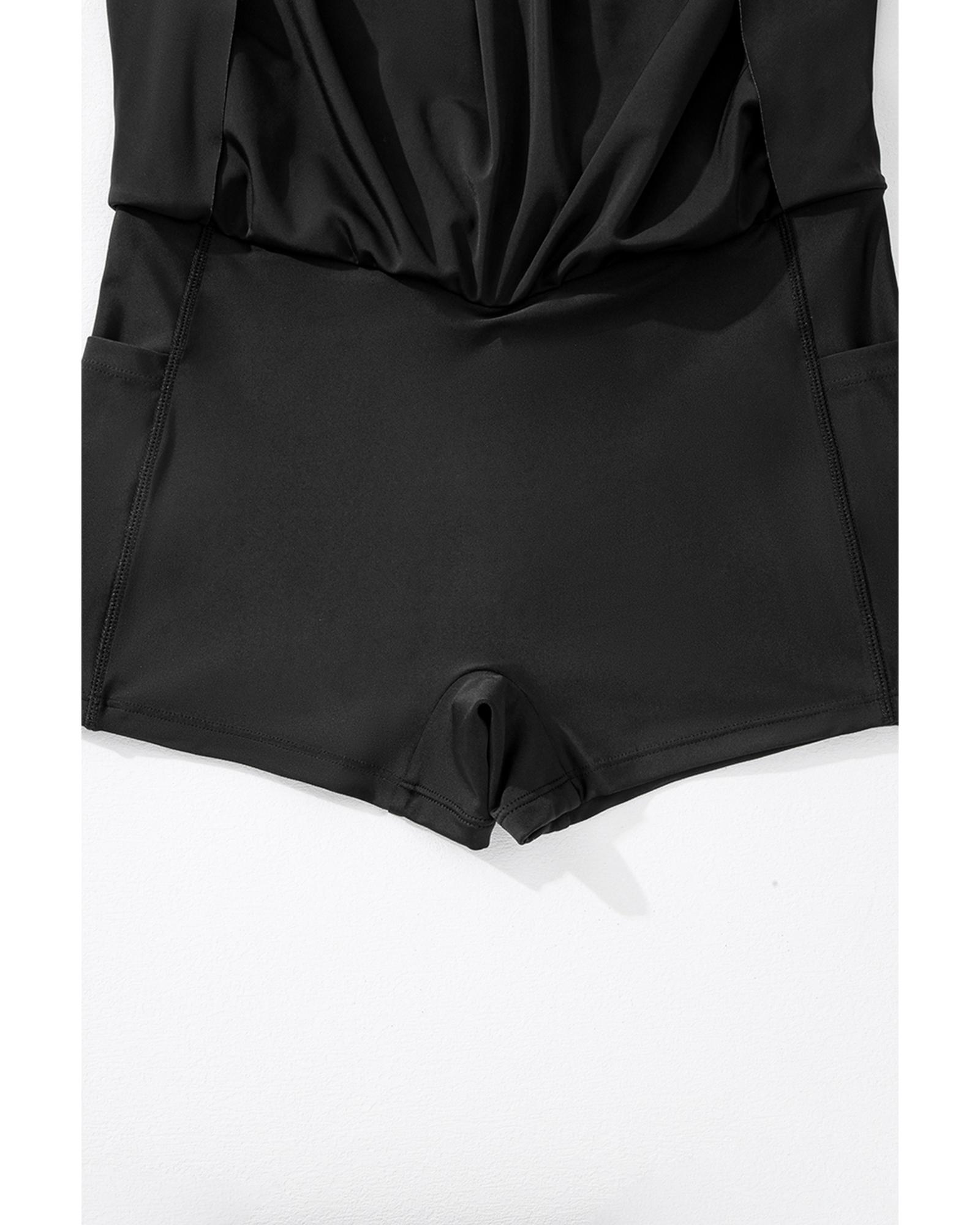 Black Solid Pocketed Crossover High Waist Swim Skort - S