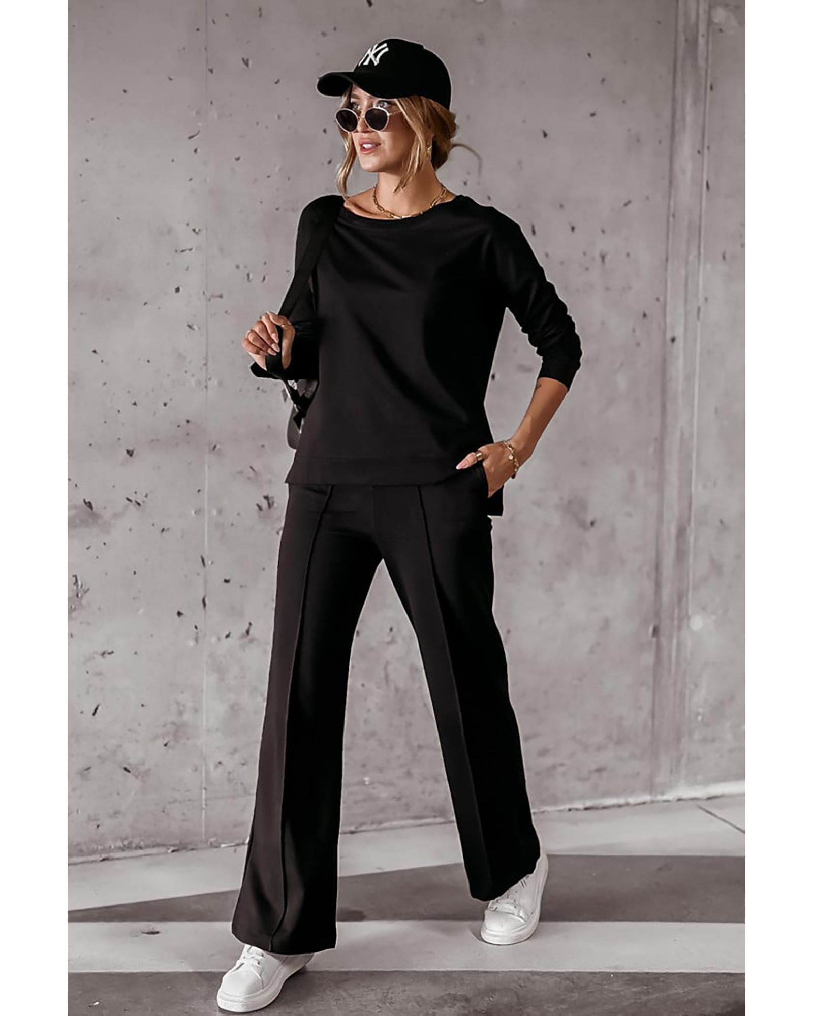 - Set includes a black solid pullover and seamed casual pants