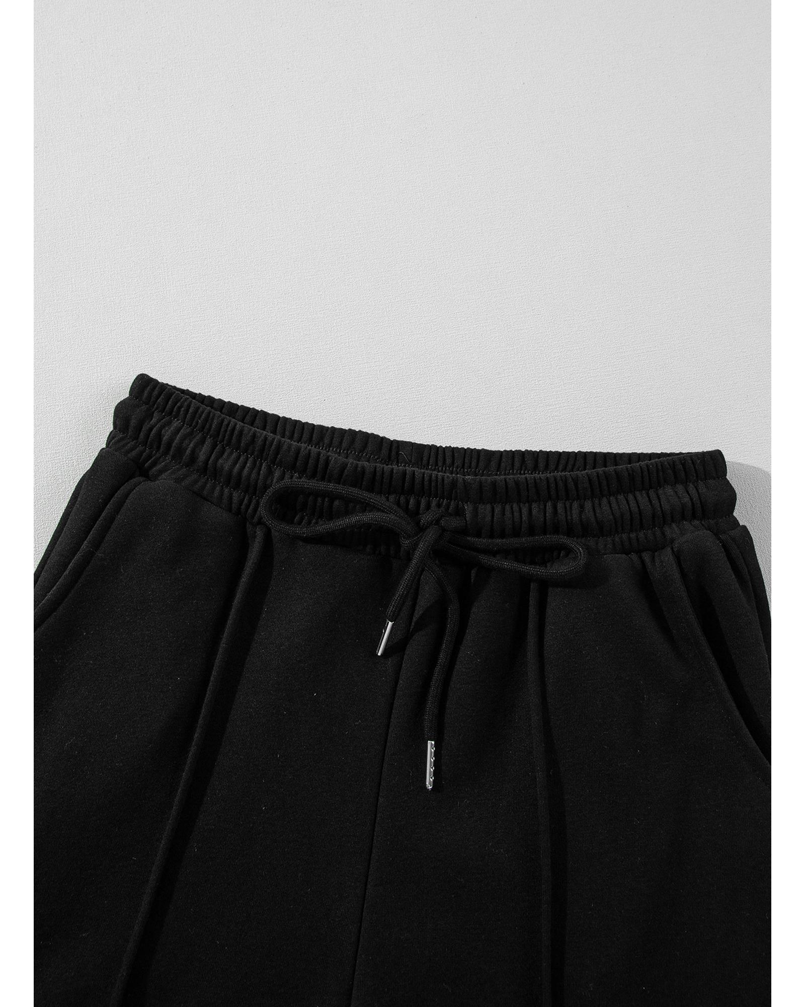 Black Solid Seamed Zipper Jacket and Drawstring Waist Pants Set – L