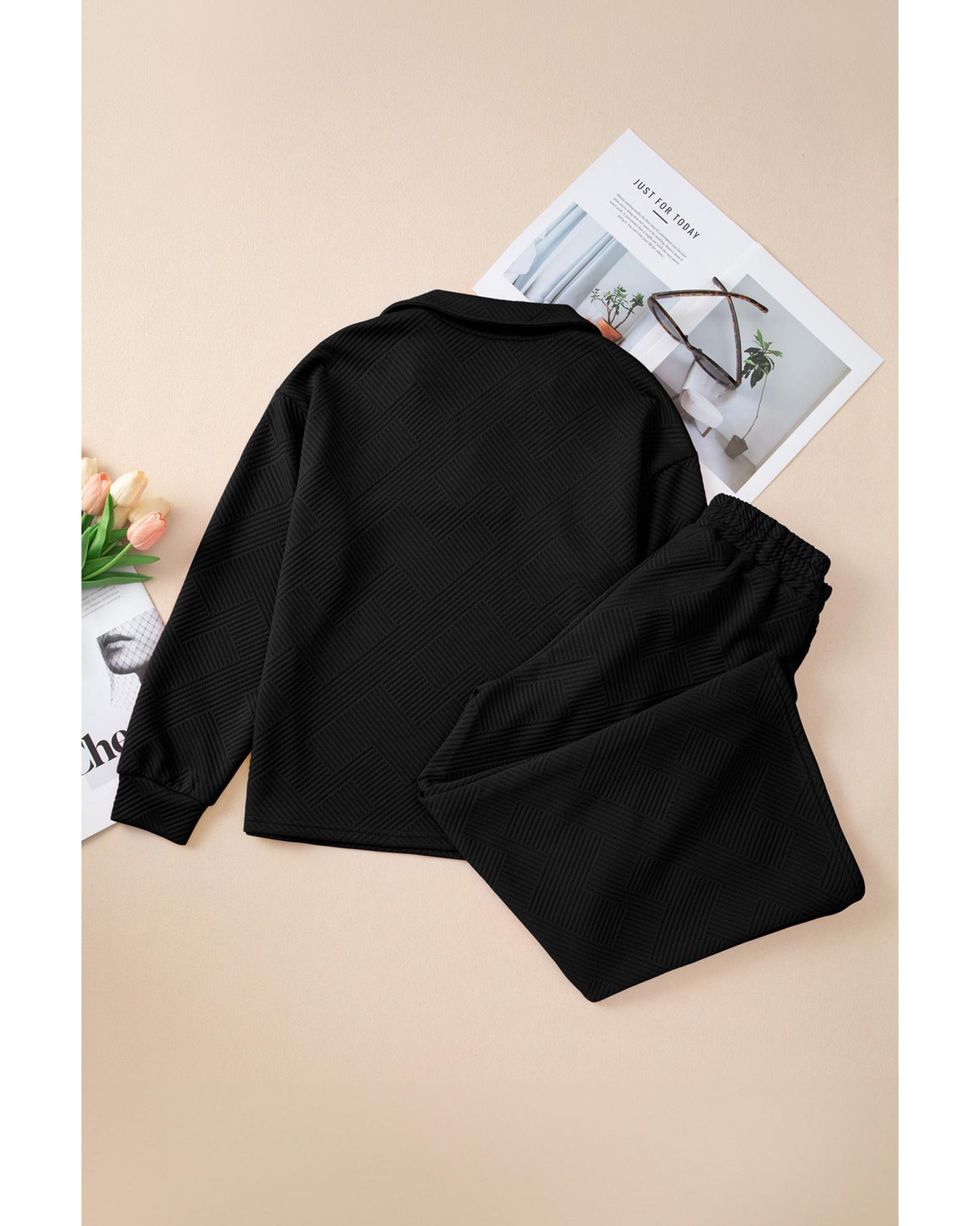 Black Solid Textured Collared V Neck Top and Wide Leg Pants Set – 2XL