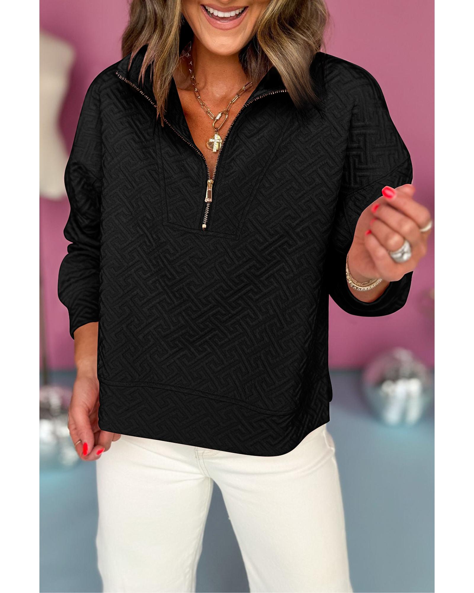 Black Solid Textured Half Zipper Collared Sweatshirt – L