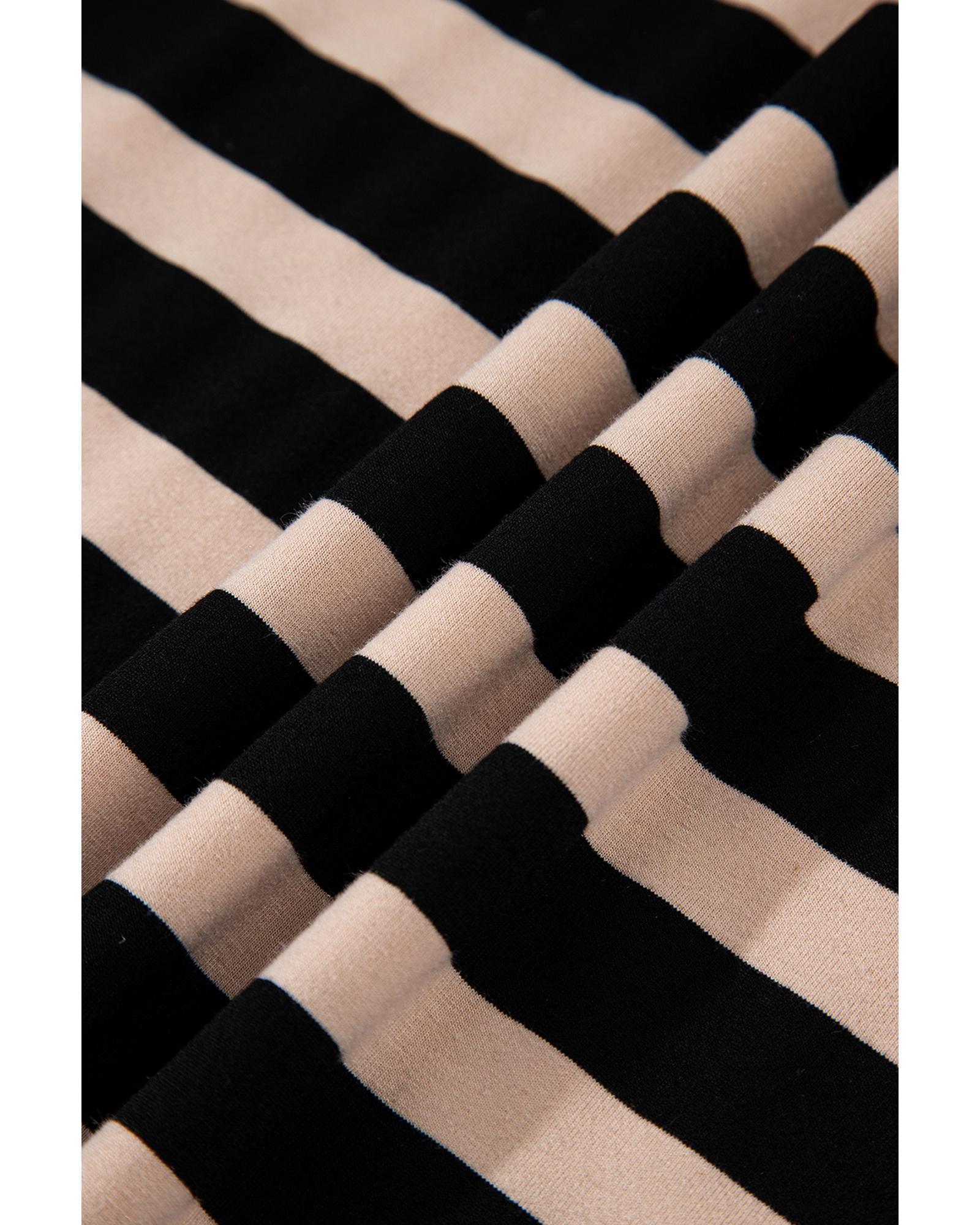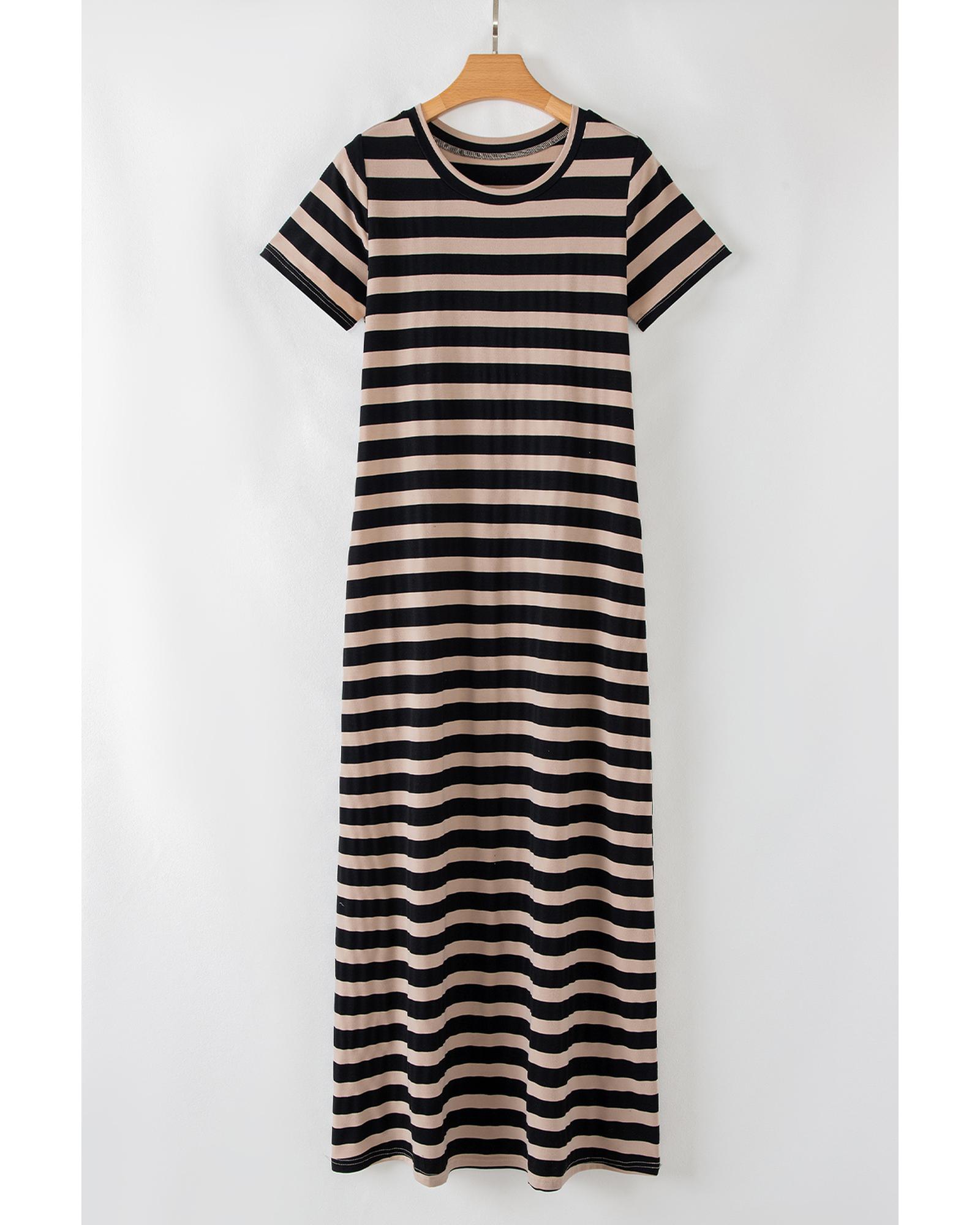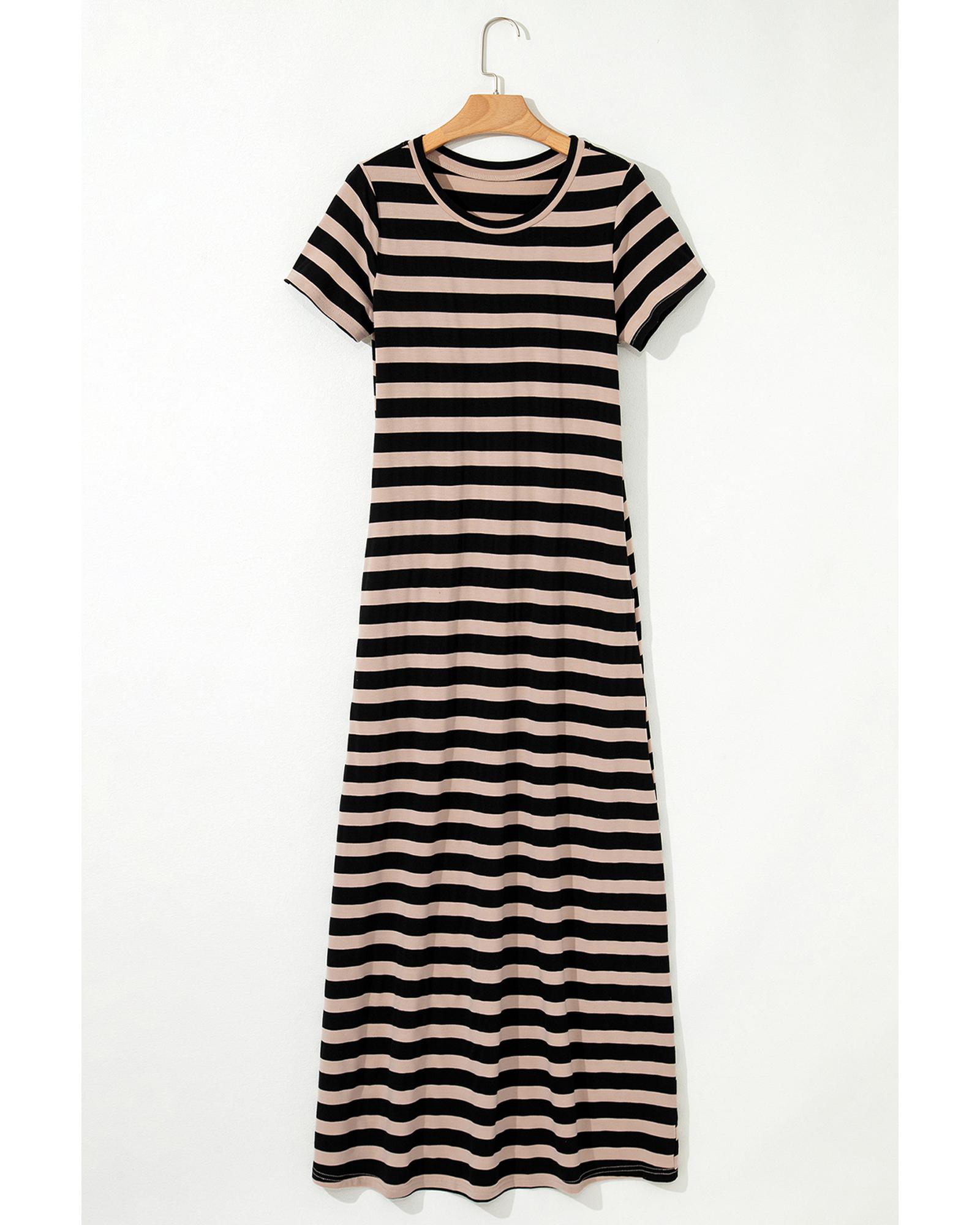 Black Stripe Casual Round Neck T-shirt Maxi Dress with Pockets – M