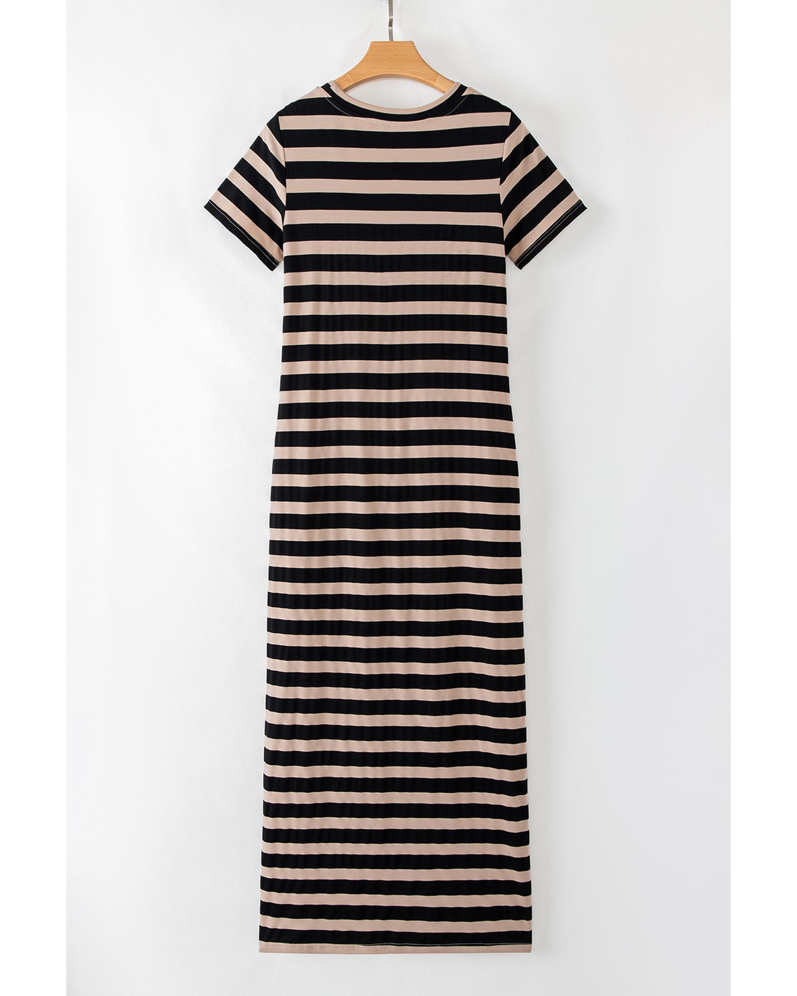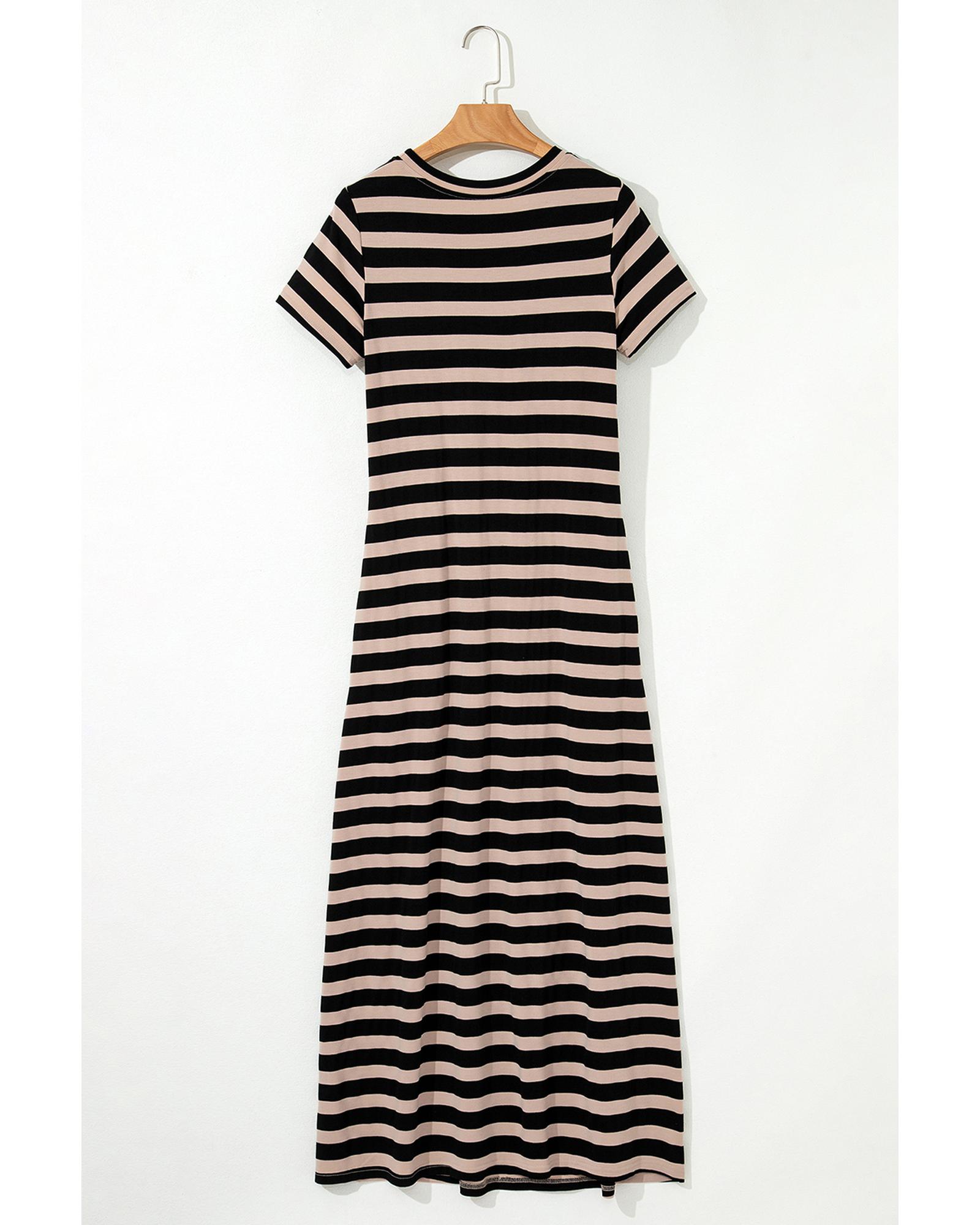 Black Stripe Casual Round Neck T-shirt Maxi Dress with Pockets – XL