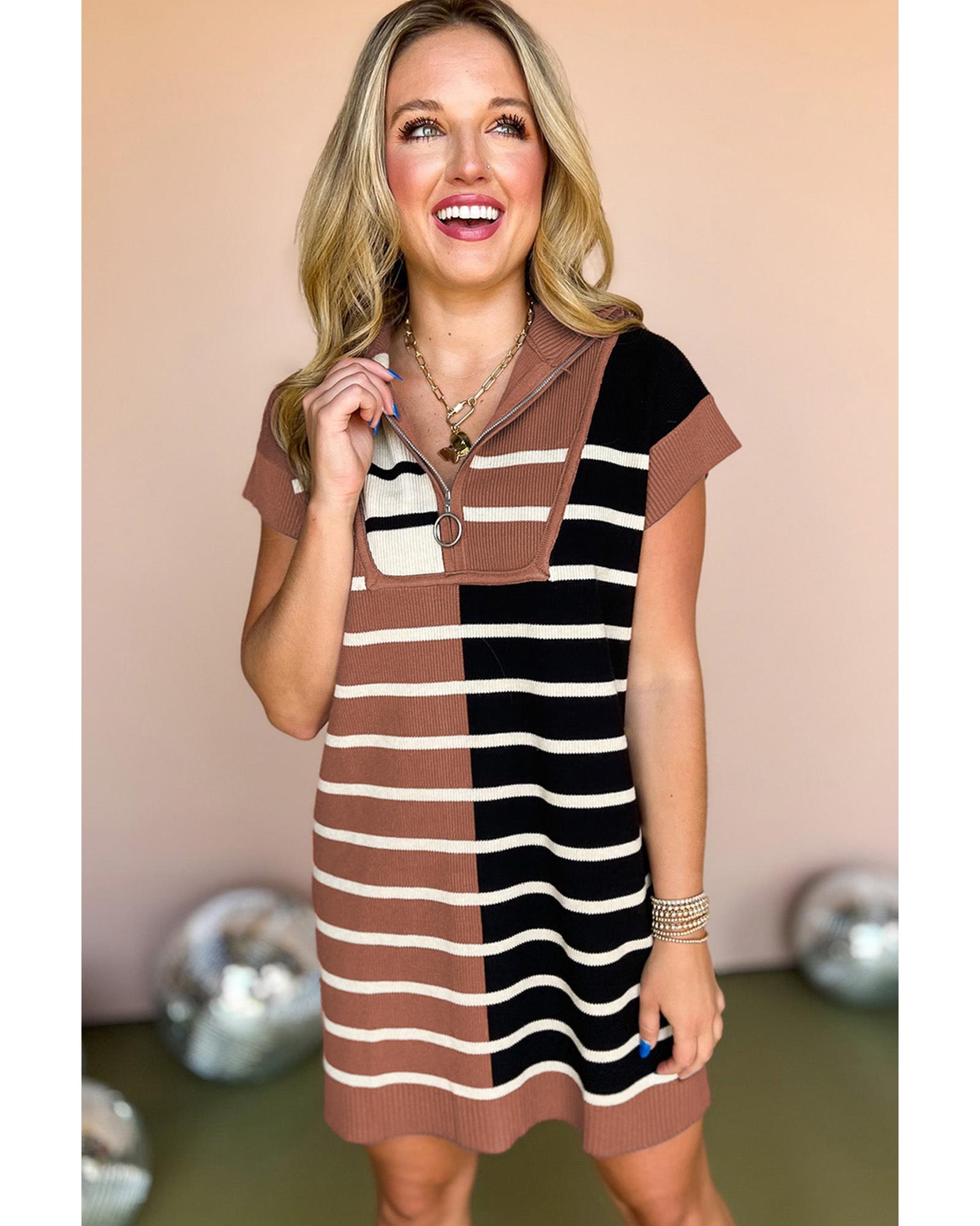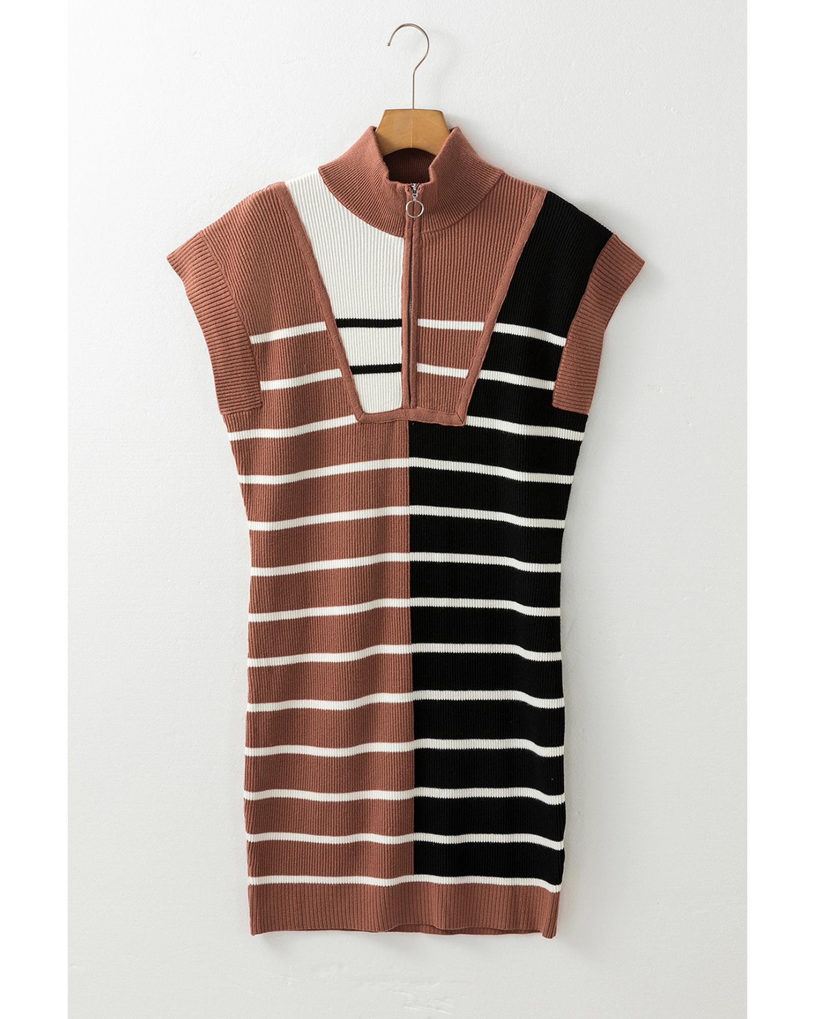 Black Stripe Color Block Quarter Zip Collar Short Sleeve Sweater Dress - S