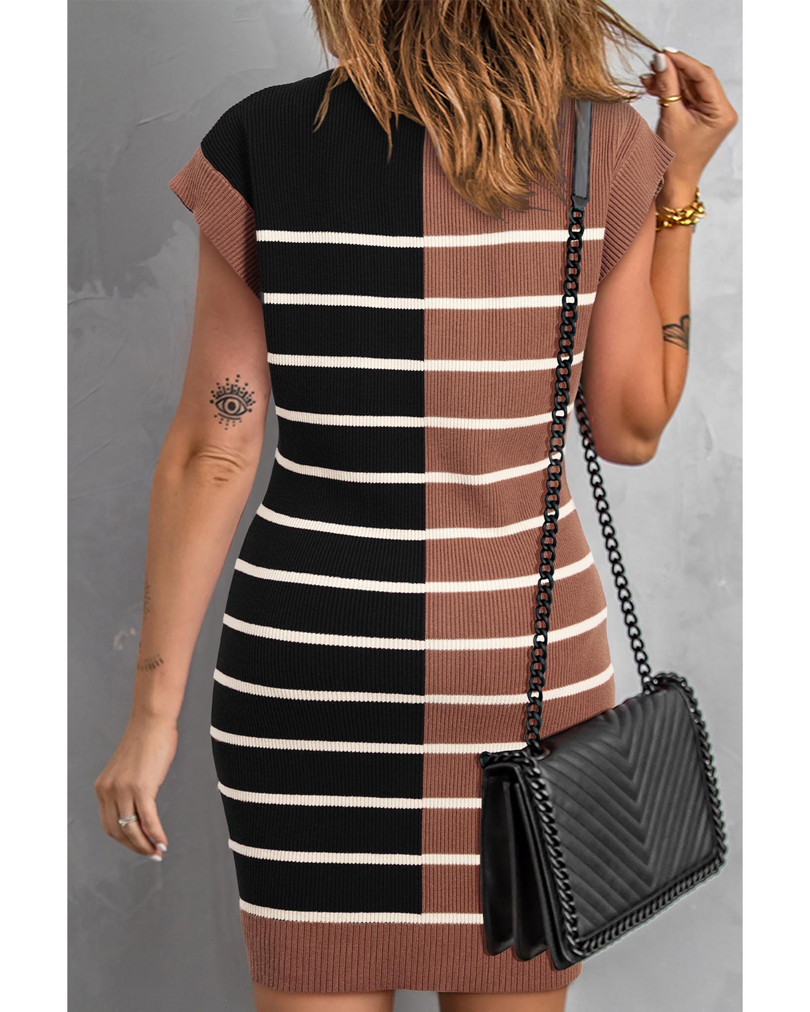Black Stripe Color Block Quarter Zip Collar Short Sleeve Sweater Dress – M