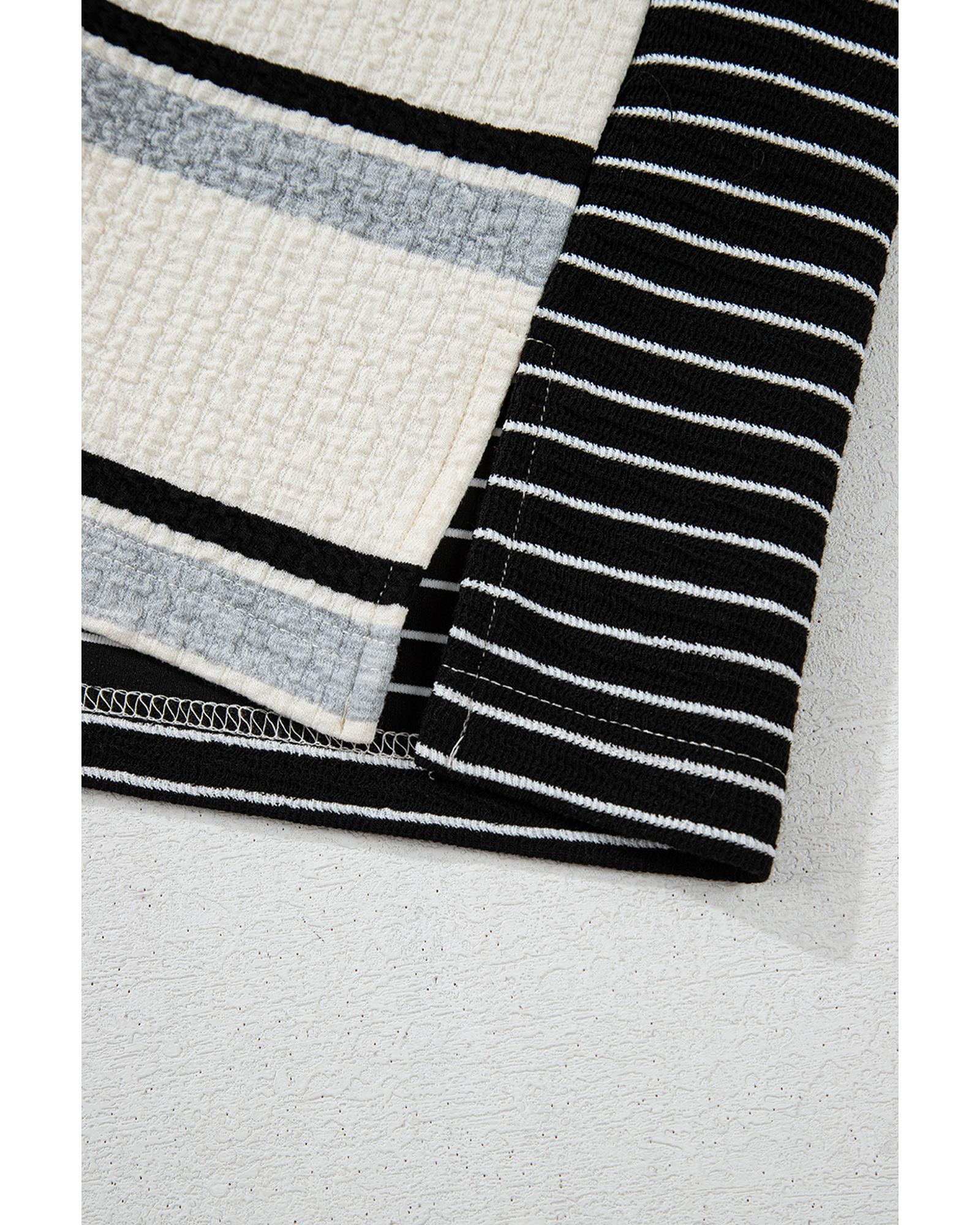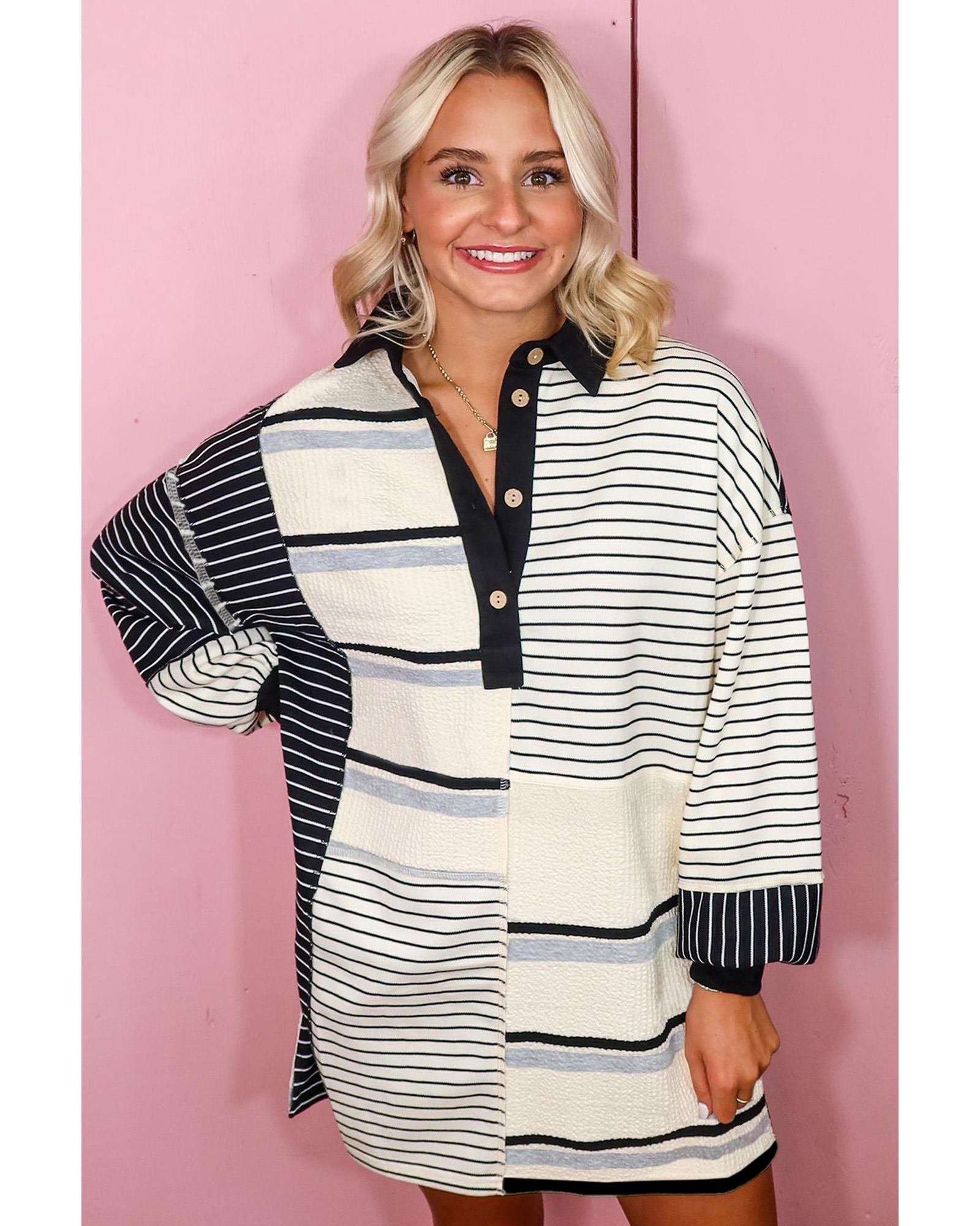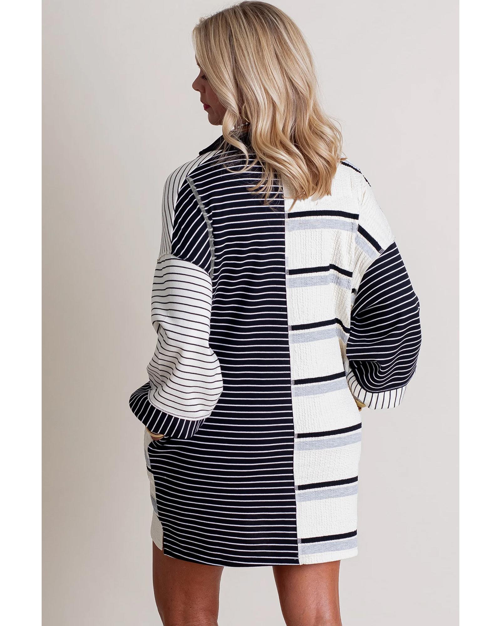 - Black Stripe Colorblock Knit Henley Collar Shift Long Sleeve Mini Dress
