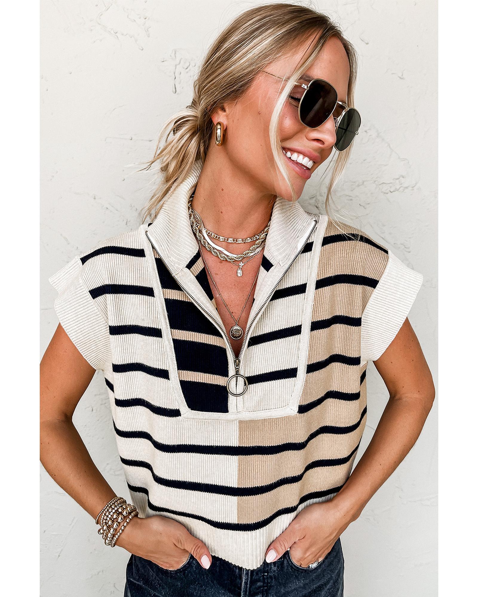 Khaki Stripe Color Block Quarter Zip Collar Short Sleeve Sweater Dress - S