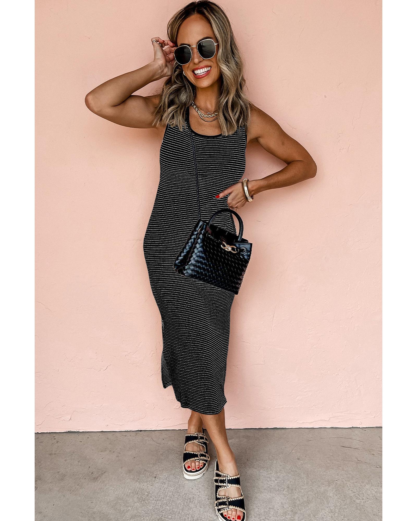 Black Stripe Criss Cross Side Slits Slim Fit Sleeveless Midi Dress – XL