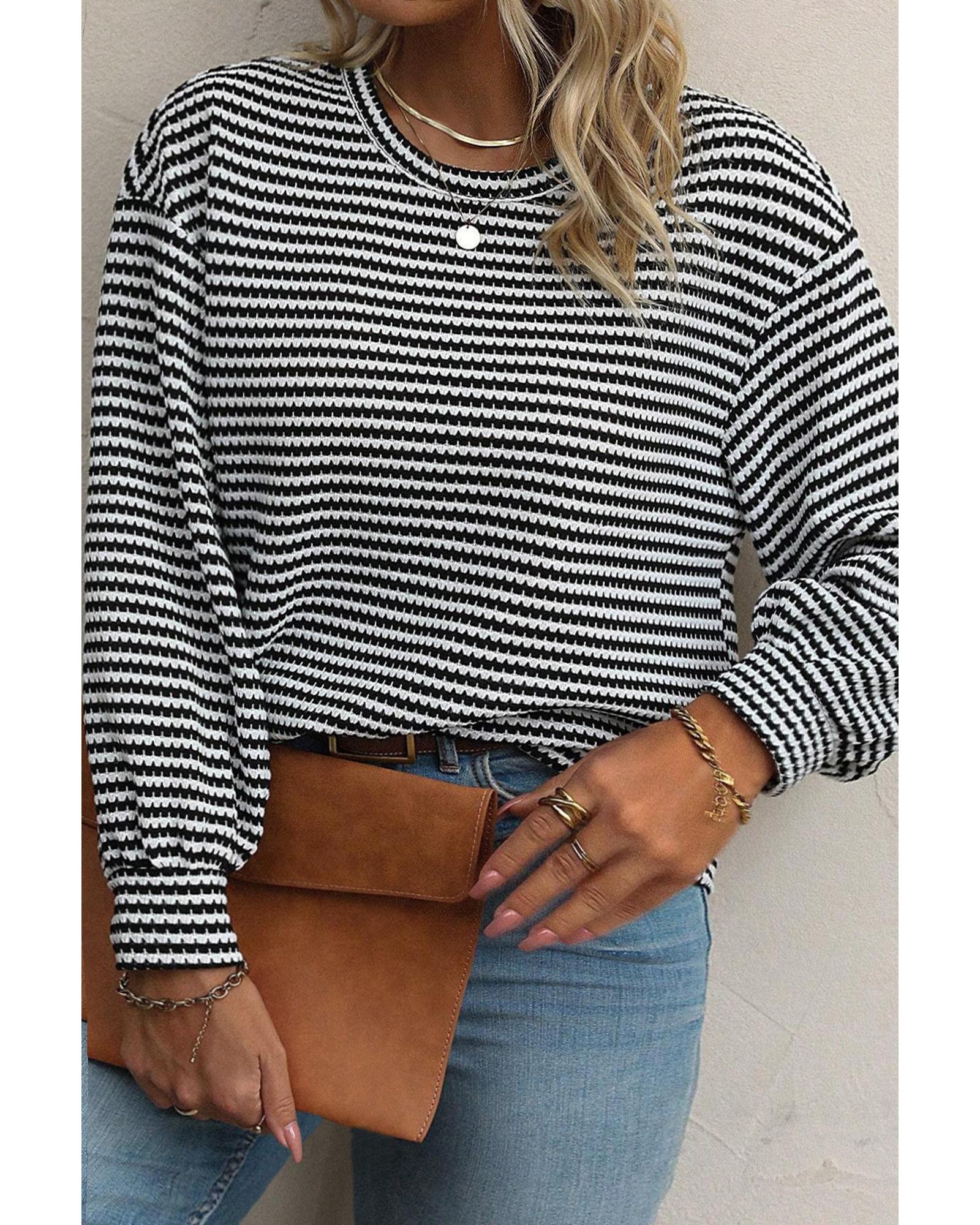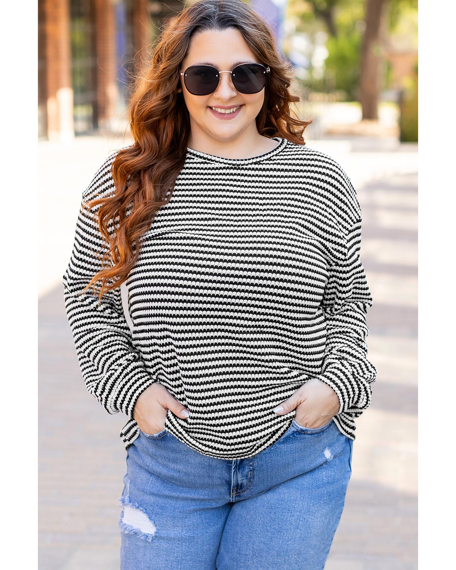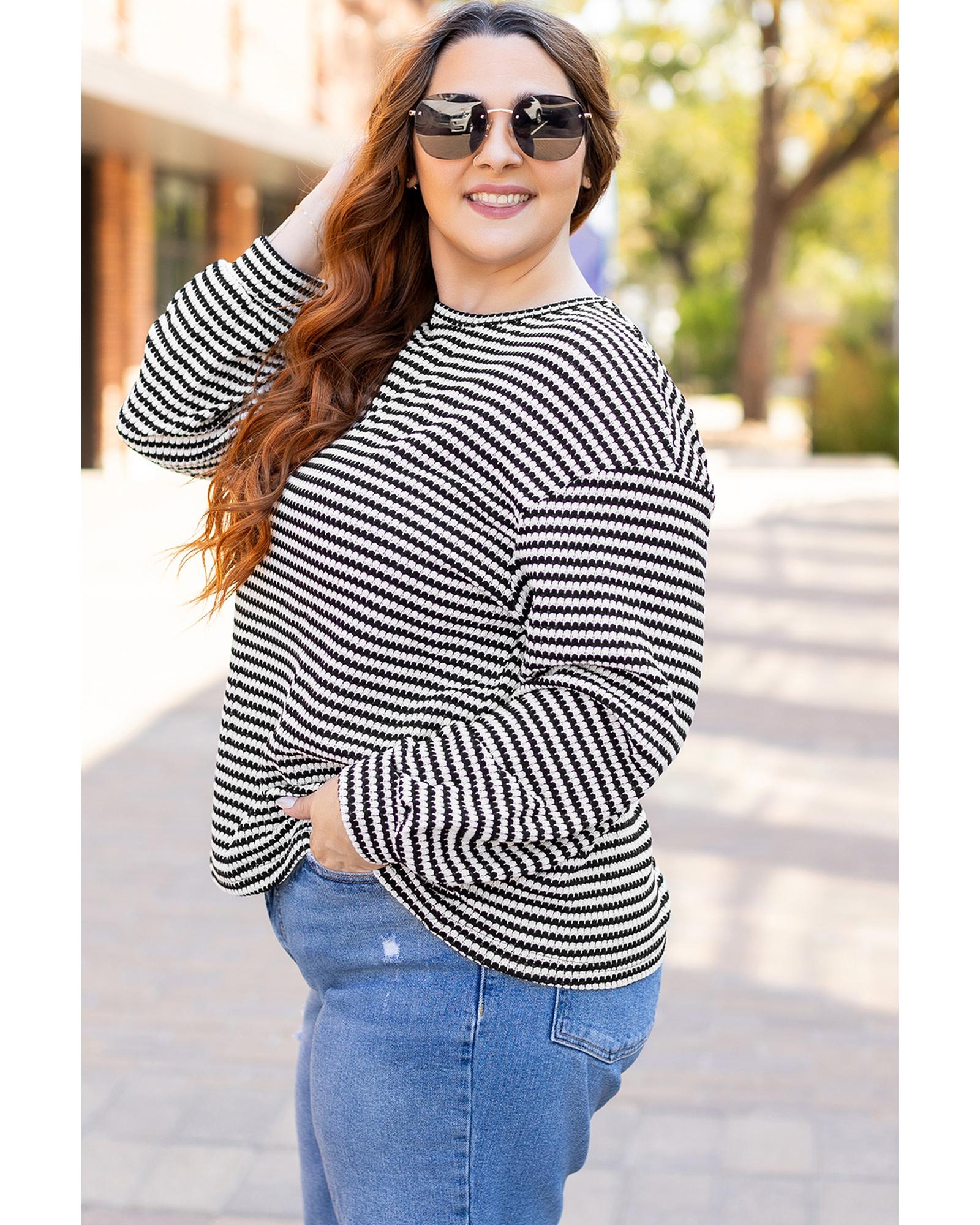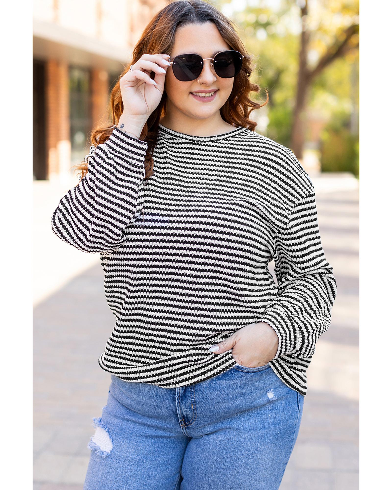 Black Stripe Drop Shoulder Puff Long Sleeve O Neck Plus Size T Shirt – 4X