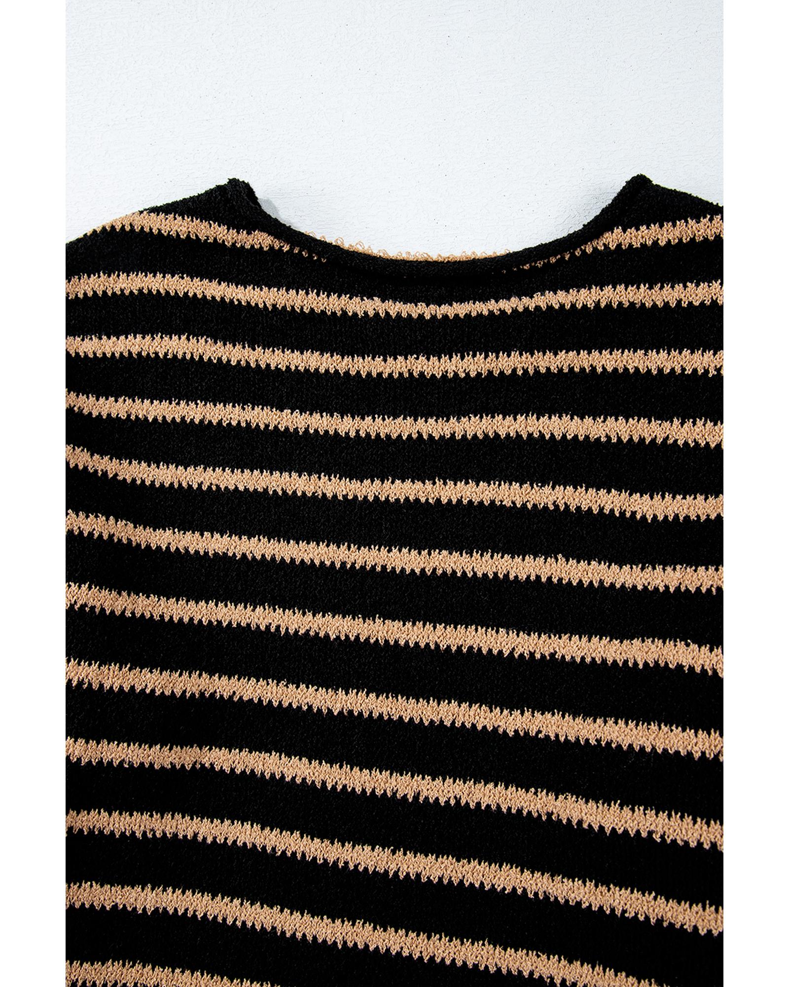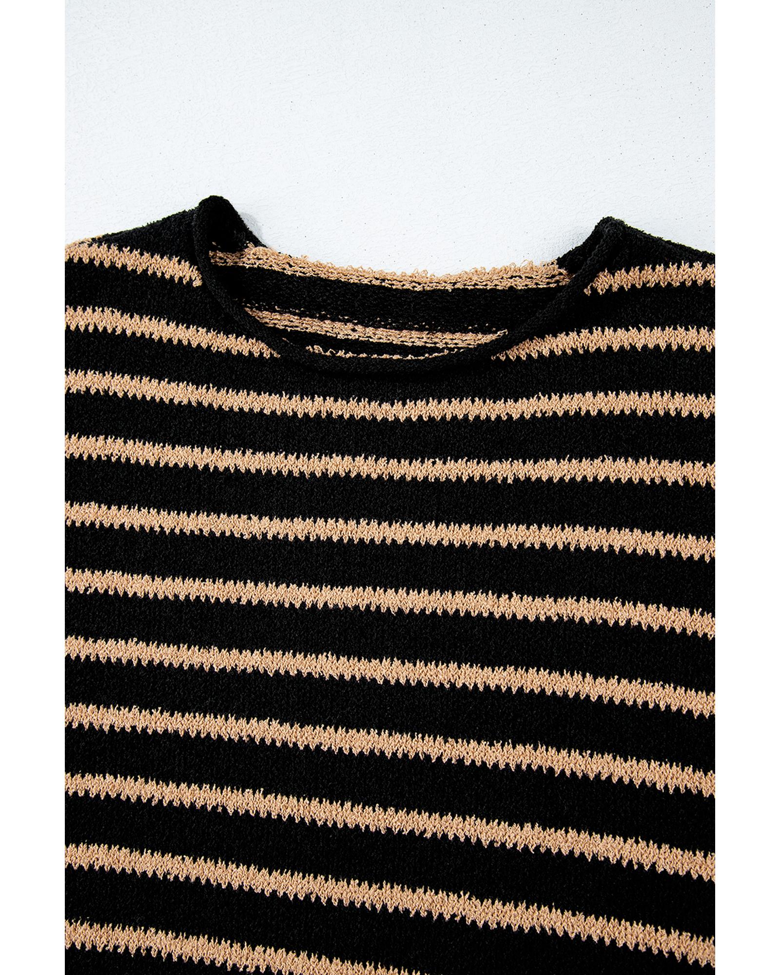 Black Stripe Drop Shoulder Round Neck Loose Sweater – M