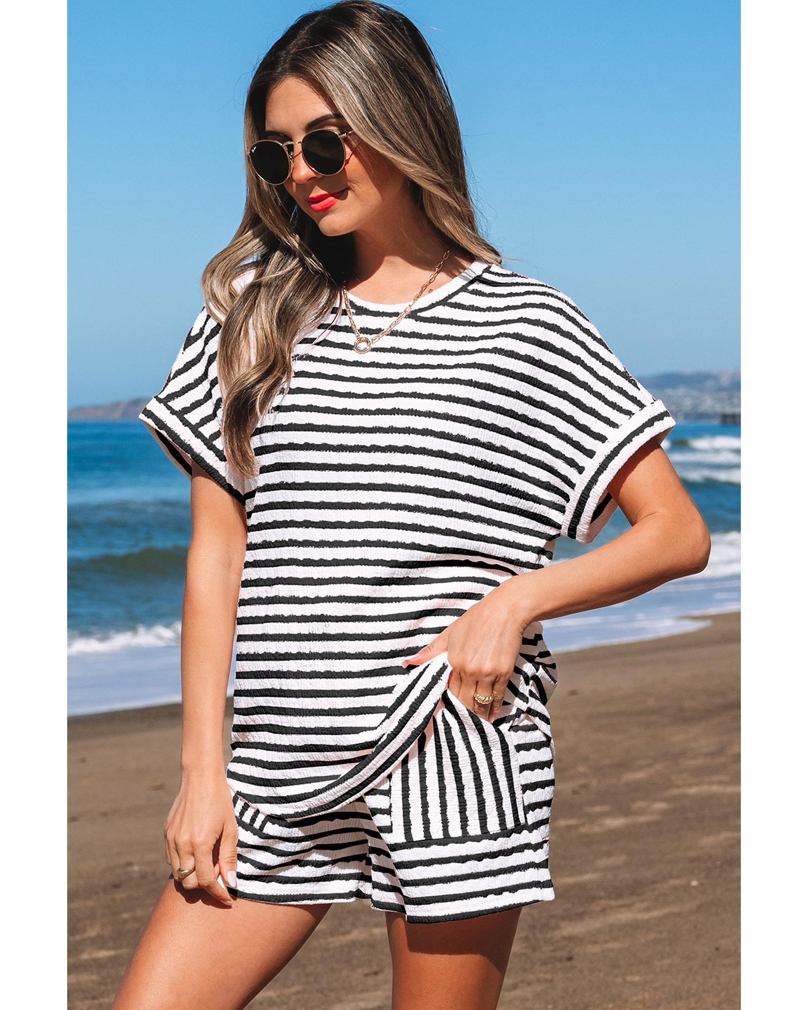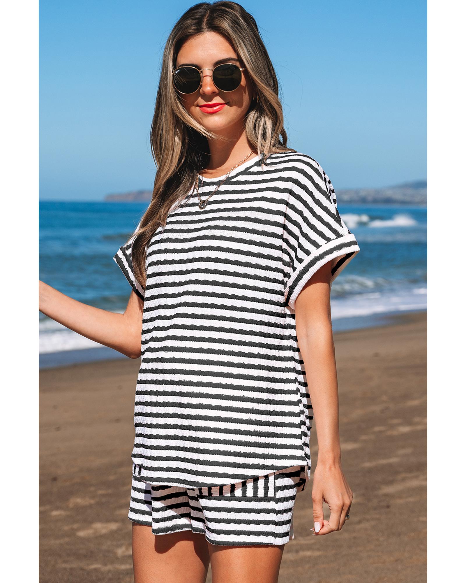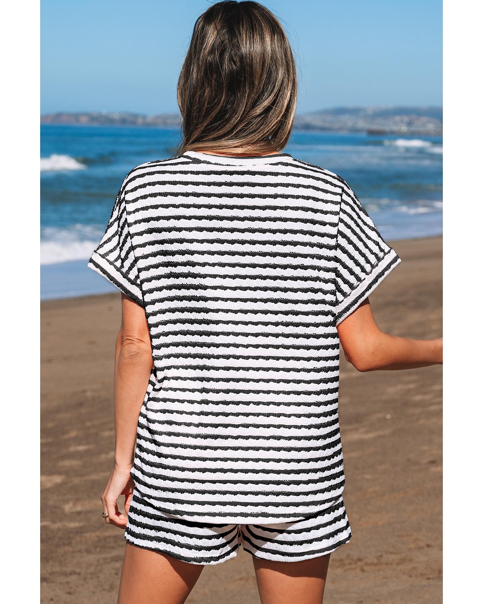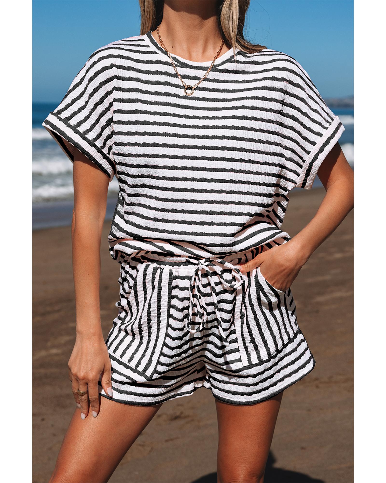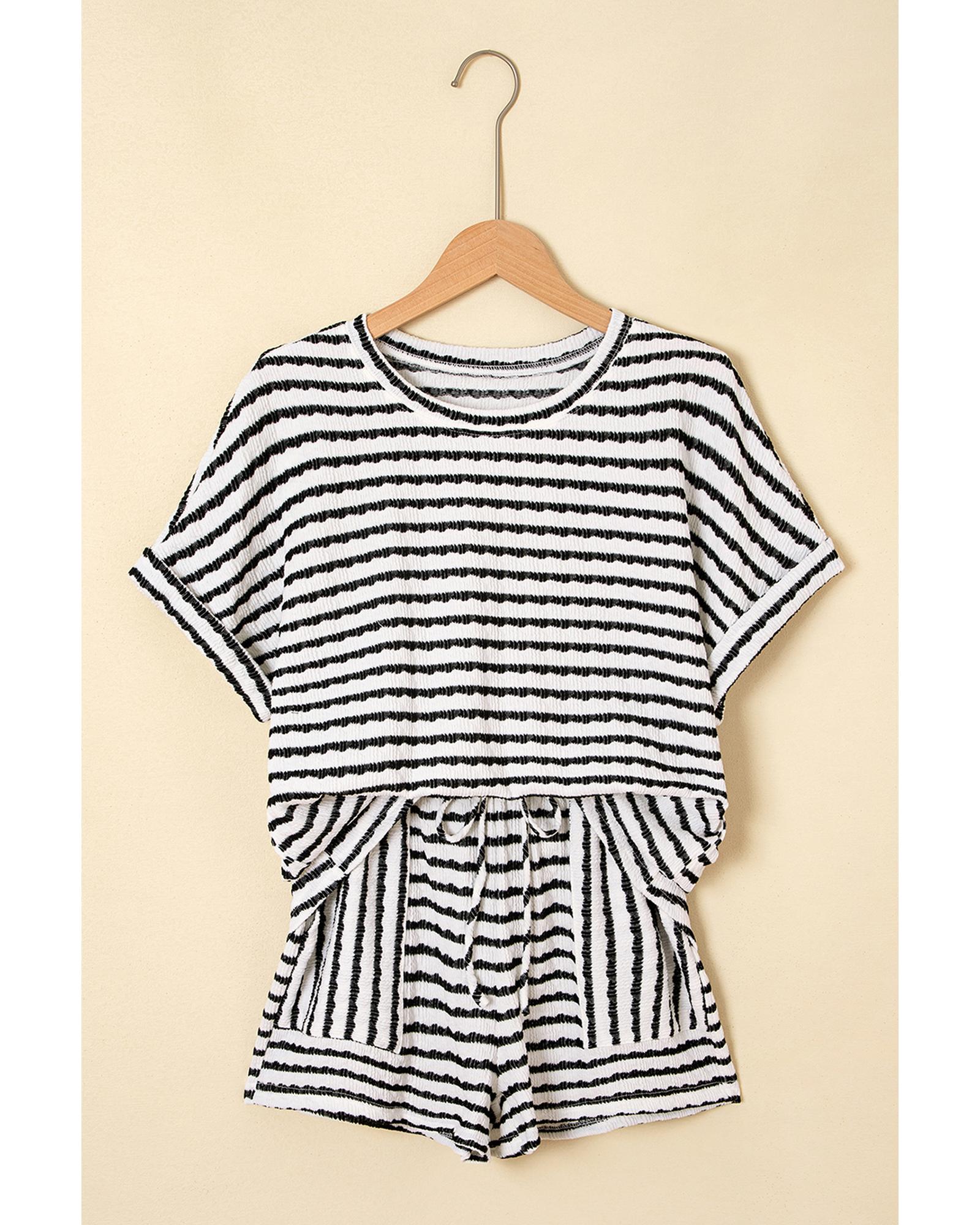 Black Stripe Knitted Short Sleeve Top and Drawstring Shorts Set – S