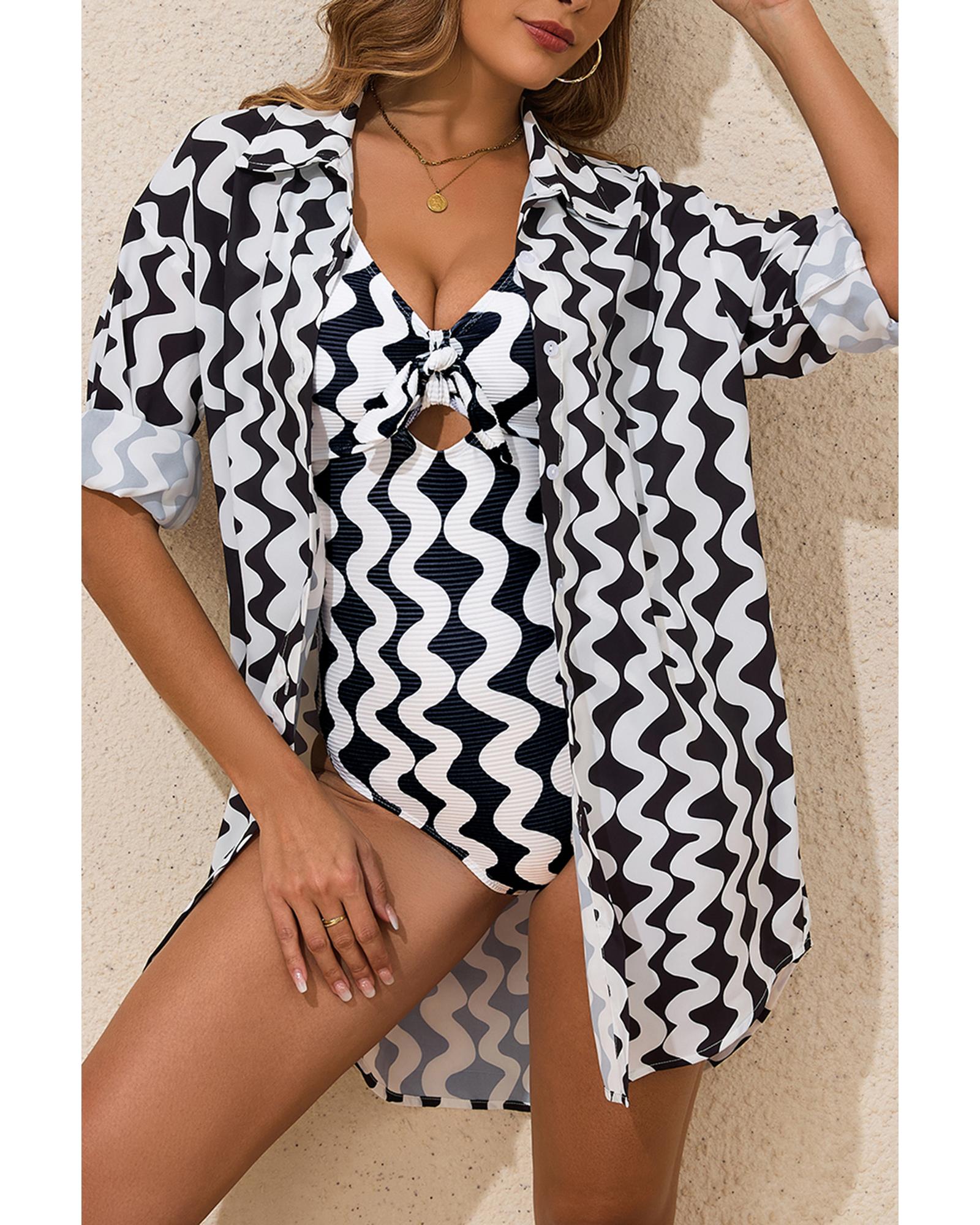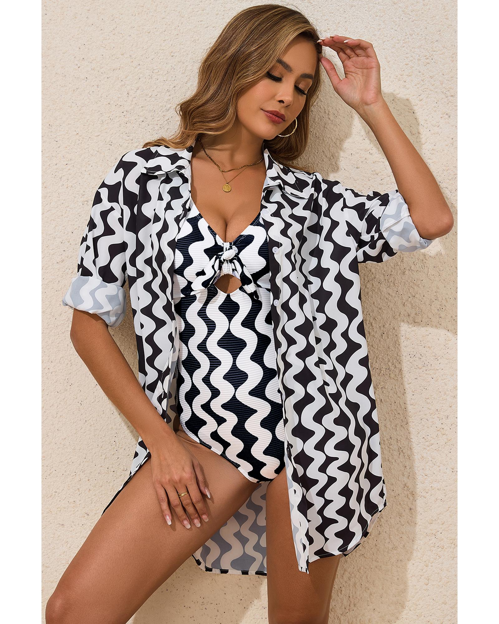 Black Stripe Print Loose Fit Open Front Beach Cover Up – L