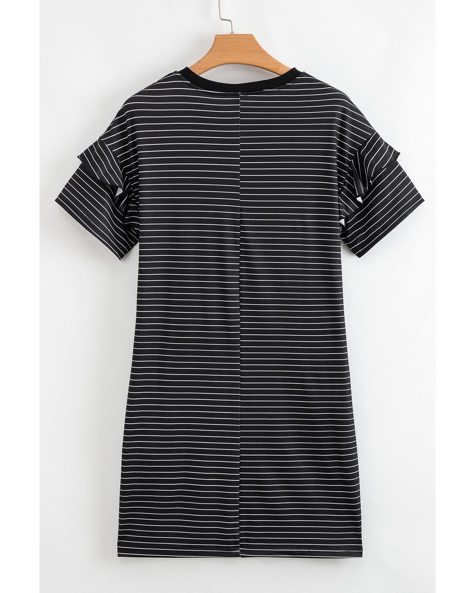 Black Stripe Ruffled Short Sleeve Crew Neck T Shirt Shift Mini Dress – M