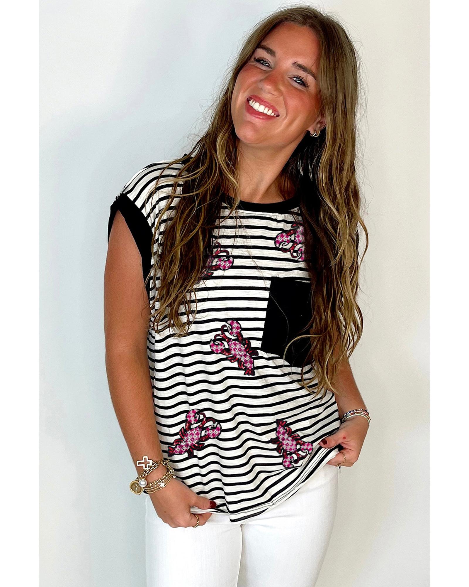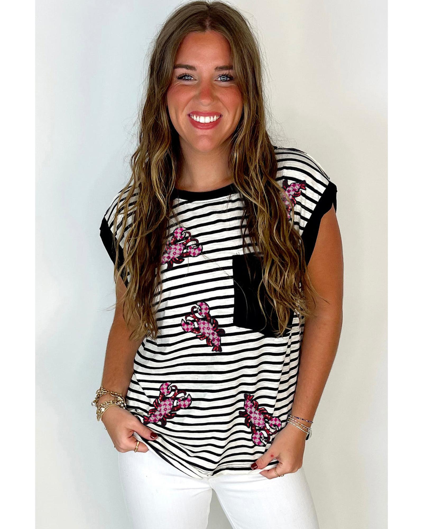 Black Stripe Sequined Lobster Patched Pocket Casual Tank Top – S