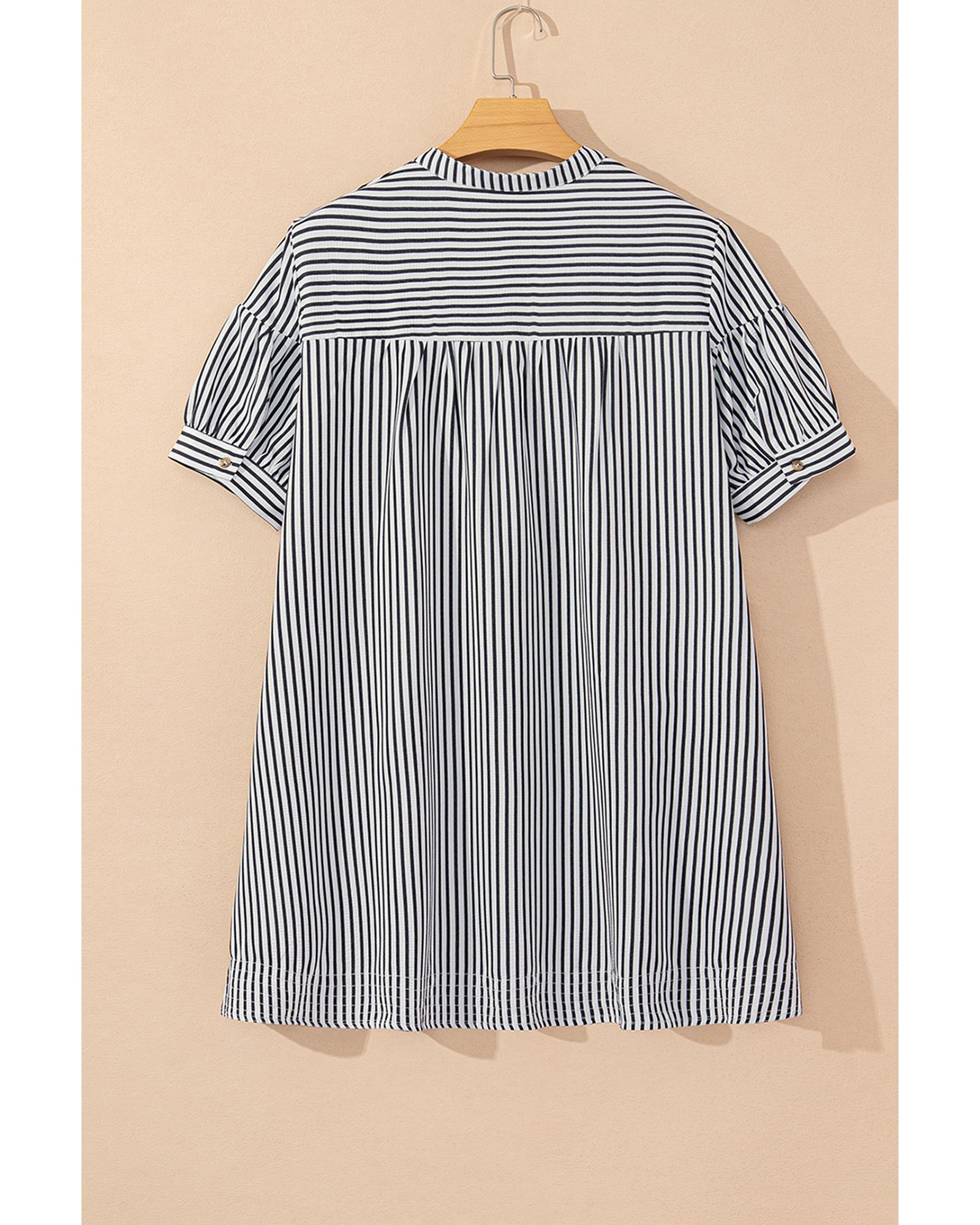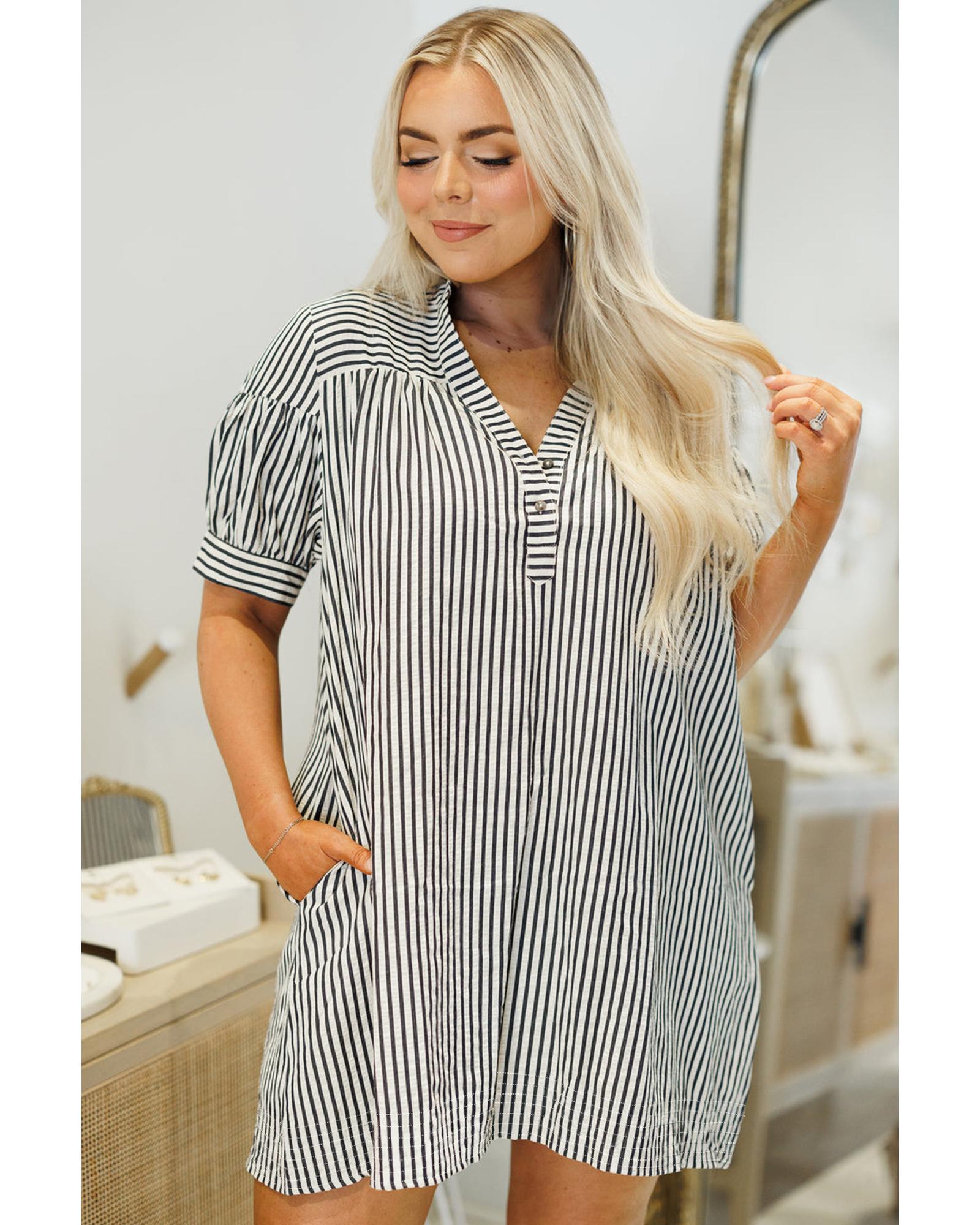 Black Stripe Short Sleeve Buttoned V Neck Pocketed Plus Size Mini Dress – 4X