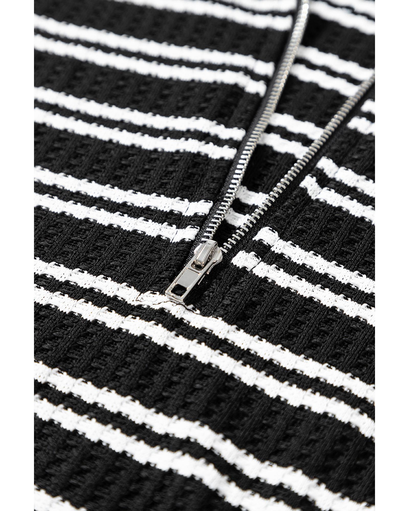 Black Stripe Textured Quarter Zip Collar Long Sleeve Top – M