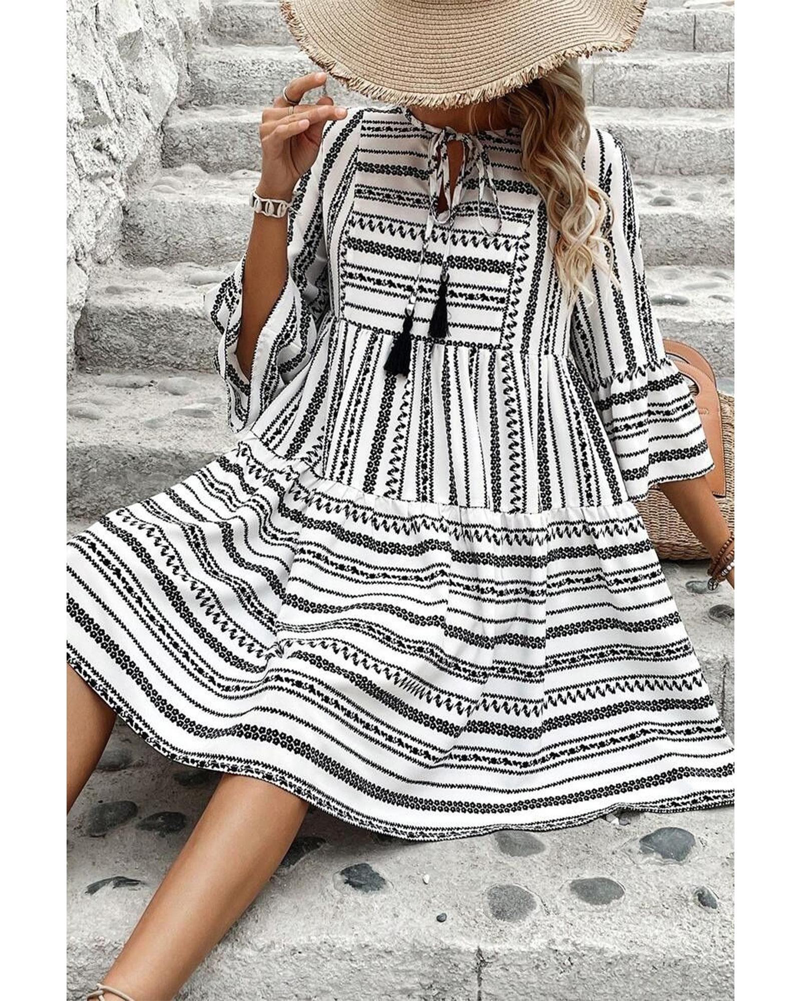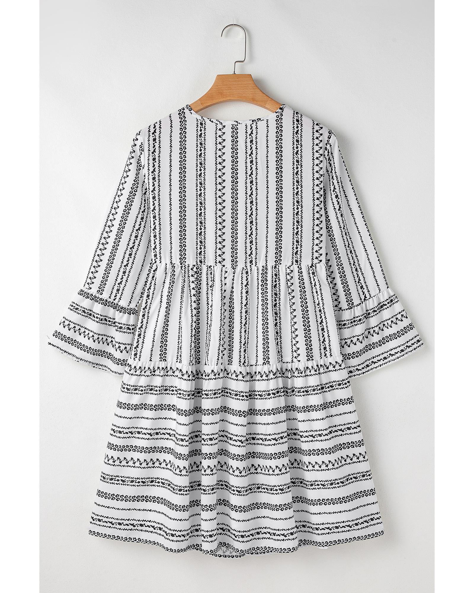 • Black Stripe V Neck Bell Sleeve High Waist Mini Dress