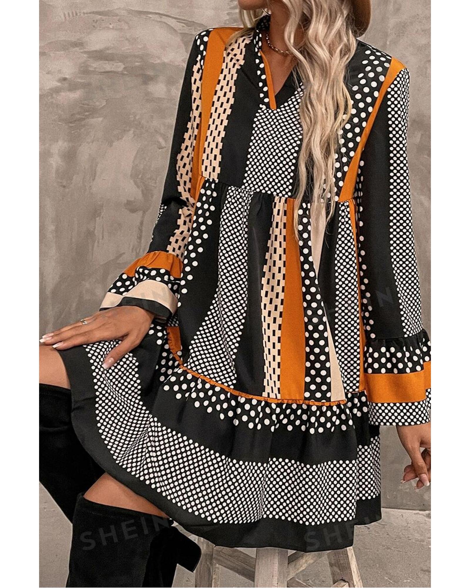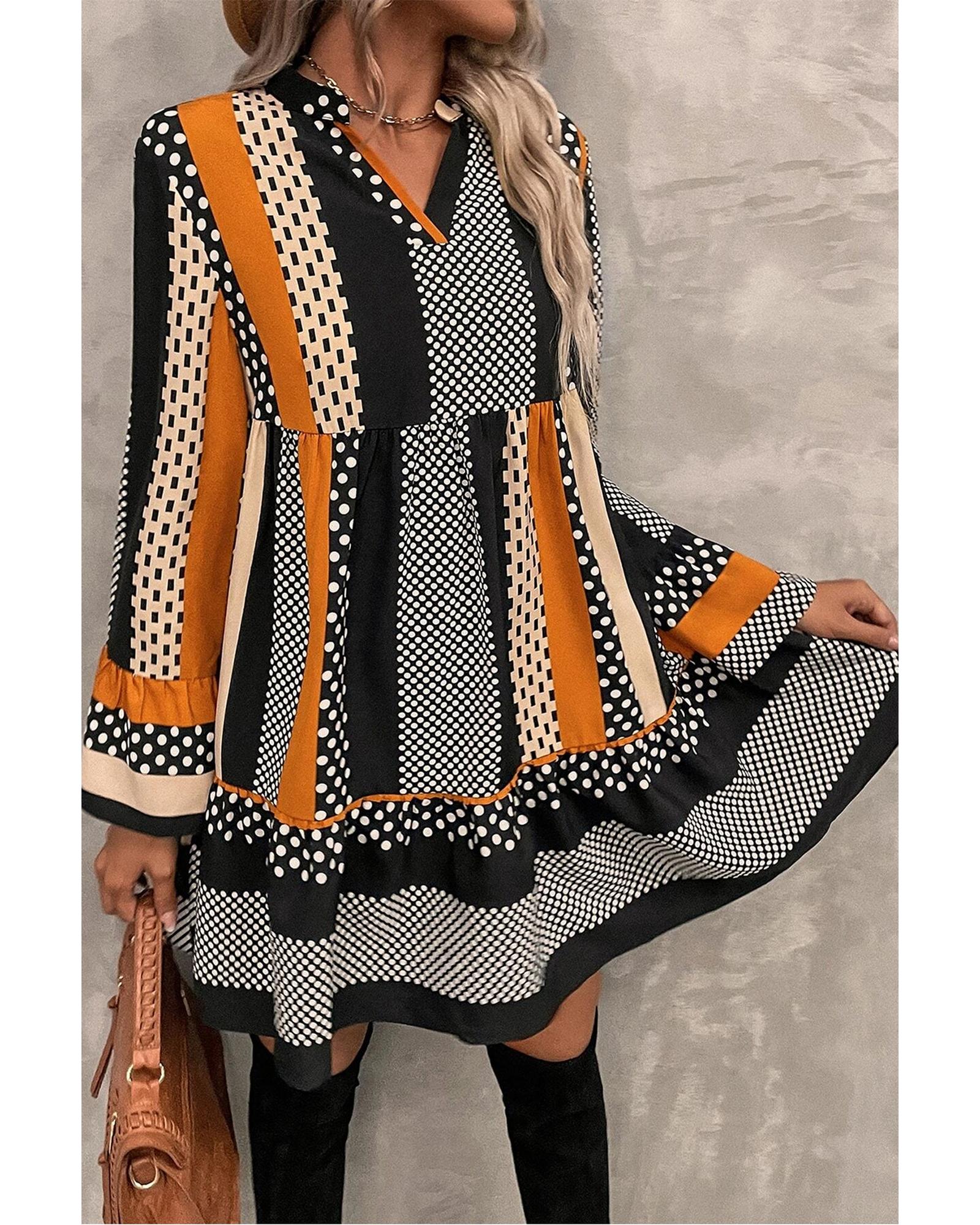 Black Striped Polka Dot Print Ruffled Hem V Neck Mini Dress – XL