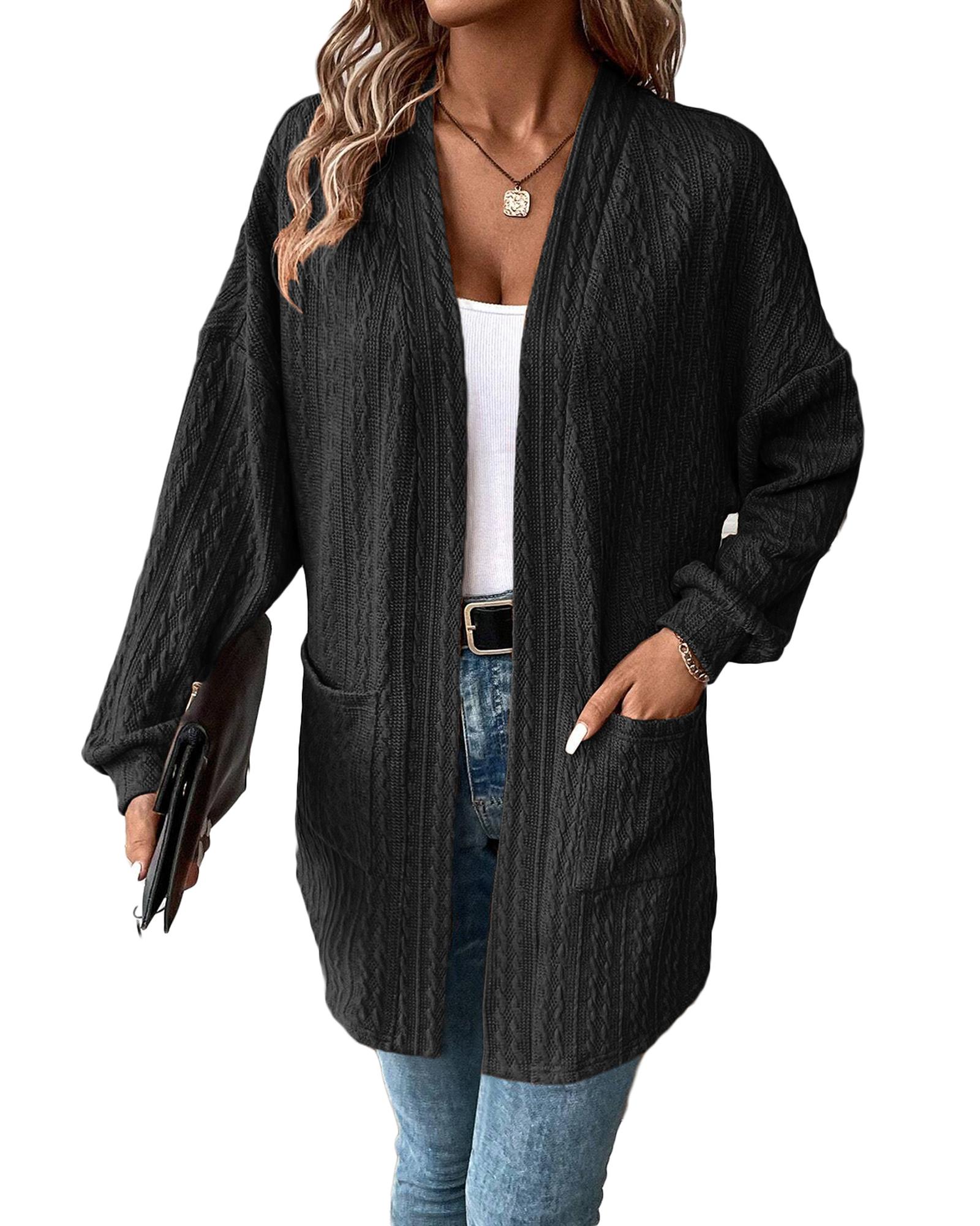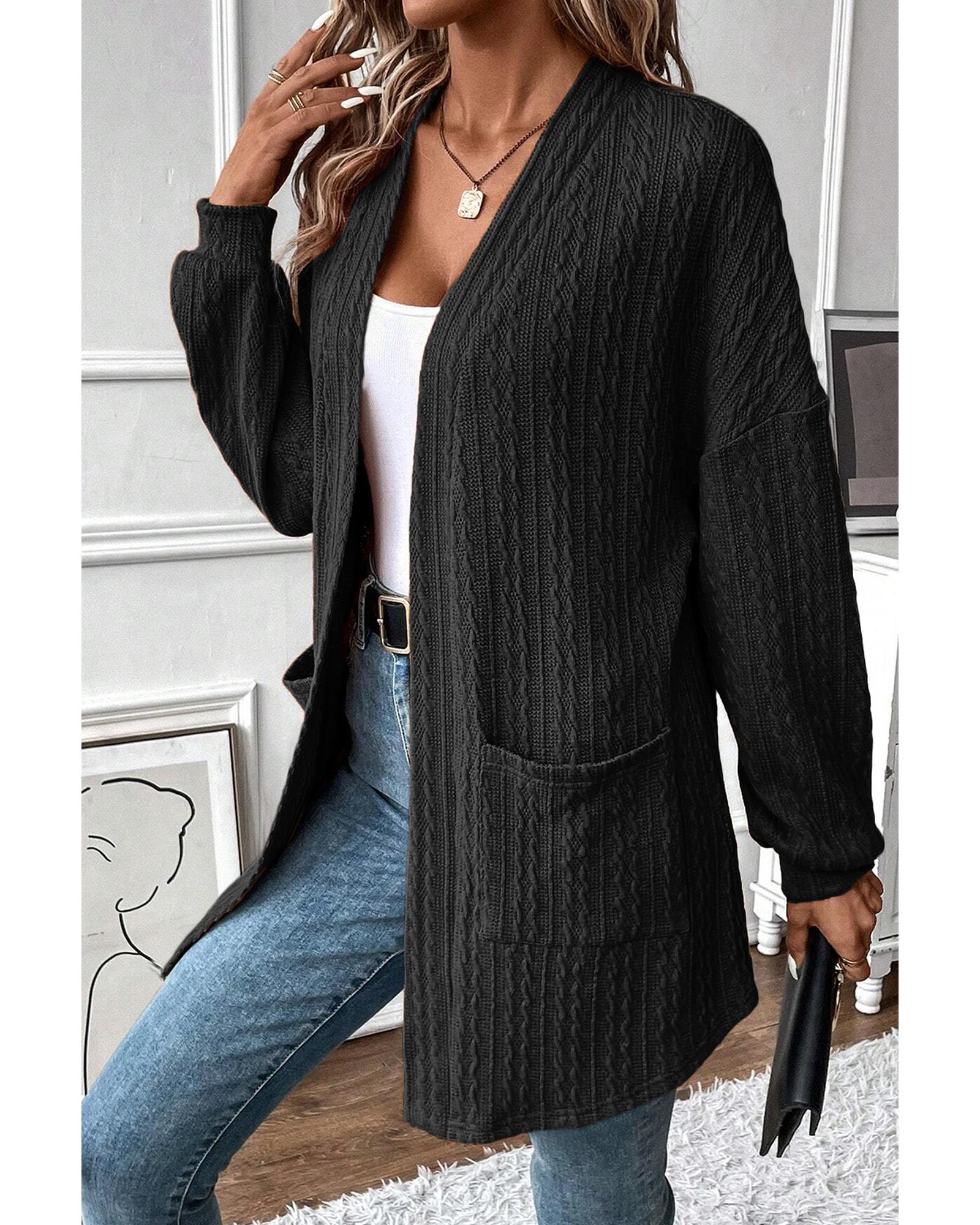 - Black Textured Knit Side Pockets Open Front Cardigan
