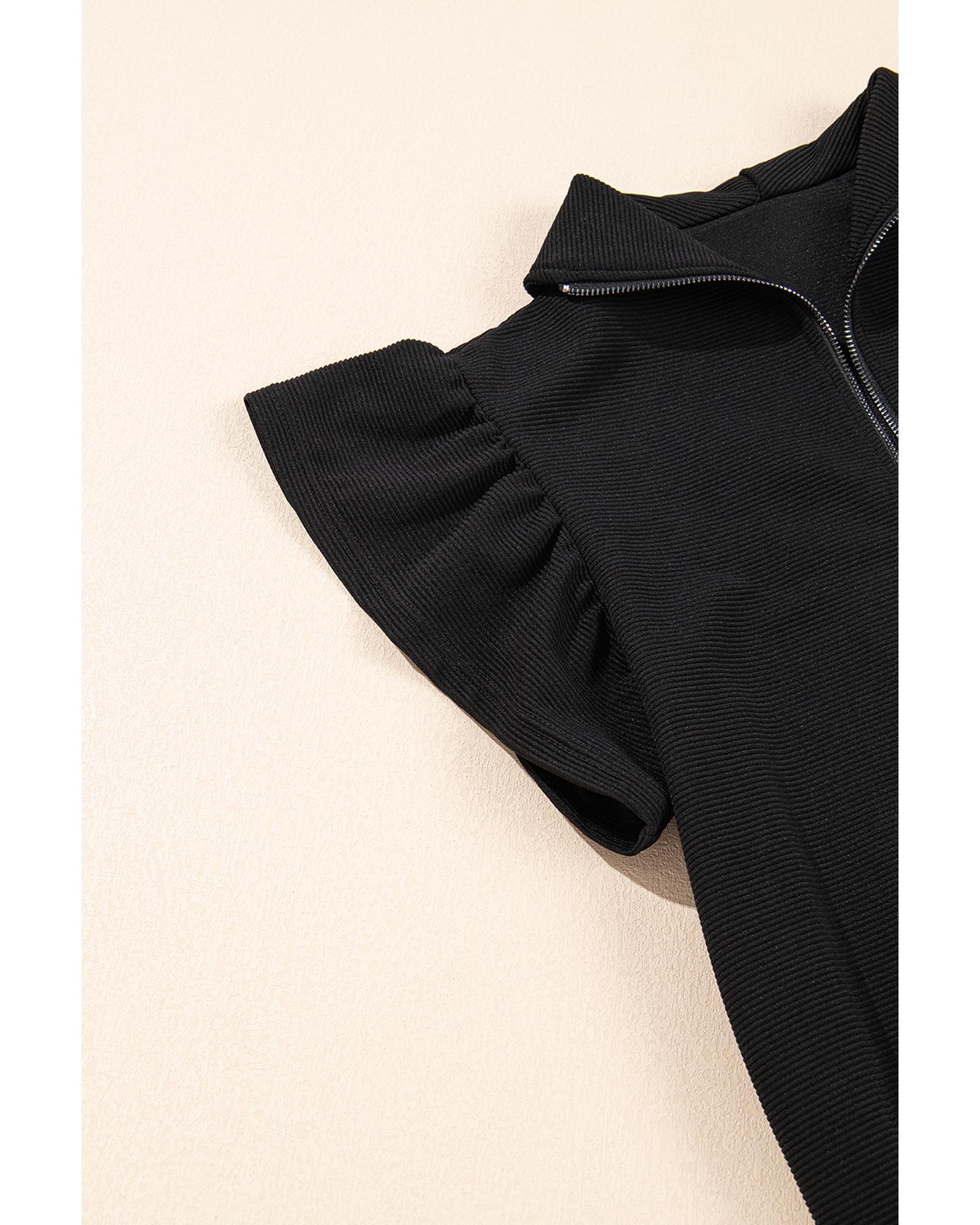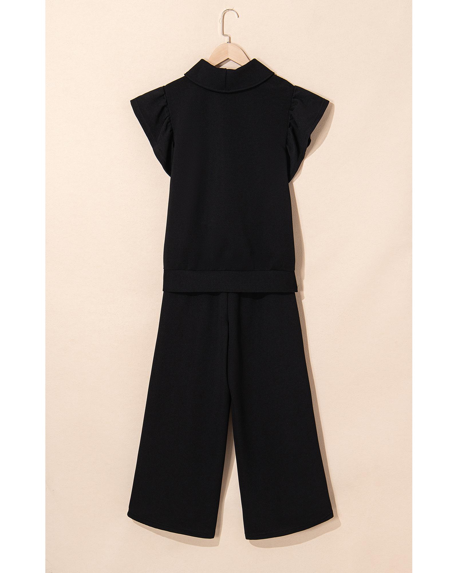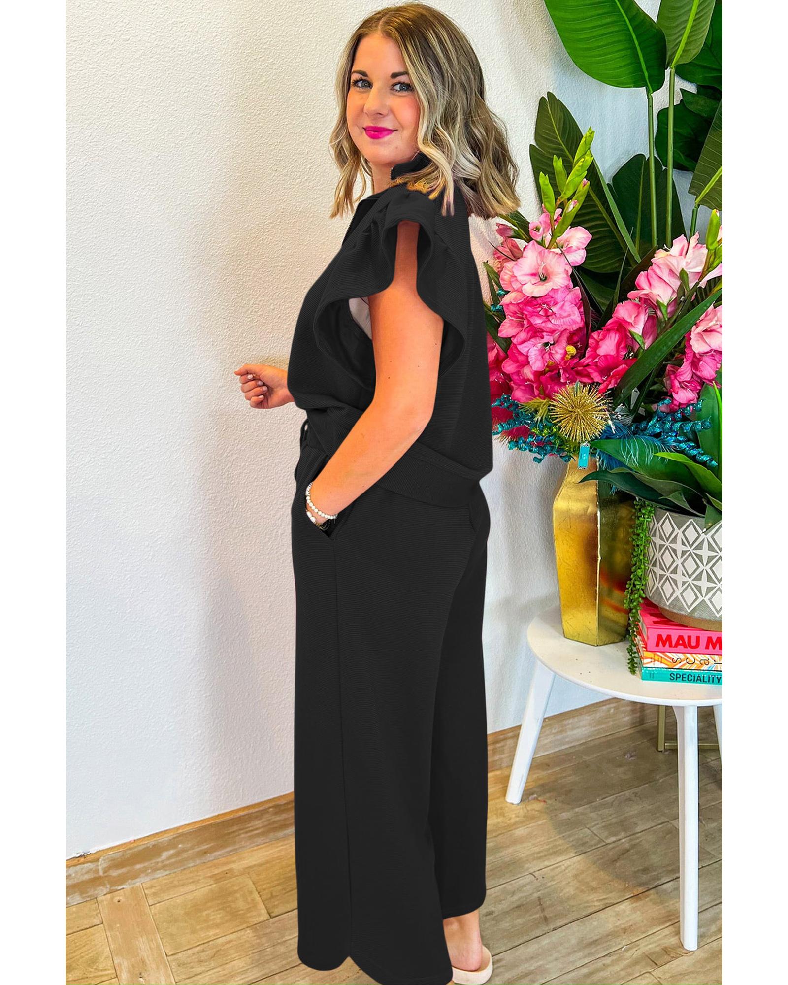 - Black Textured Ruffled Sleeve Zipped Top and Wide Leg Pants Set