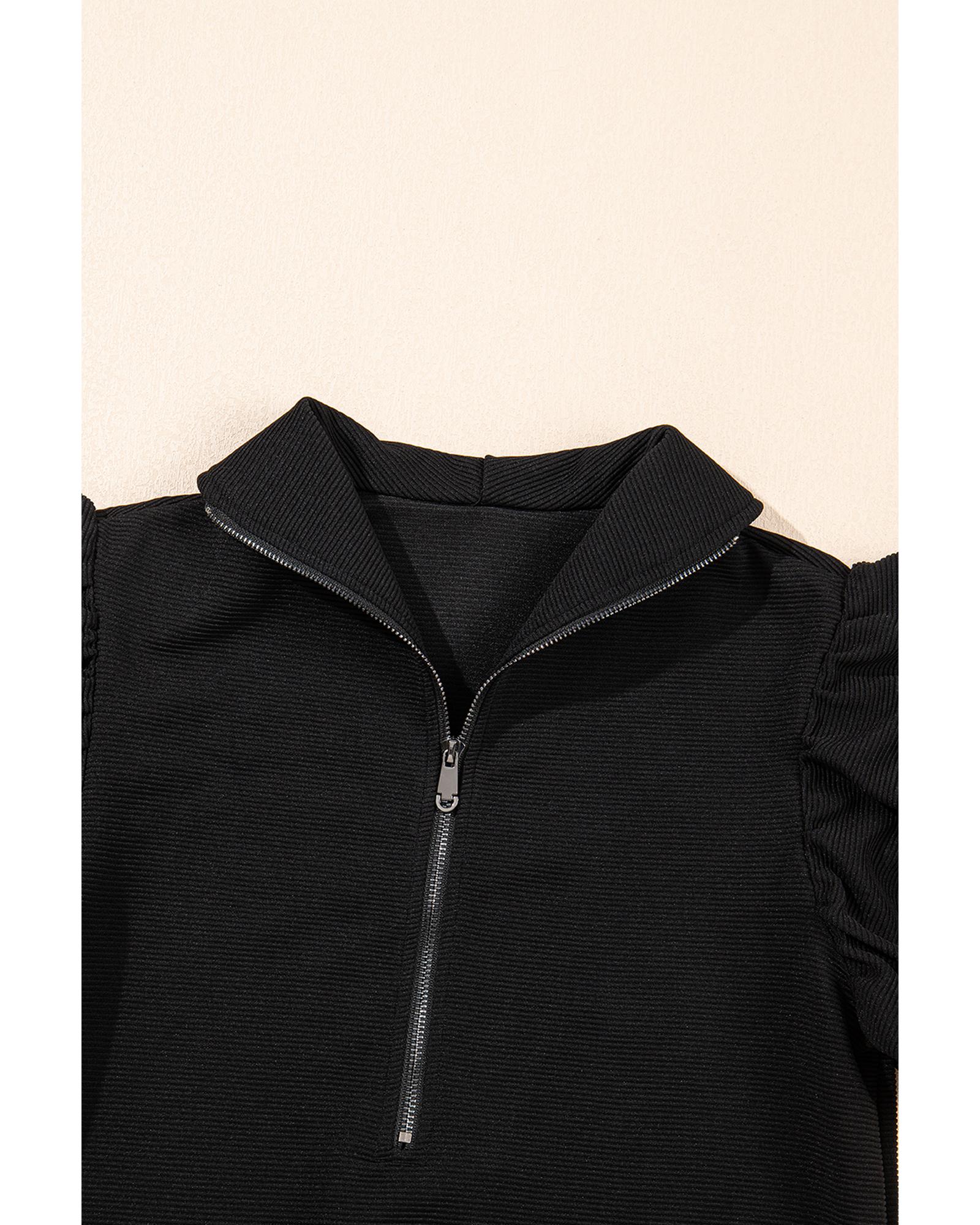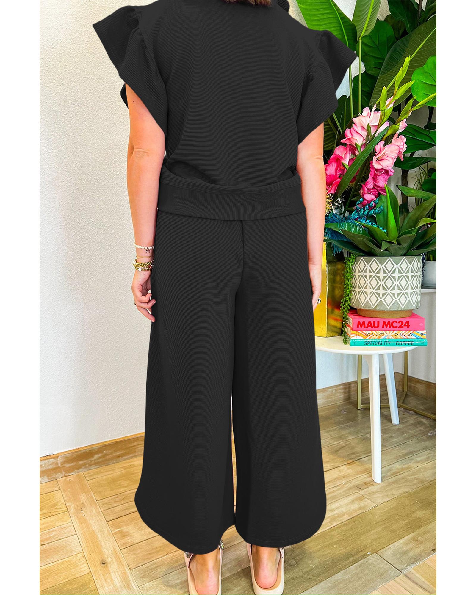 - Black Textured Ruffled Sleeve Zipped Top and Wide Leg Pants Set