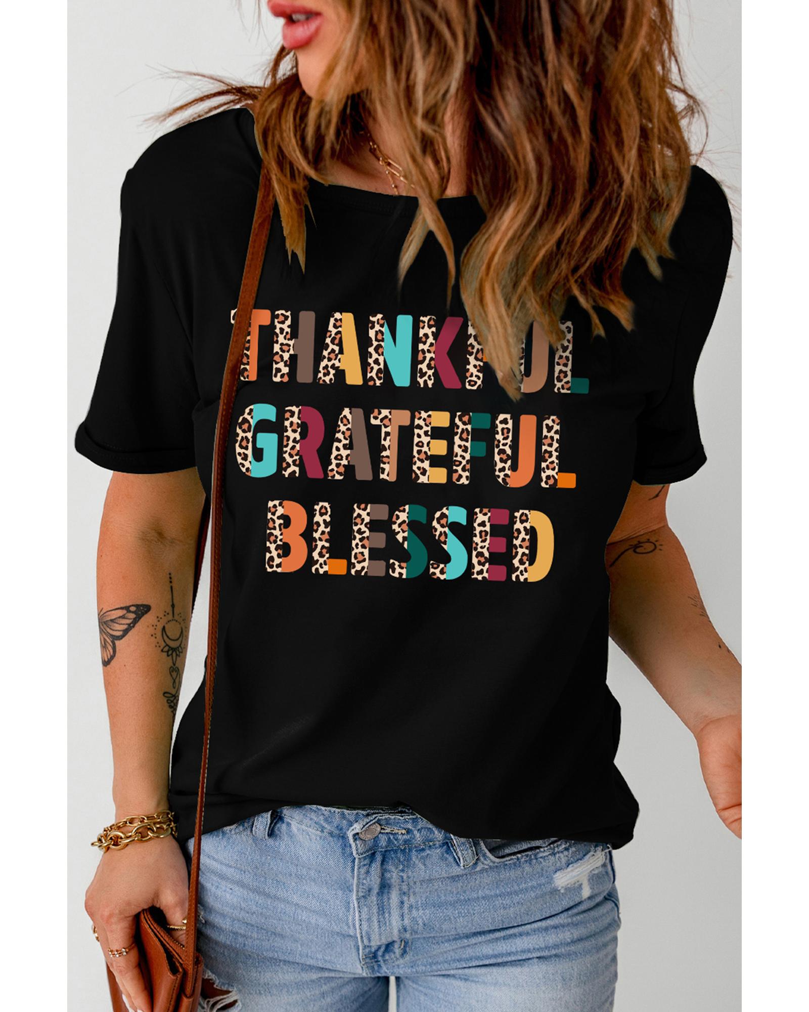 Black Thankful Grateful Blessed Leopard Print Crewneck T Shirt – L